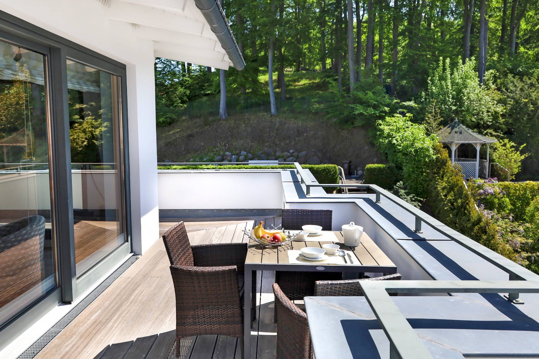 Gartenstühle Gartentisch Sonneninsel Strandkorb überdacht (teilweise) Waldblick