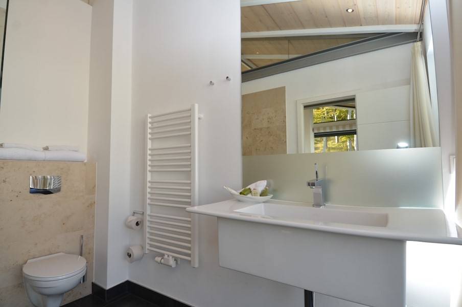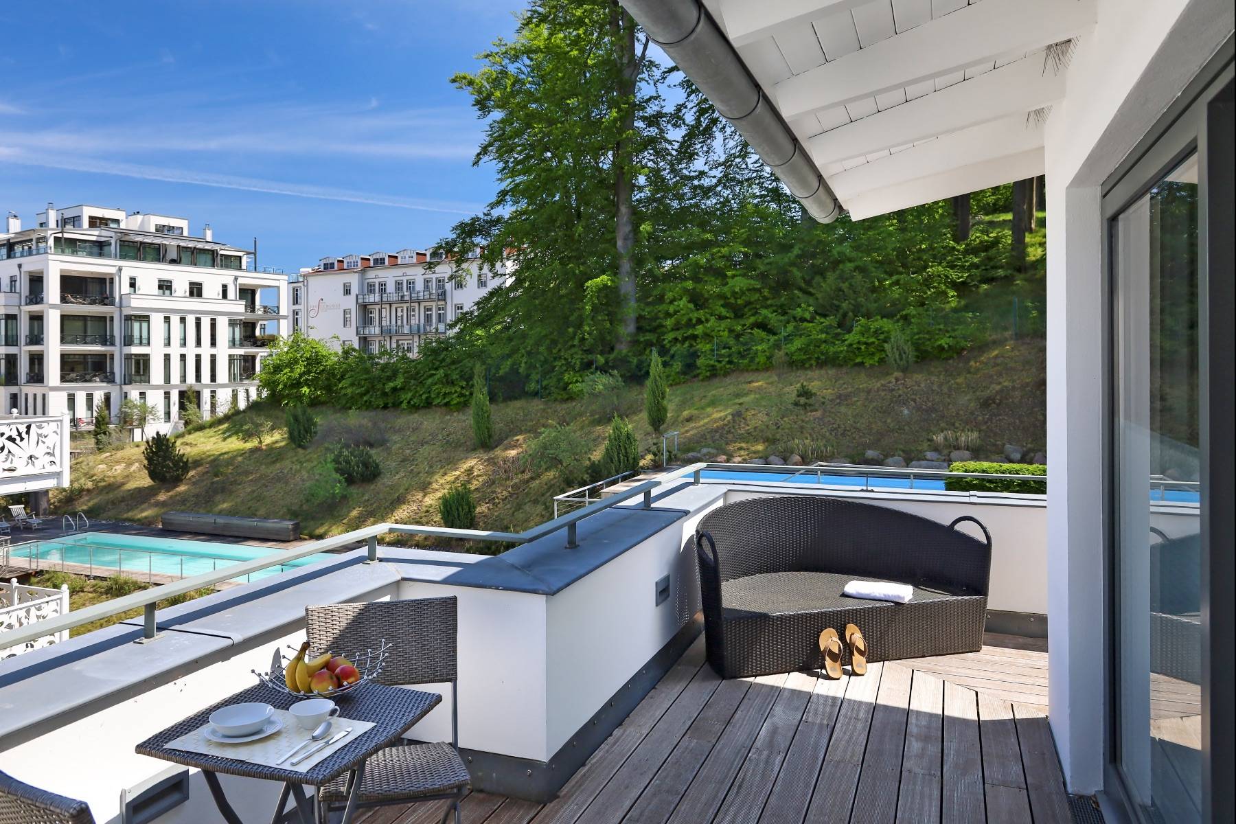 Traumhaft und idyllisch ist der Ausblick von hier oben in den Garten und den hauseigenen Pool und den angrenzenden Waldpark.