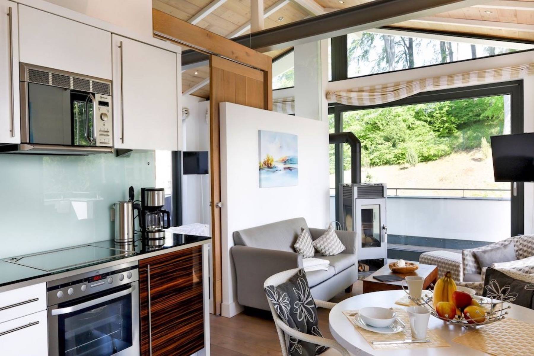 Die überdurchschnittlich hohe Raumhöhe – umrahmt von bodentiefen Fensterelementen – lassen unendlich viele Sonnenstrahlen in das exklusive Domizil eindringen. Auch an kühleren Tagen ist das Penthouse Paulus in Sellin dank Fußbodenheizung und Kamin für gemütliche Stunden und ausgedehnte Abende ein wahres Kuschelnest.