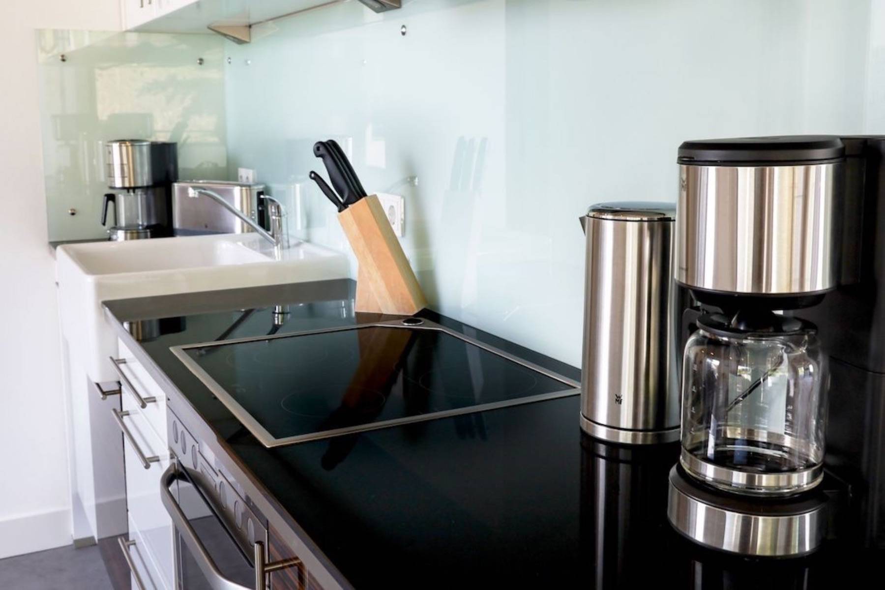 Backofen Balkonzugang Cerankochfeld Dunstabzug Esstisch Fenster Fußbodenheizung Gefrierfach Geschirr/ Besteck Geschirrspülmaschine Kaffeemaschine Siemens Küchenutensilien Kühlschrank Mikrowelle Pfannen Stühle Terrassenzugang Toaster Töpfe Vorhänge Waldblick Wasserkocher Siemens
