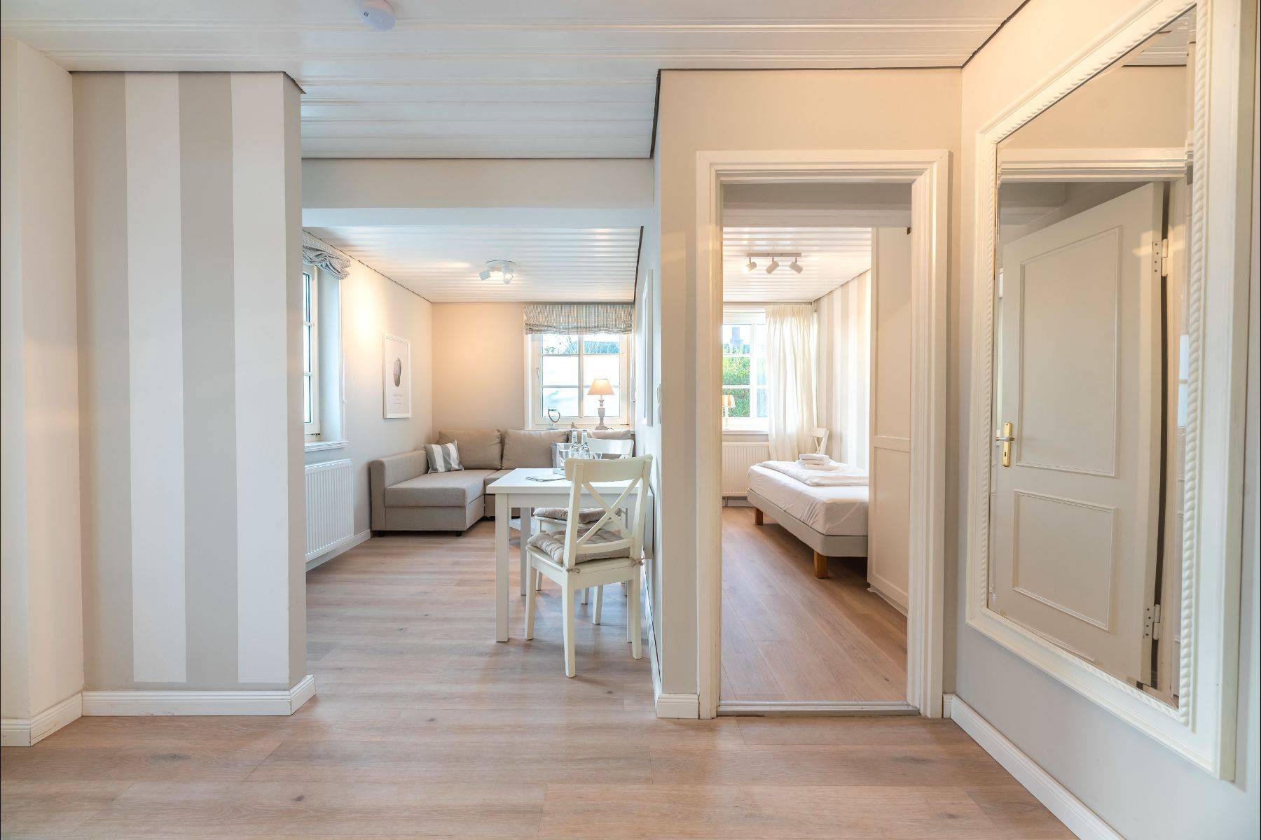 Dieses schöne Appartment verfügt über ein Elternschlafzimmer und ein Kinderschlafzimmer mit Einzelbett. Das Wohnzimmer ist mit einem Schlafsofa ausgestattet. Diese wunderschöne Ferienwohnung wurde 2022 von Grund auf saniert und mit tollen Extras wie USB/ USB Mini Steckdosen an jedem Nachttisch, integriertem Radio im Badezimmer, hochwertigen original Tempur-Matratzen ausgestattet, um Ihnen eine wunderbare Auszeit und die bestmögliche Entspannung bieten zu können. Direkt vor dieser Wohnung befindet sich ihre eigene Terrasse mit zartgrau gehaltenen Terrassenmöbeln und dem wohl besten Bäcker direkt gegenüber.