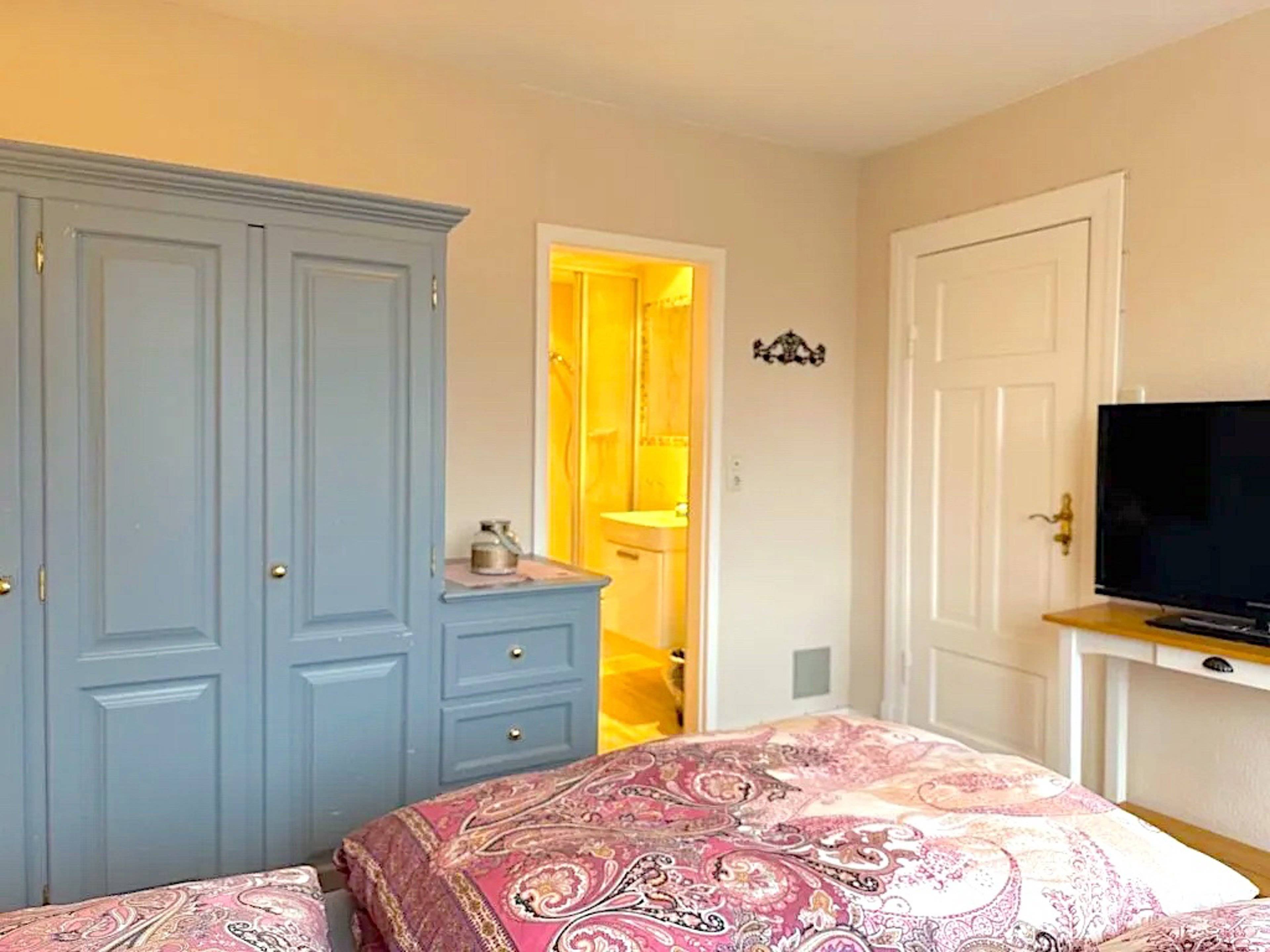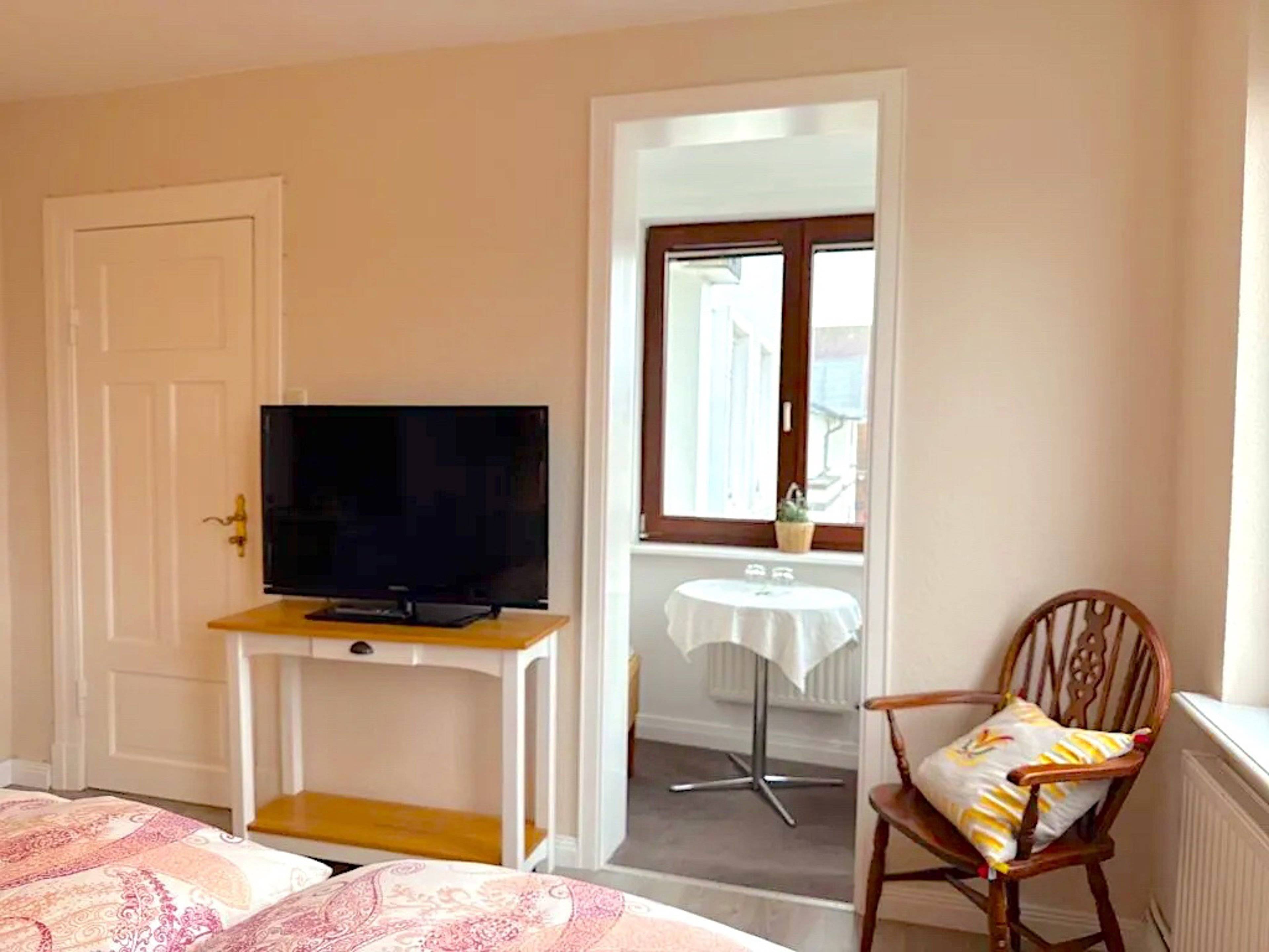 Bettwäsche Doppelbett Fenster Flatscreen Heizung Kleiderschrank Plissees Rauchmelder Stuhl