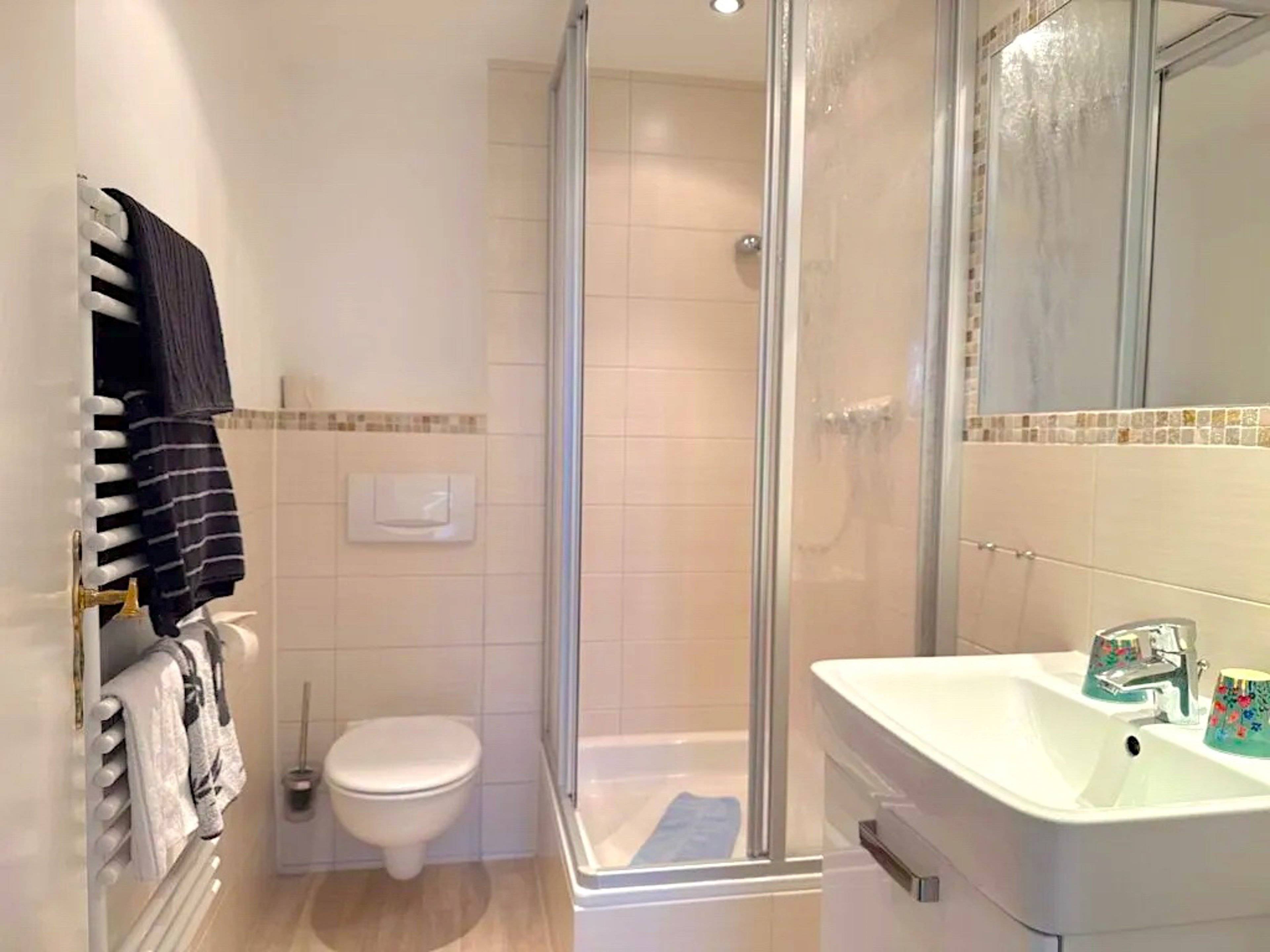 Badetuch Dusche Haartrockner Handtuch Handtuchheizkörper Heizung Spiegel Waschbecken WC