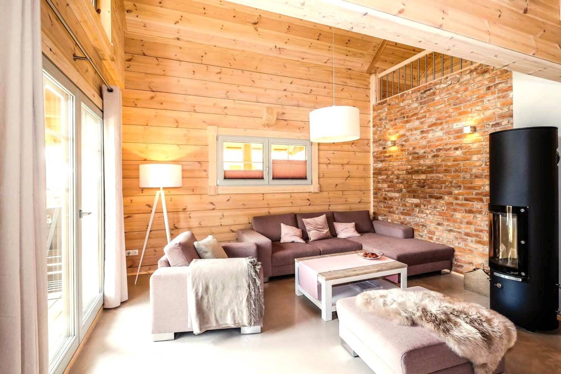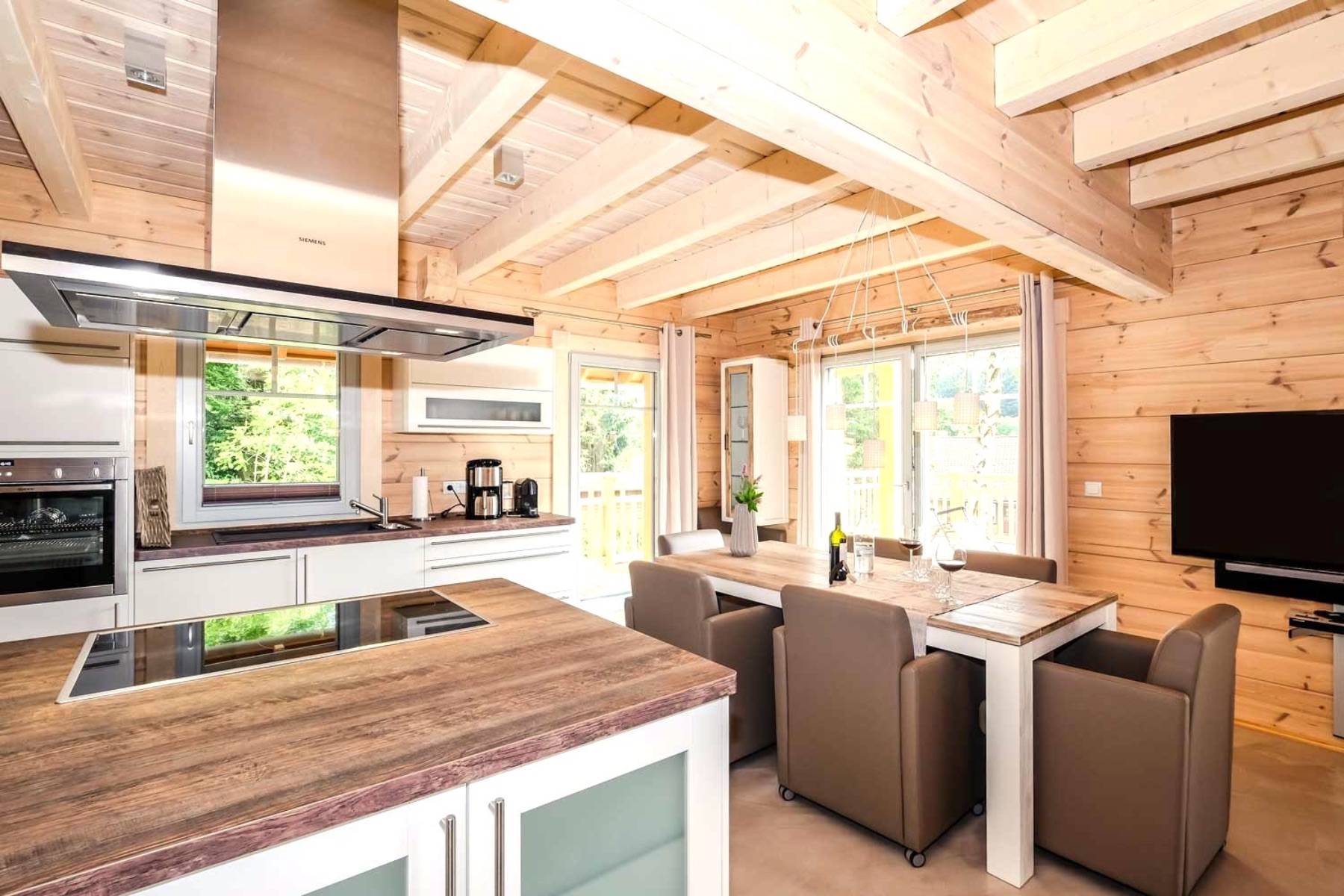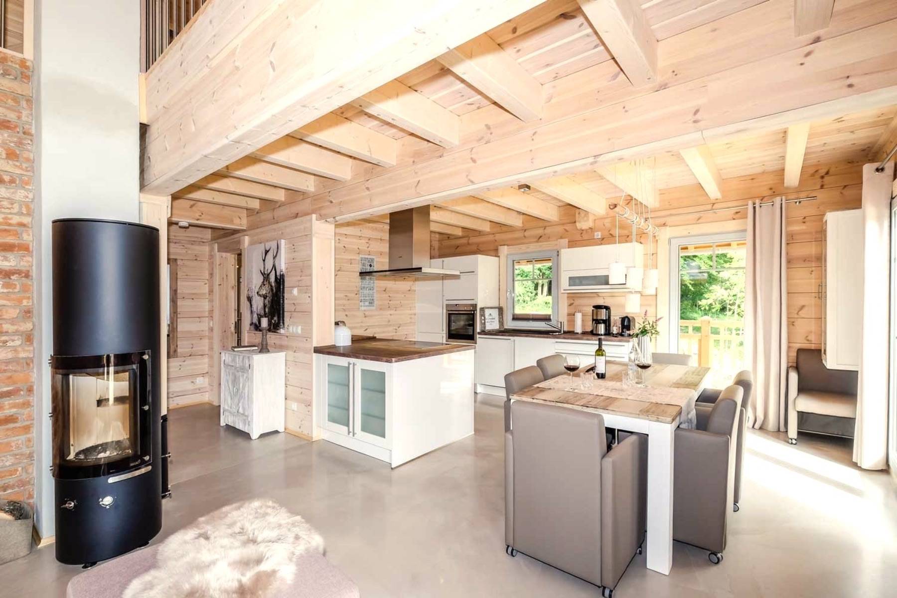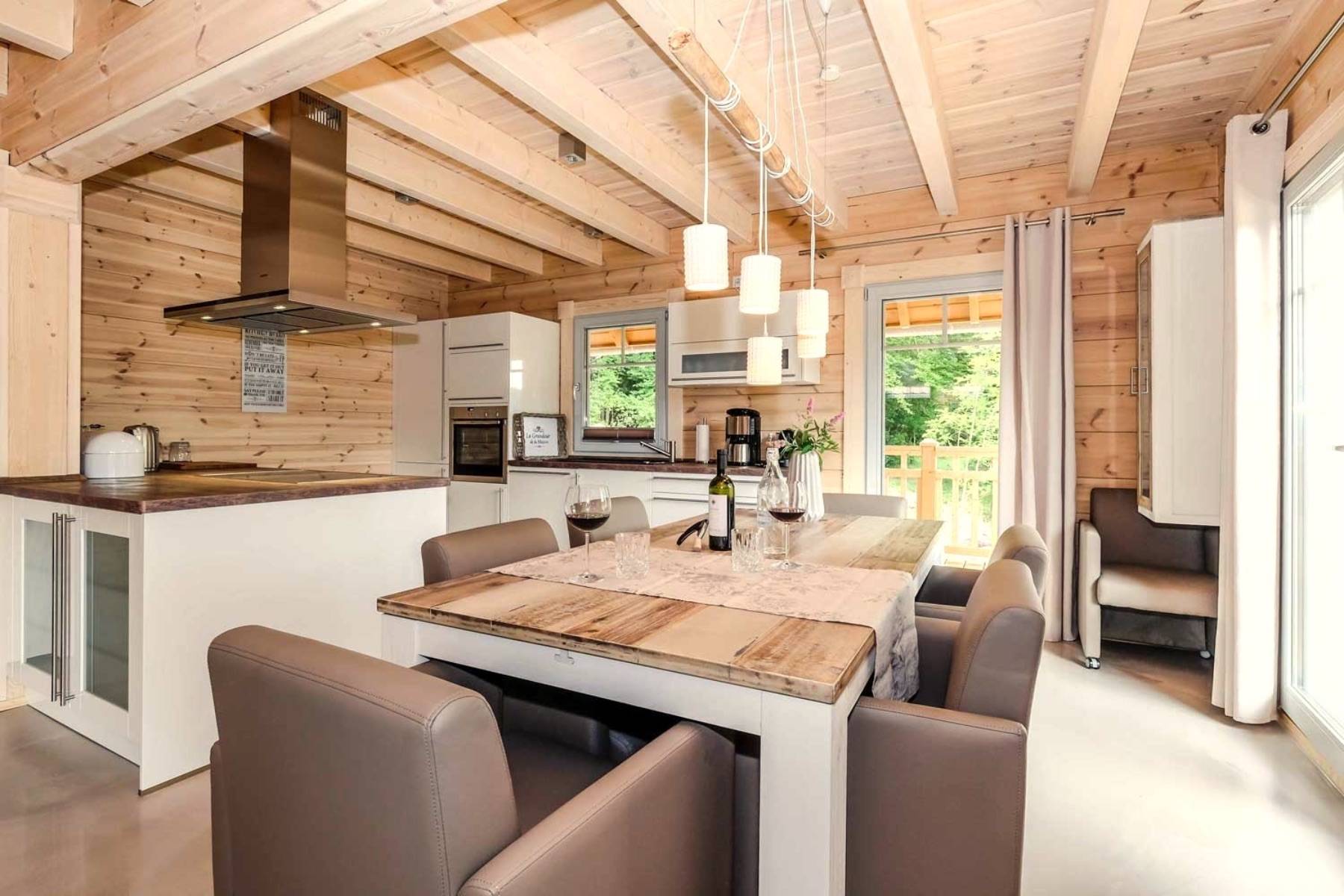 Das exklusive Blockhaus in traumhafter Hanglage besticht durch eine luxuriöse Ausstattung im angesagten Stilmix. Höchster Komfort: Sauna, 2 Bäder, Ofen, großer Terrasse u. Inselküche