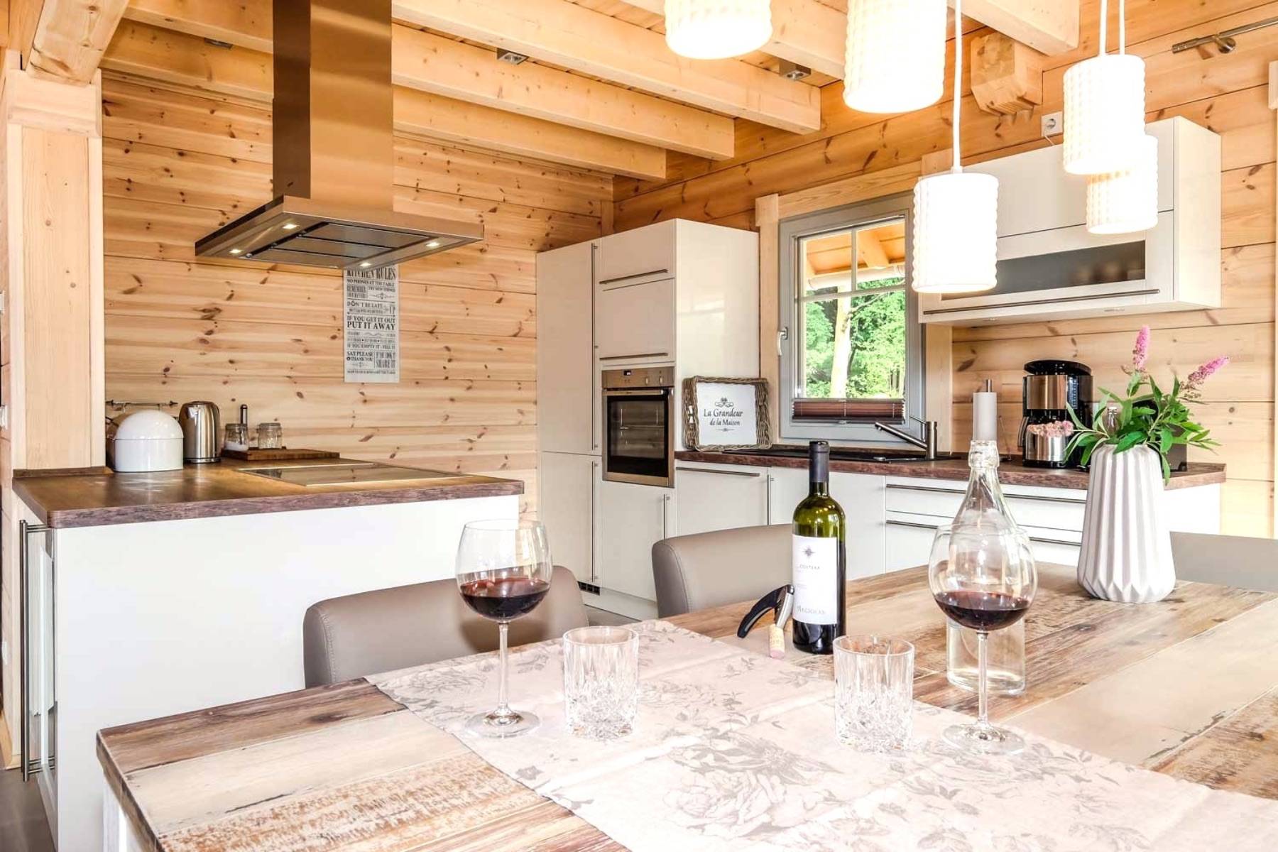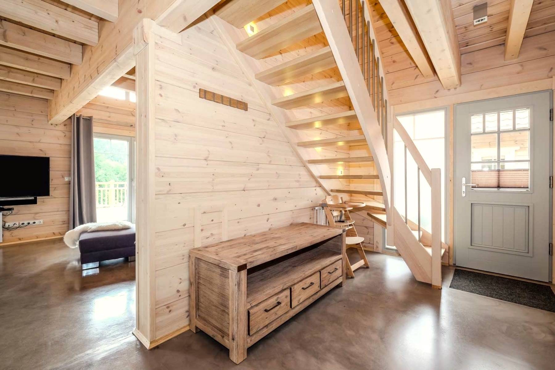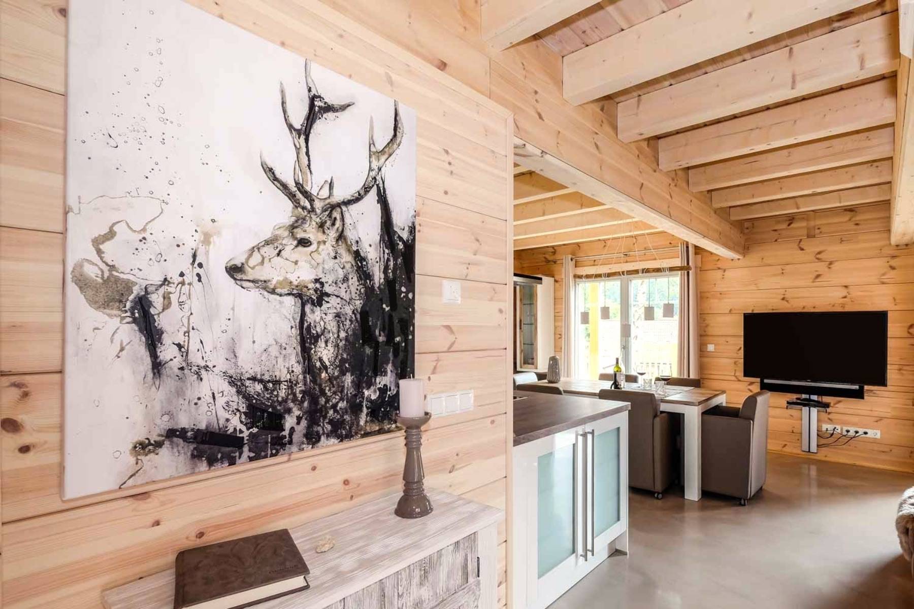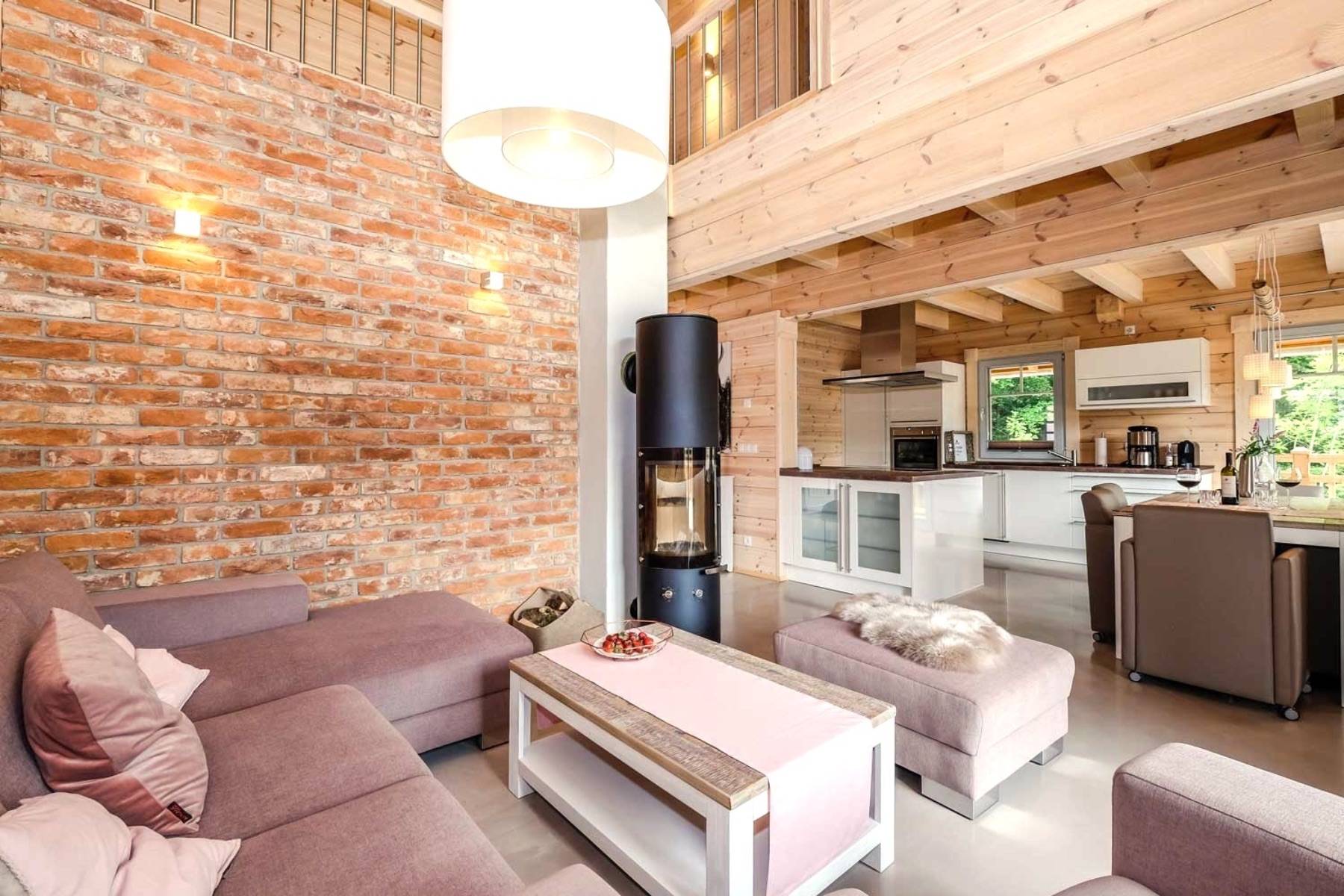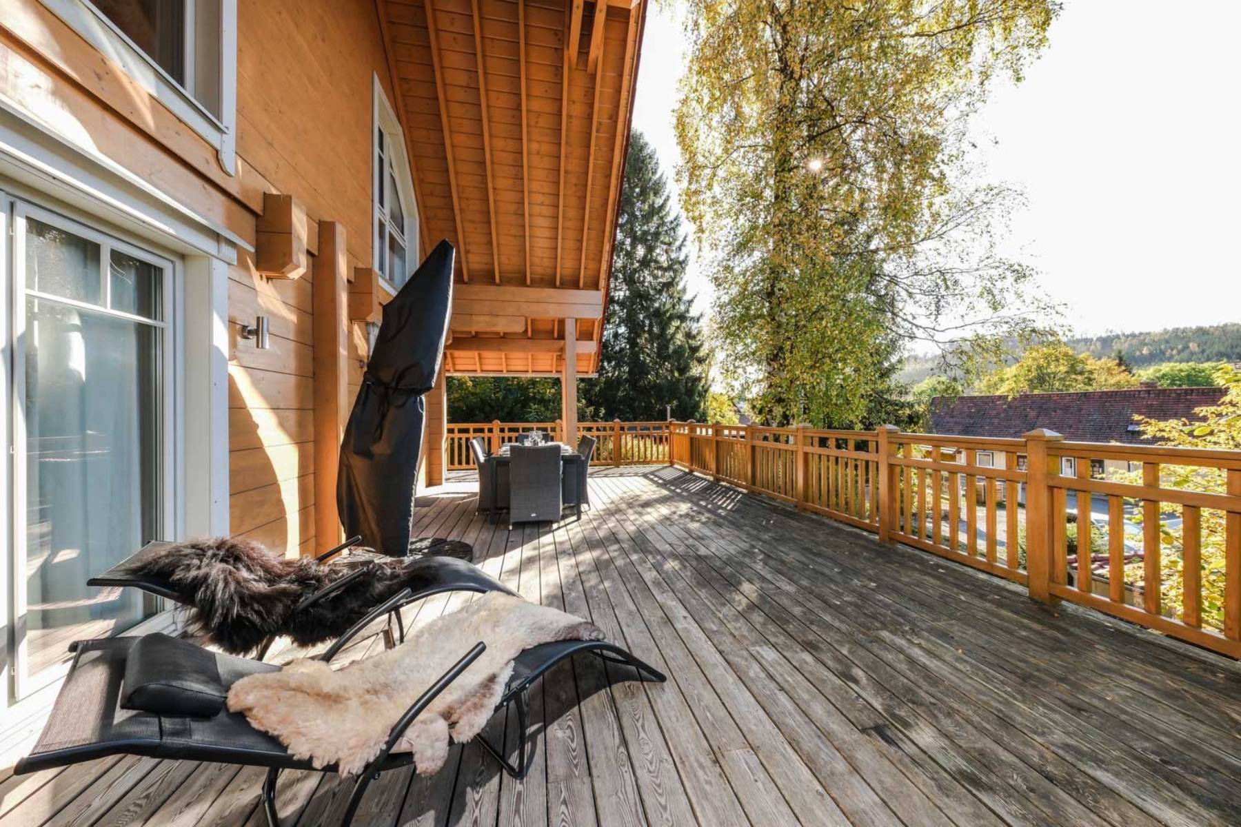 Das exklusive Blockhaus in traumhafter Hanglage besticht durch eine luxuriöse Ausstattung im angesagten Stilmix. Höchster Komfort: Sauna, 2 Bäder, Ofen, großer Terrasse u. Inselküche