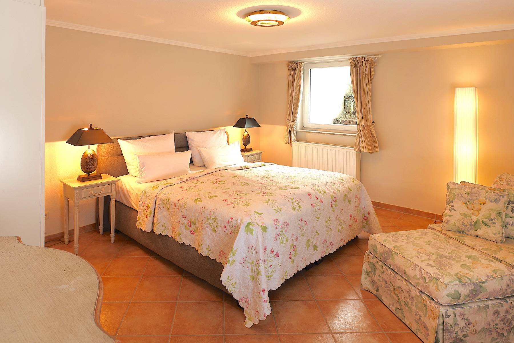 Bereits beim Betreten der Wohnung wird man von einem angenehmen, mediterranen Wohlfühlambiente überrannt. Gemütliche Polstermöbel laden zum verweilen ein, die Sonnenstrahlen locken einen auf die Südterrasse, auf der ein Strandkorb und Gartenmöbel warten. In dem großen Schlafzimmer im Untergeschoss mit Boxspringbett und Flachbildschirm kann man auch in heißen Sommernächten gut übernachten. Ein helles und modernes Duschbad mit hochwertigen Sanitärobjekten befindet sich ebenso auf dieser Ebene. Für eine dritte Person besteht die Möglichkeit, auf dem komfortablen Schlafsofa zu schlafen.