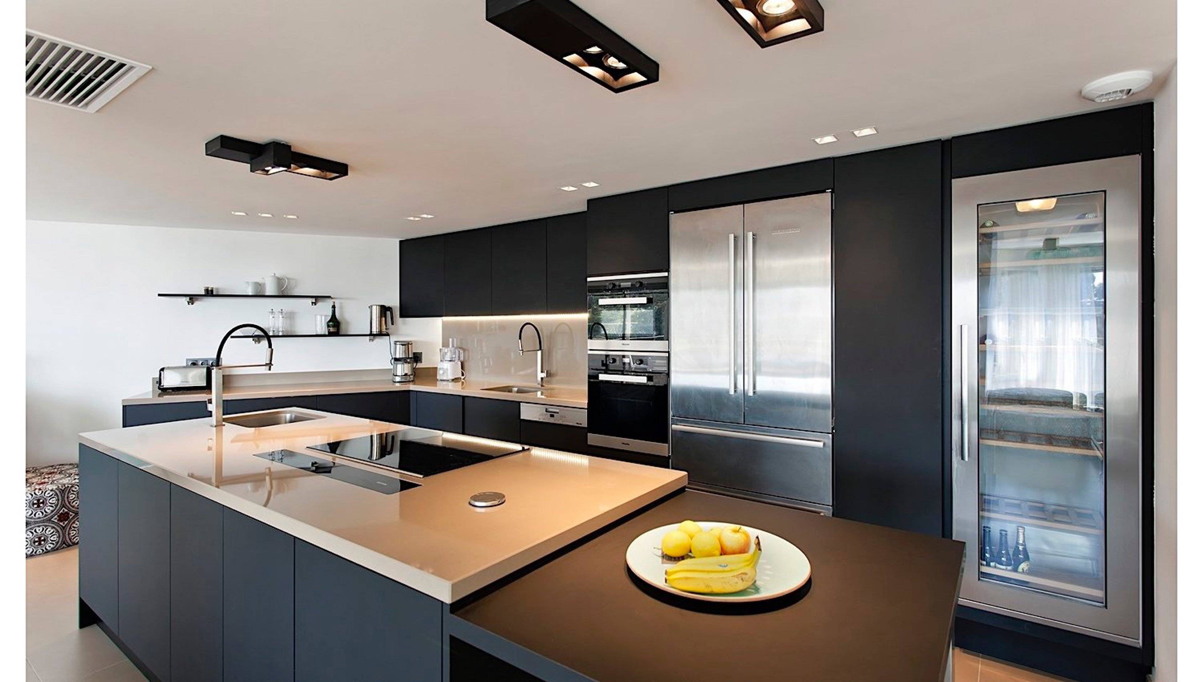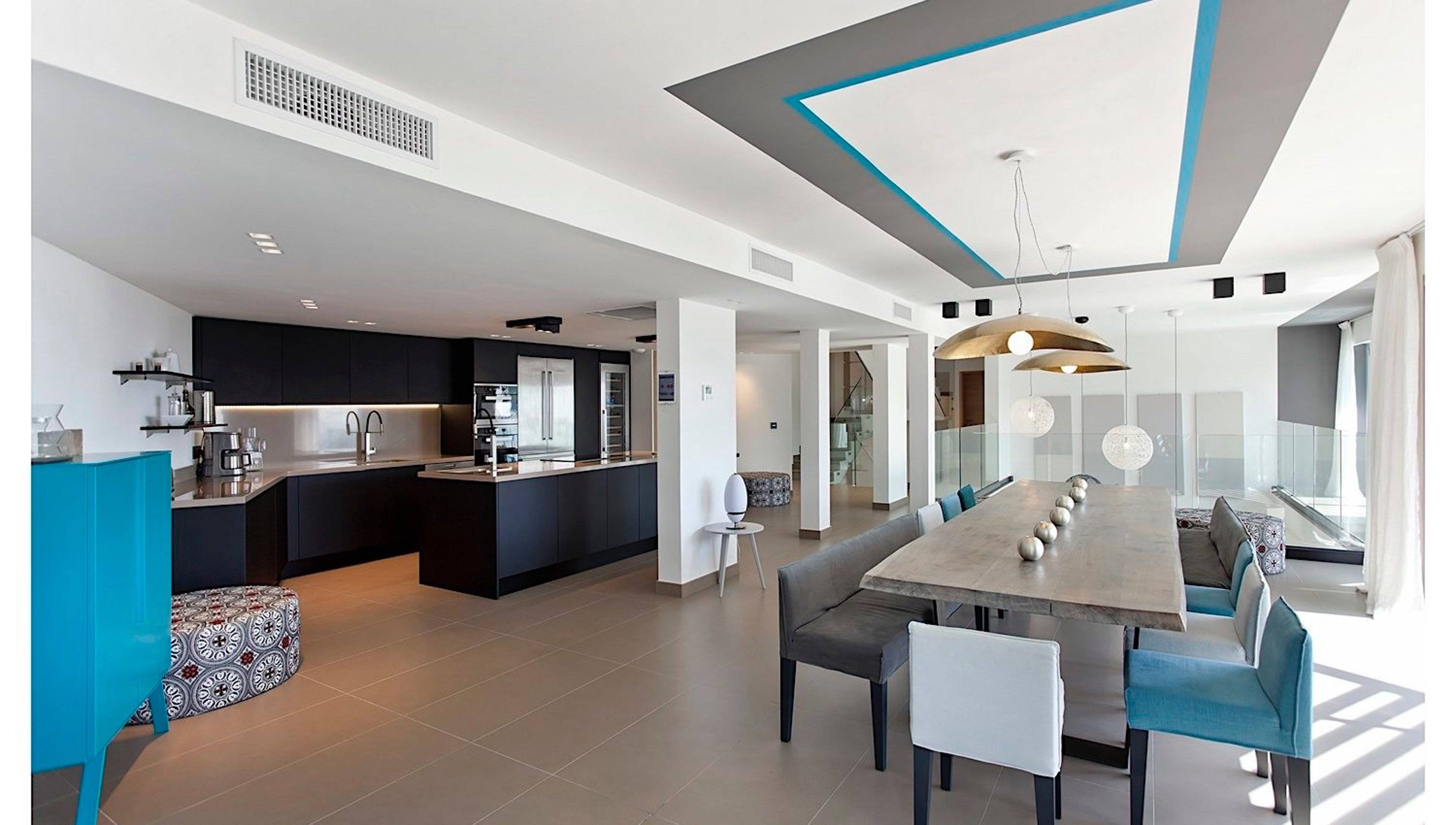 Auch das schöne große Esszimmer mit Tisch für 14 Personen und eine luxuriöse voll ausgestattete offene Küche sowie ein Wohn- / Entspannungsbereich, alle mit Meerblick und Zugang zu einer großen Terrasse mit Essbereich für mindestens 10 Personen, einem Grill und einem komfortablen Sitzbereich.