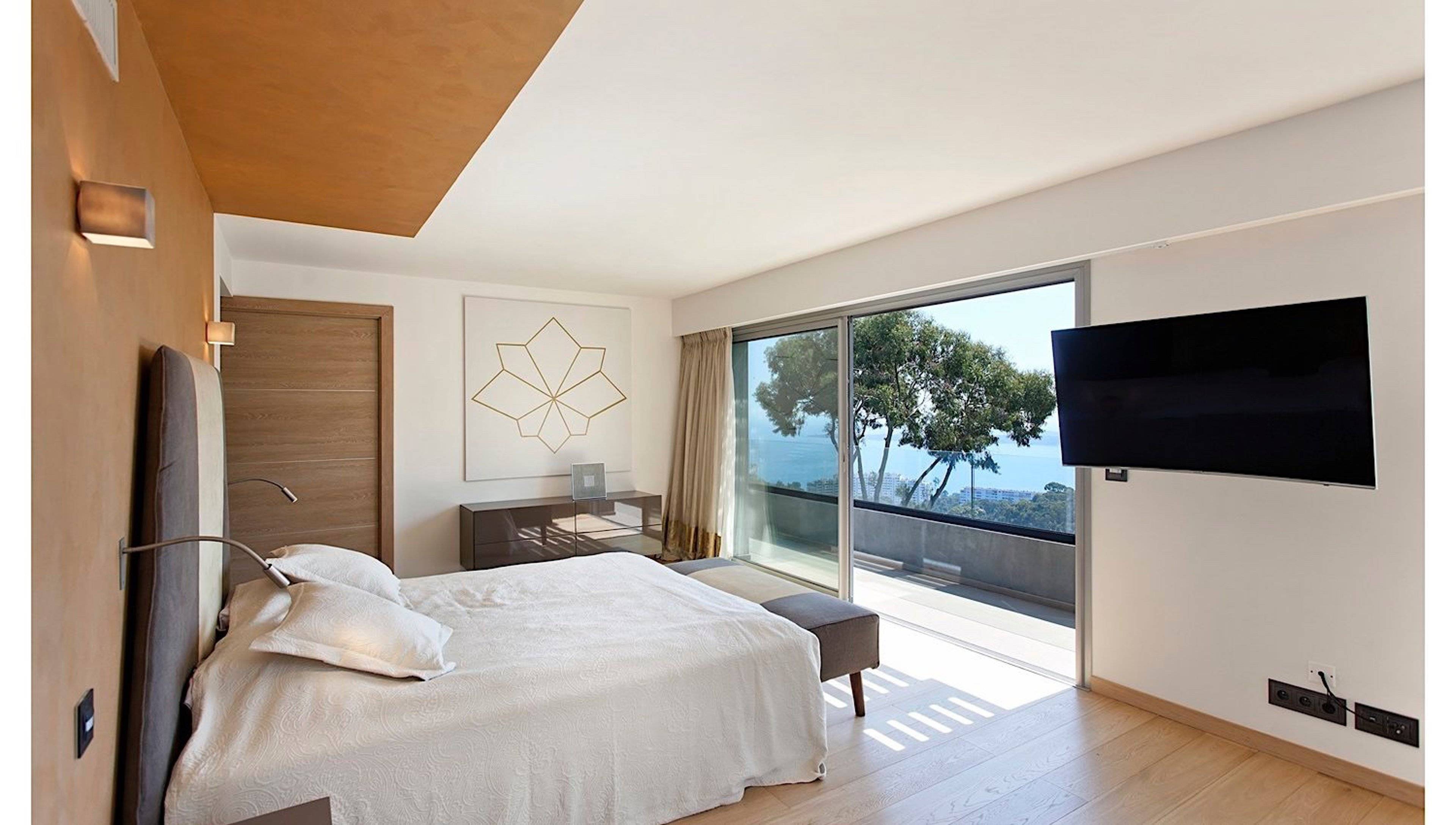 Großes und sehr stilvoll eingerichtetes Hauptschlafzimmer (Kingsize-Bett 160 cm breit) mit deckenhohen Fenstern und Schiebetüren, die auf eine private Terrasse mit herrlichem Blick auf die Küste und das Meer führen, ein großes Ankleidezimmer / begehbarer Kleiderschrank, a geräumiges Badezimmer mit separater Badewanne und Dusche und WC, Fernseher und Klimaanlage.