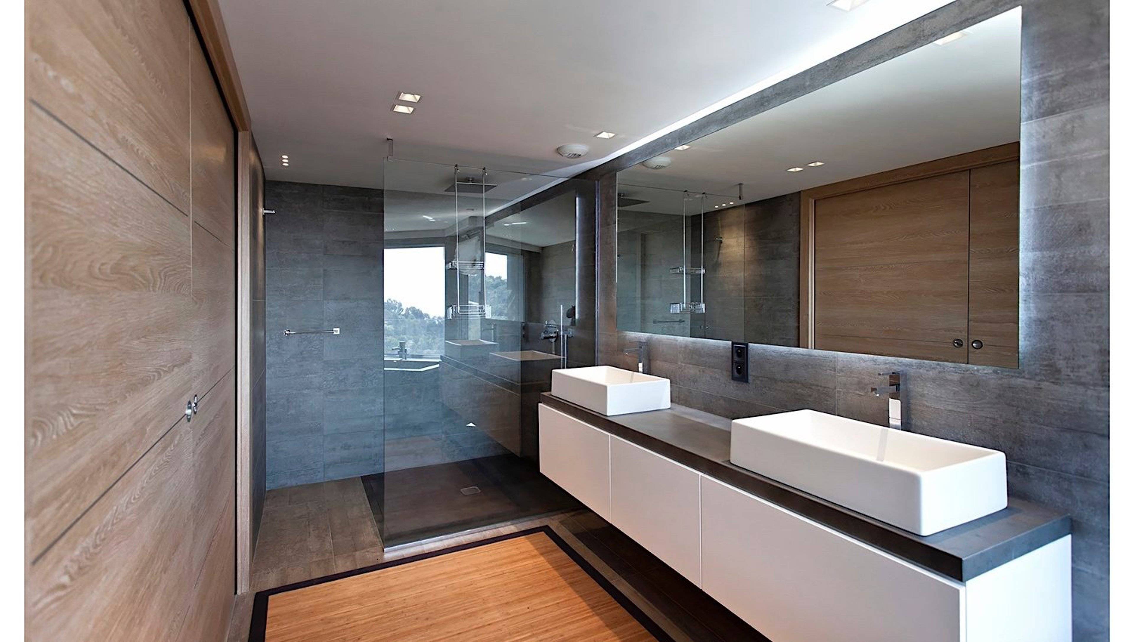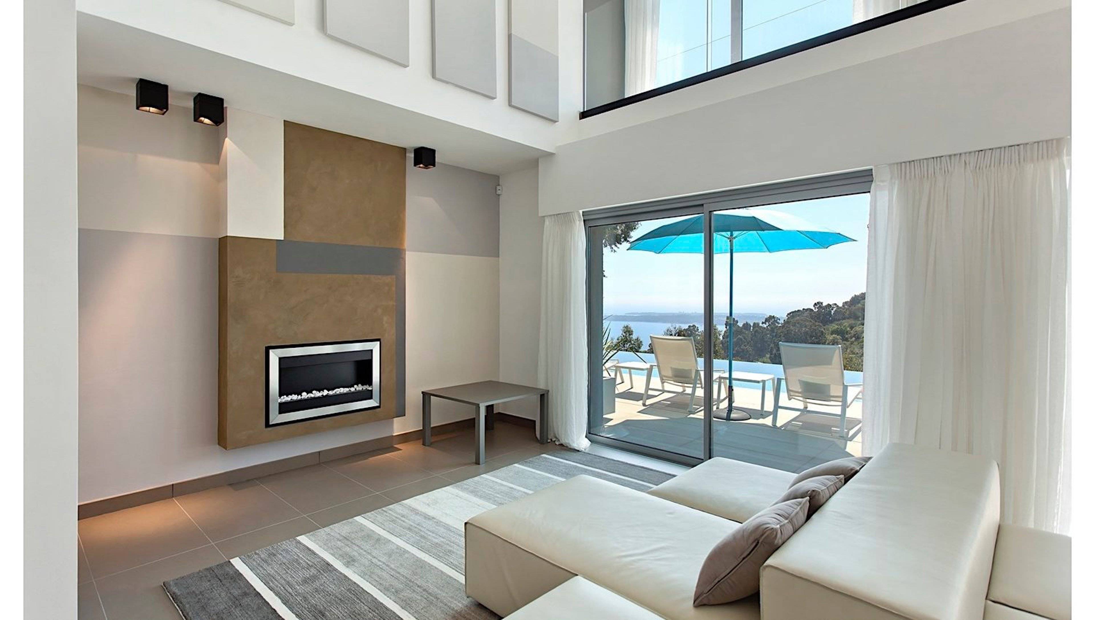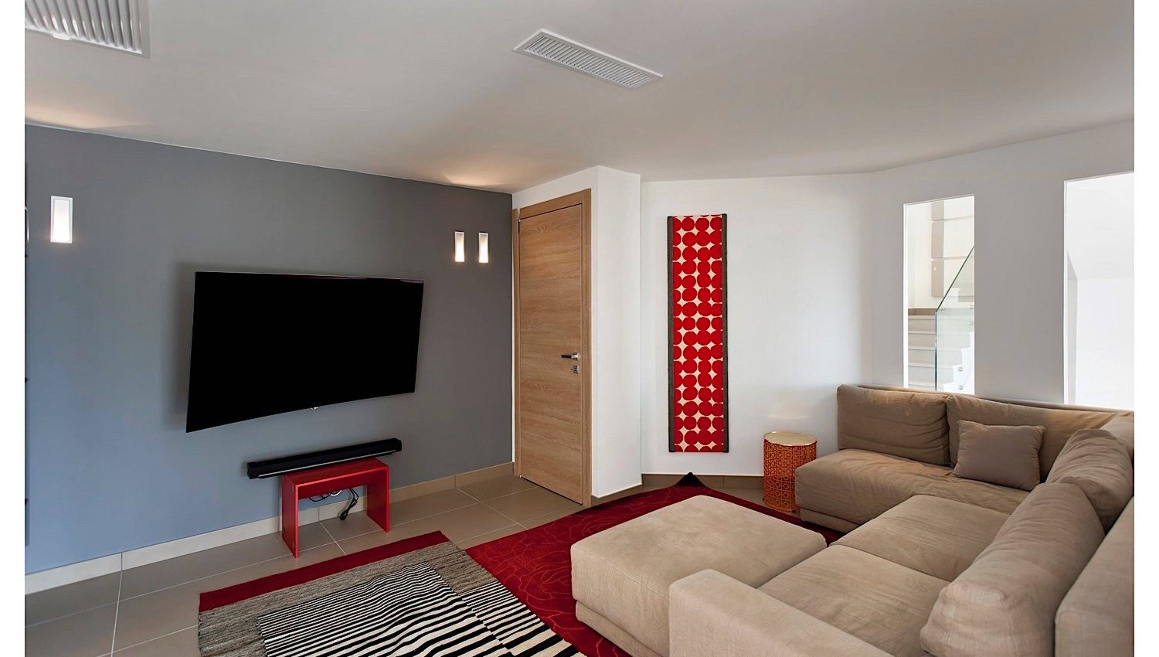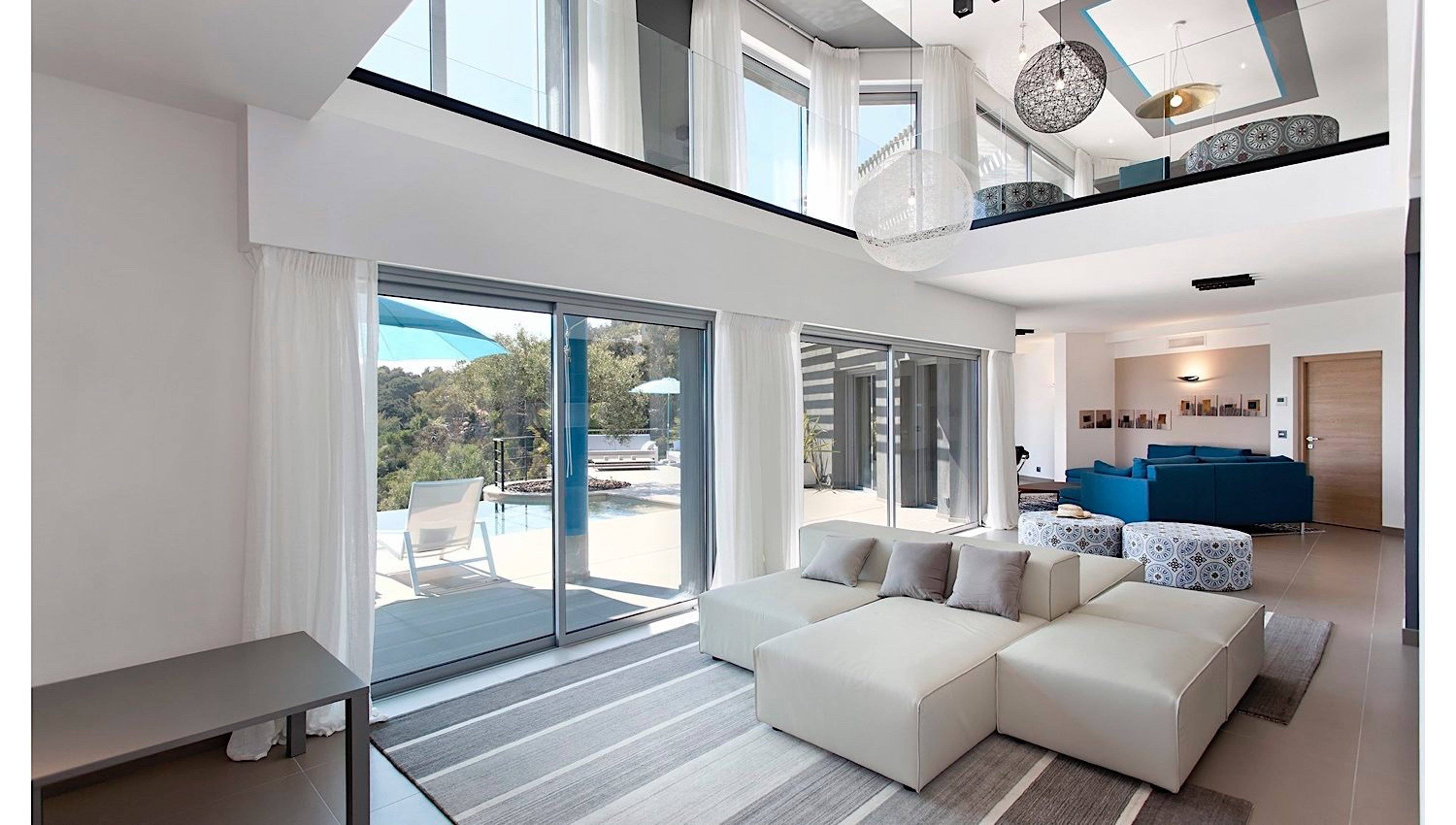 Hier finden Sie zwei Wohnzimmer mit einem Wohnbereich und Gaskamin und einem modern eingerichteten Sitzbereich mit zwei geräumigen Sofas: Das Interieur ist modern / mit hellen Sandfarben gestaltet und mit blauen Akzenten durchsetzt, was das mediterrane Gefühl der Villa weiter verstärkt. Auf dieser Etage befinden sich auch separate (Gast-) Toiletten, ein Heimkino, eine Bar und ein Wasch- / Trockenraum.