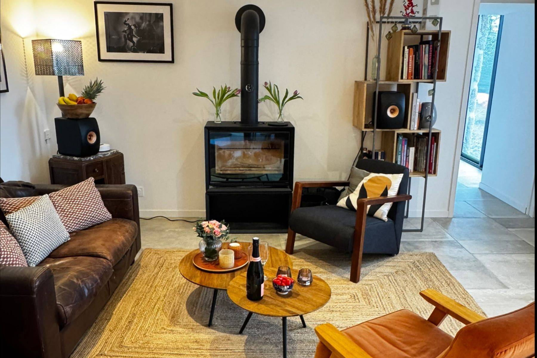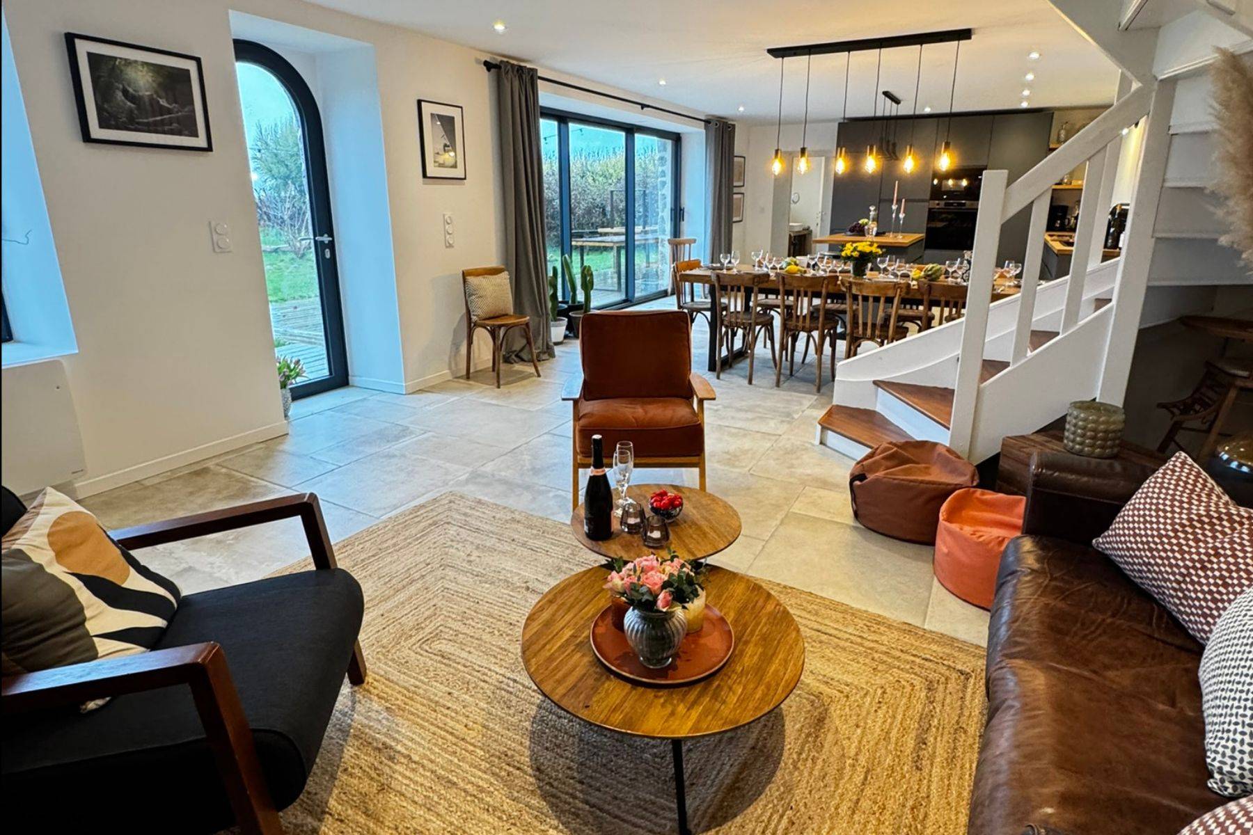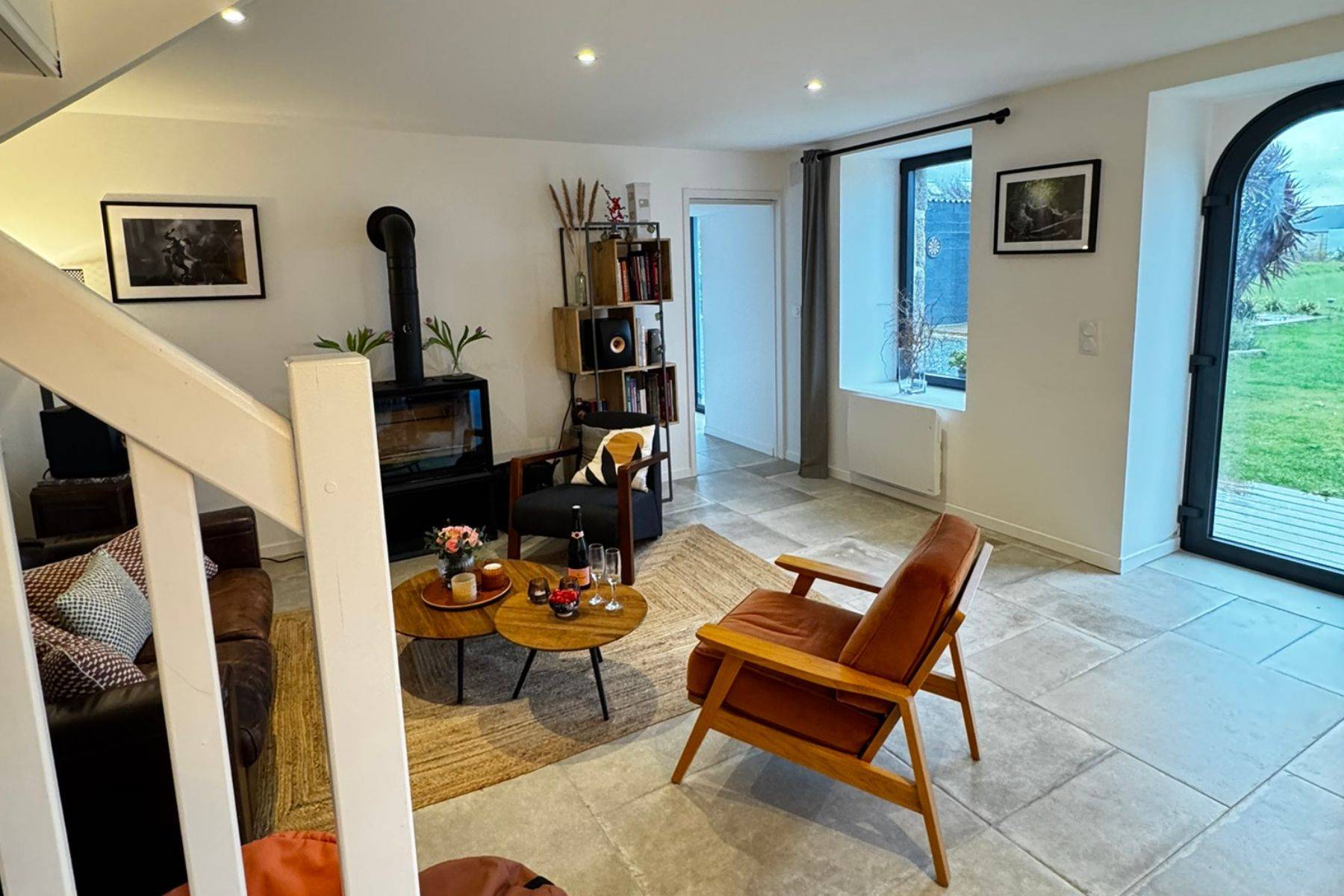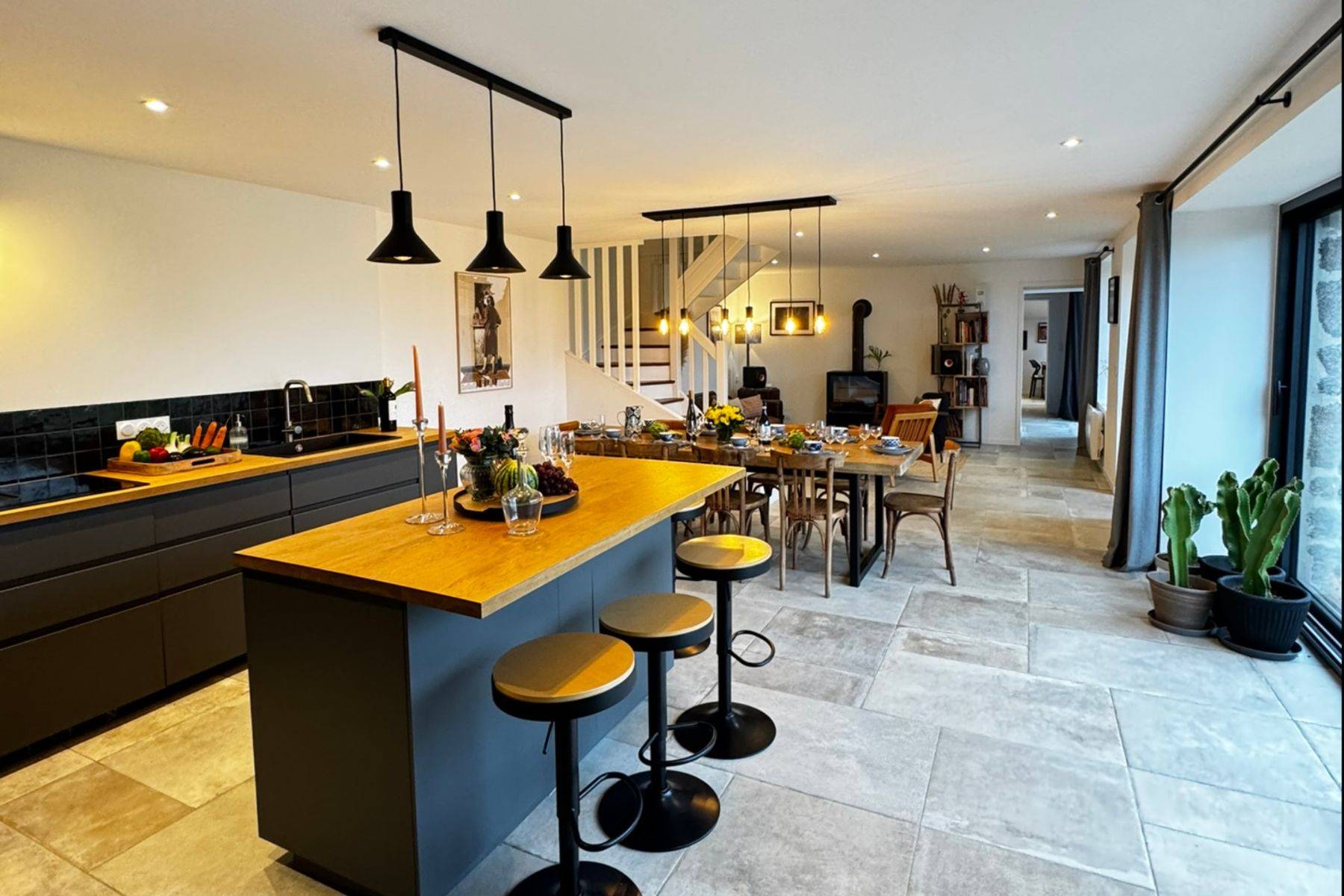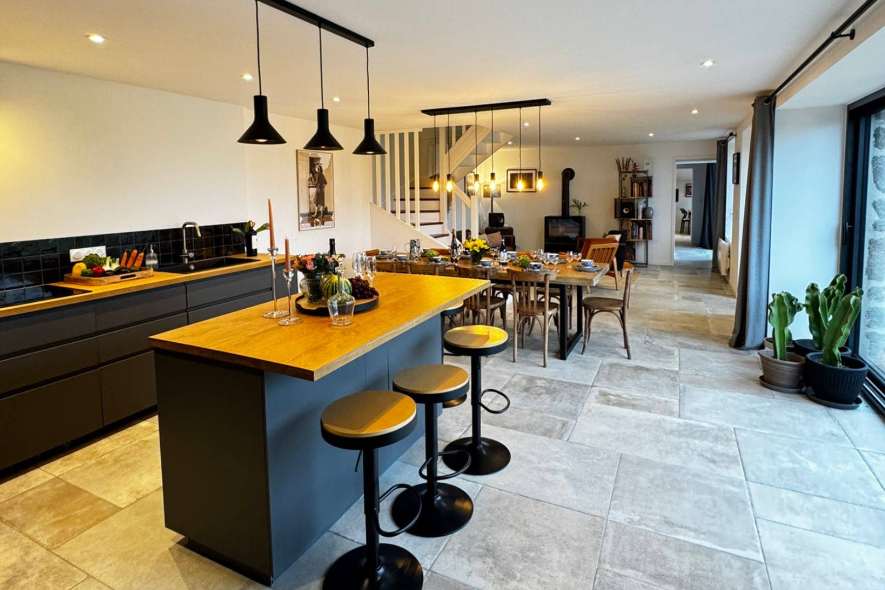 Nach der Renovierung 2025 ist ein modernes, aber von außen traditionell, bretonisches Ferienhaus entstanden (Zentral gelegen ist der offene Wohn-Koch-Ess-Bereich mit Kaminofen).