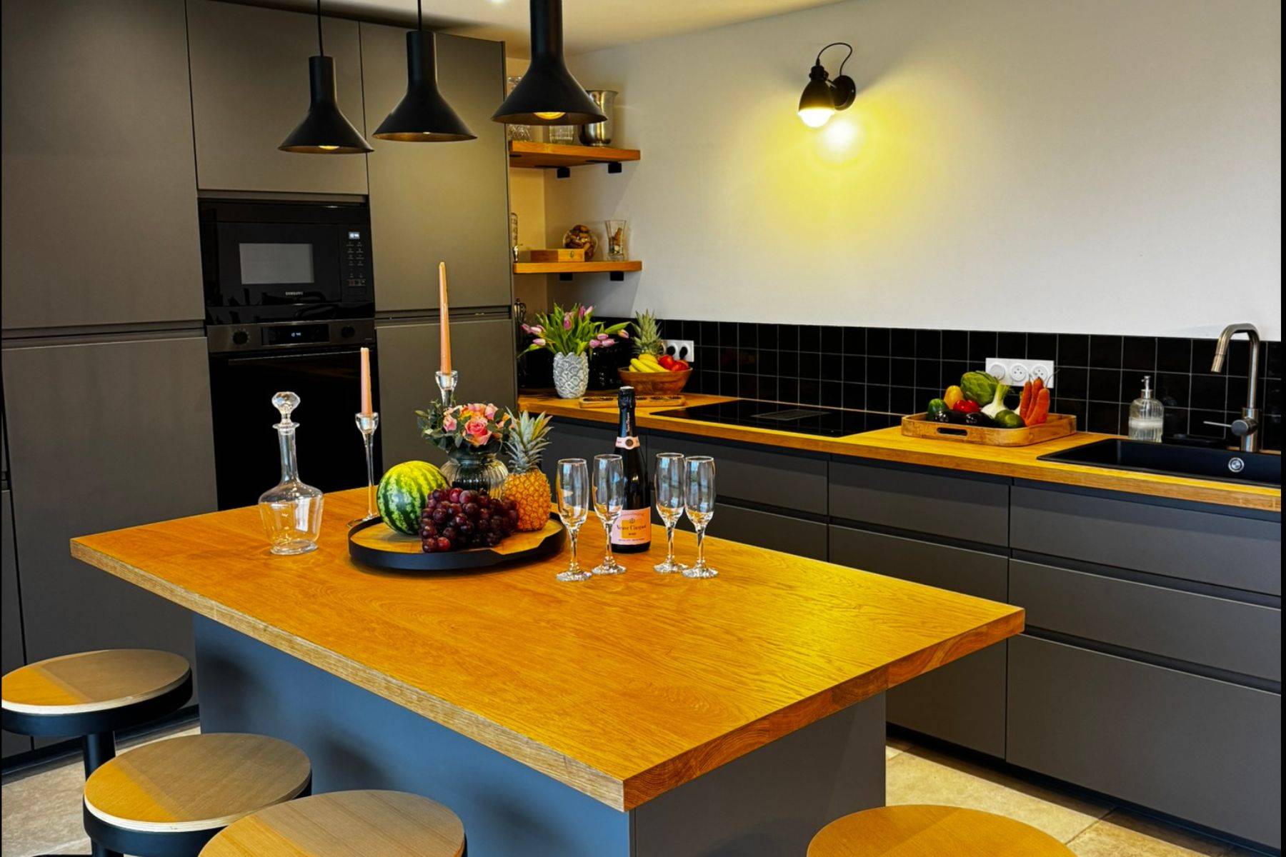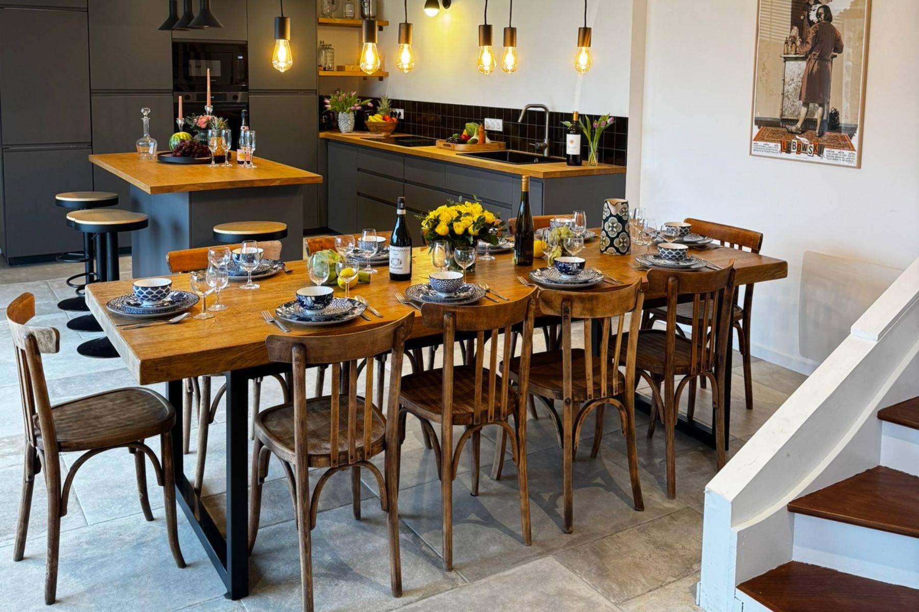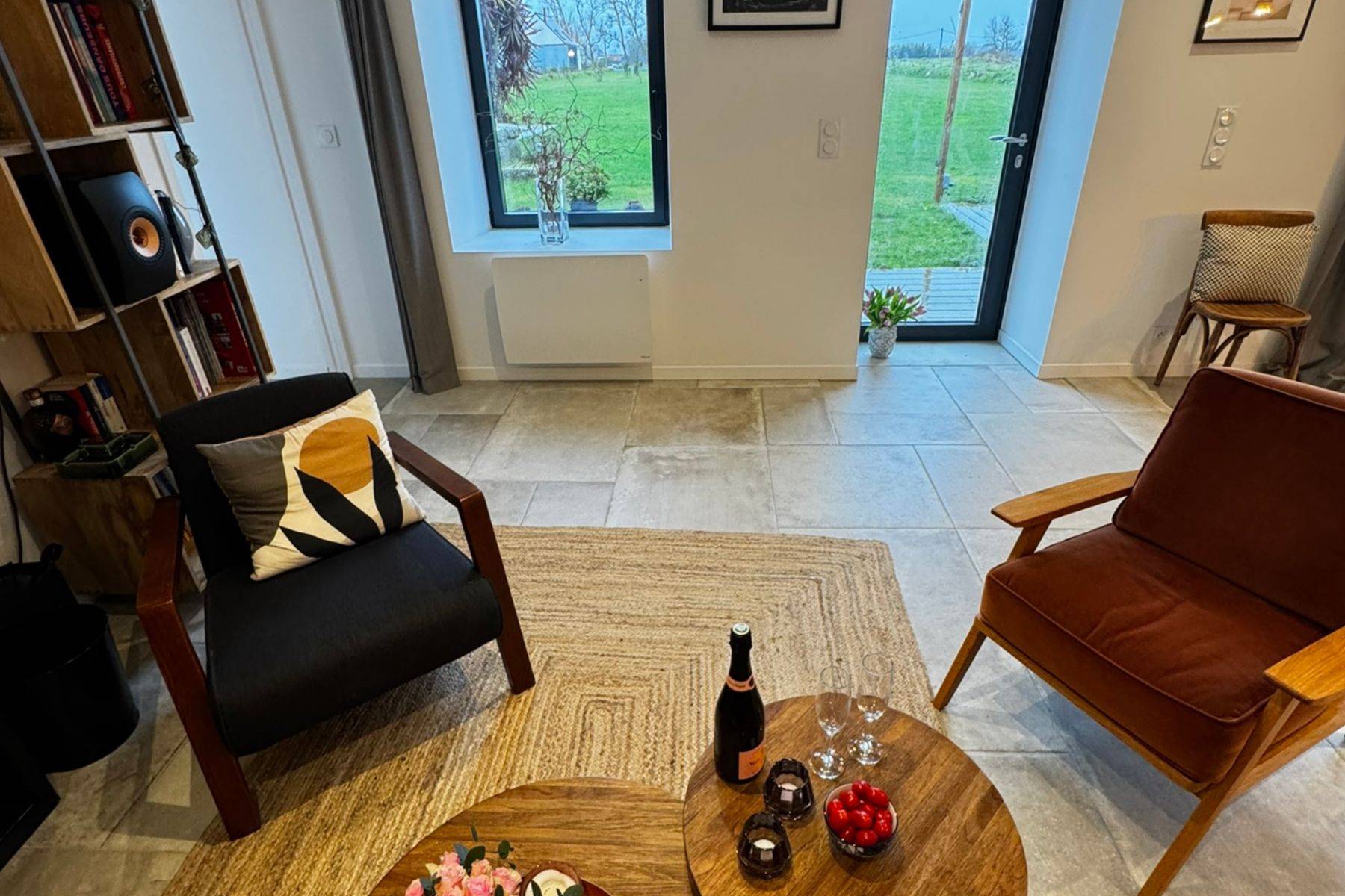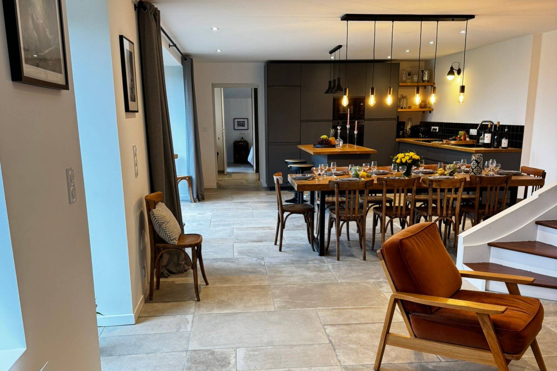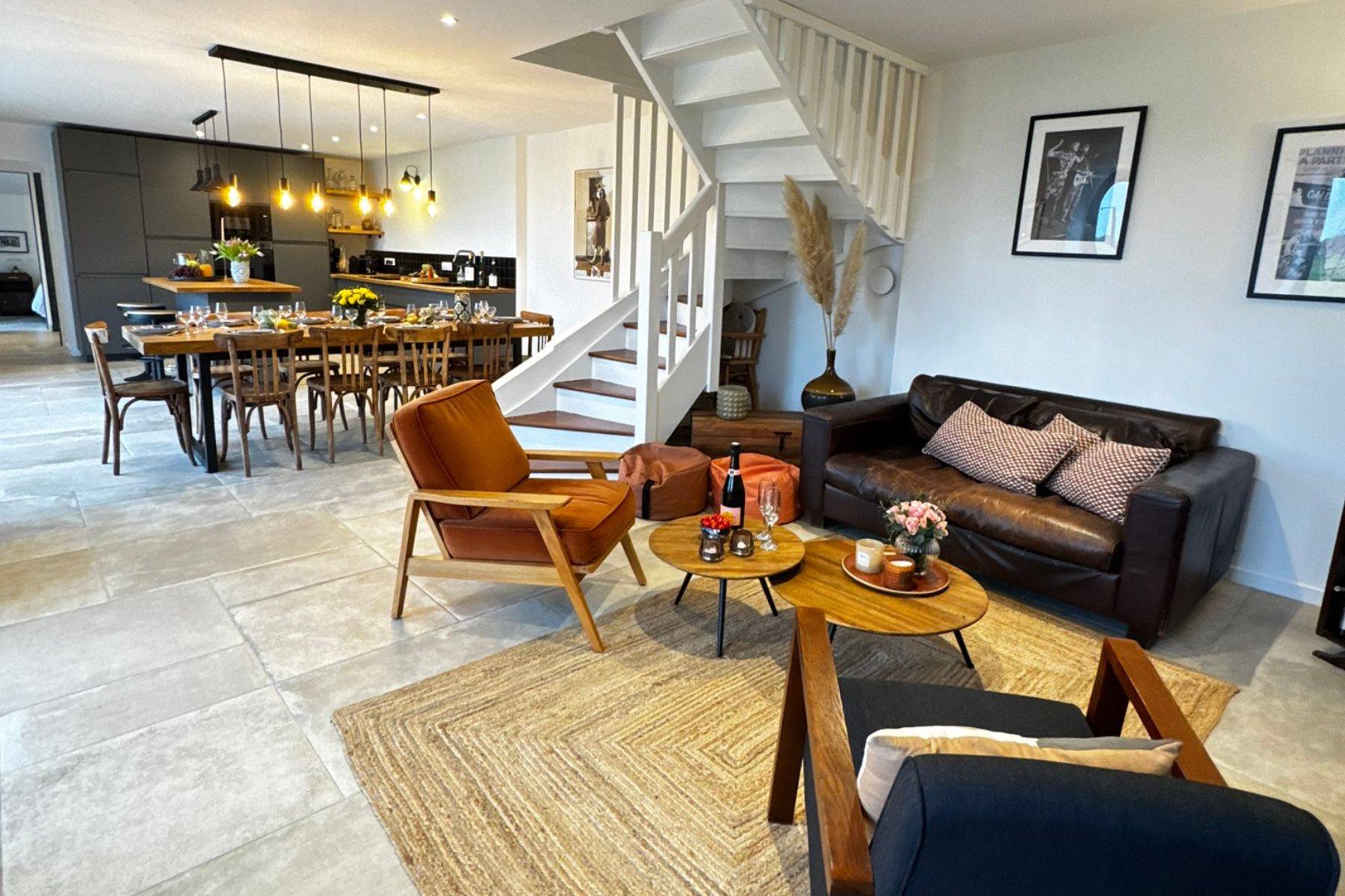 Nach der Renovierung 2025 ist ein modernes, aber von außen traditionell, bretonisches Ferienhaus entstanden (Zentral gelegen ist der offene Wohn-Koch-Ess-Bereich mit Kaminofen).