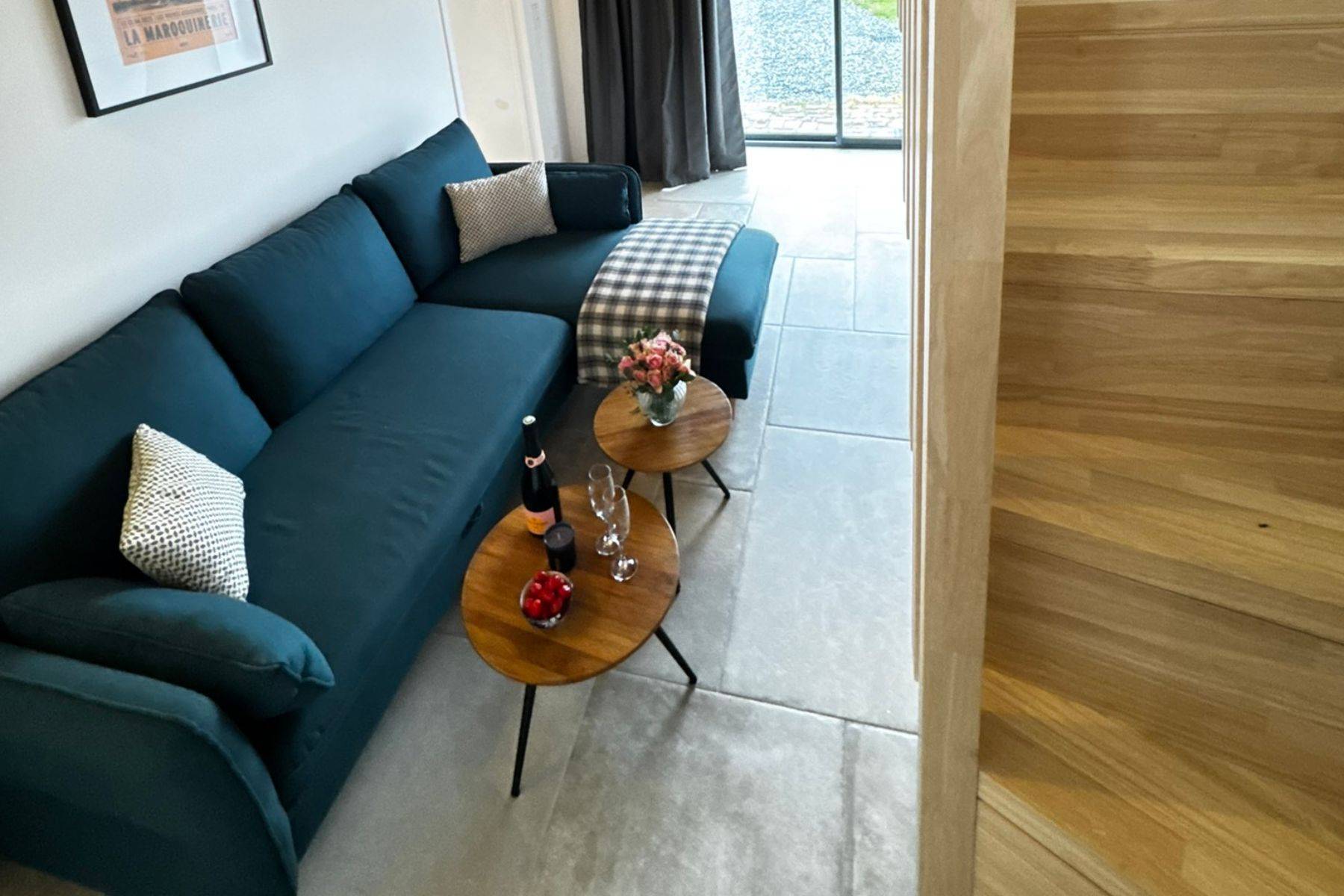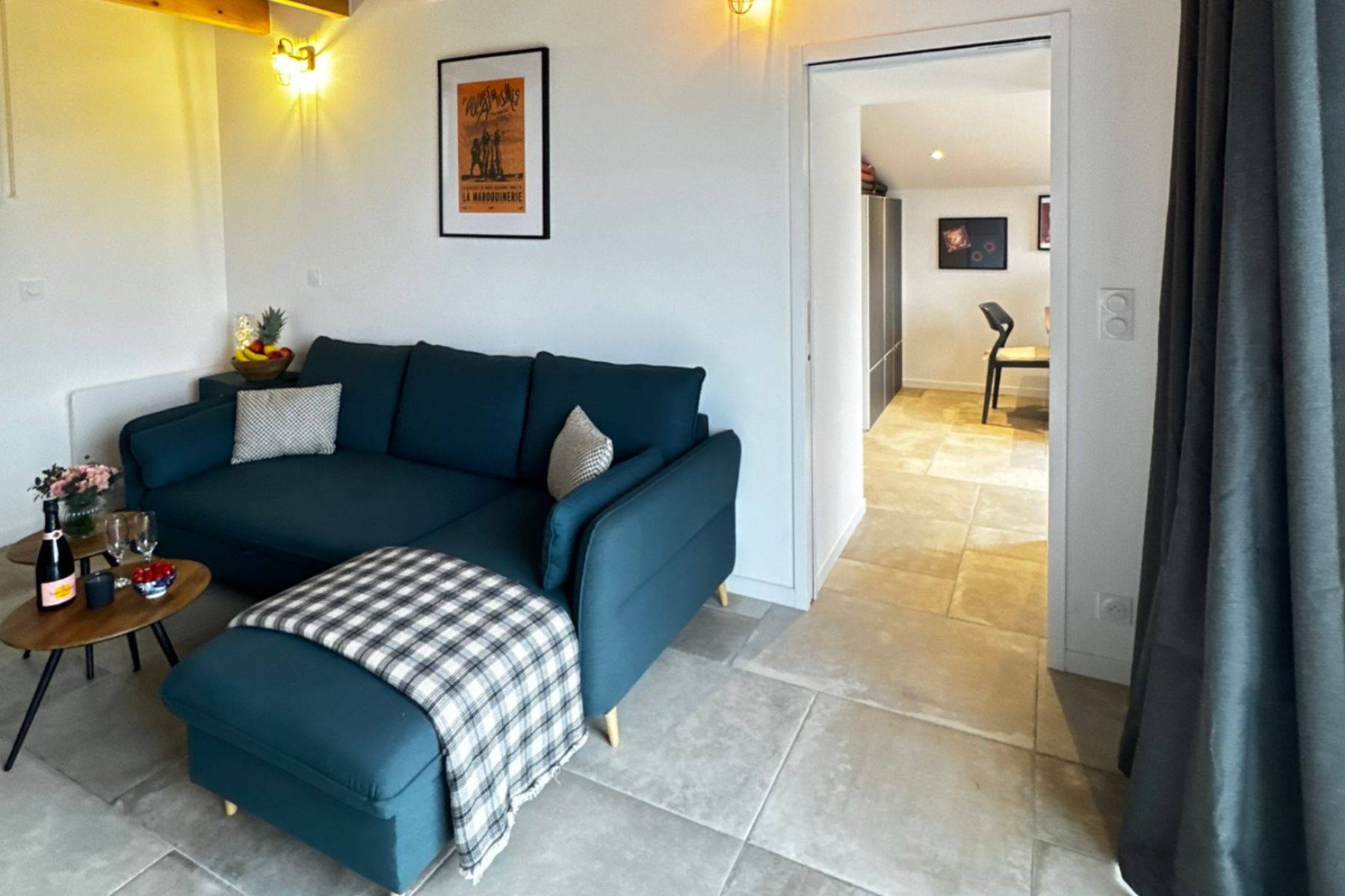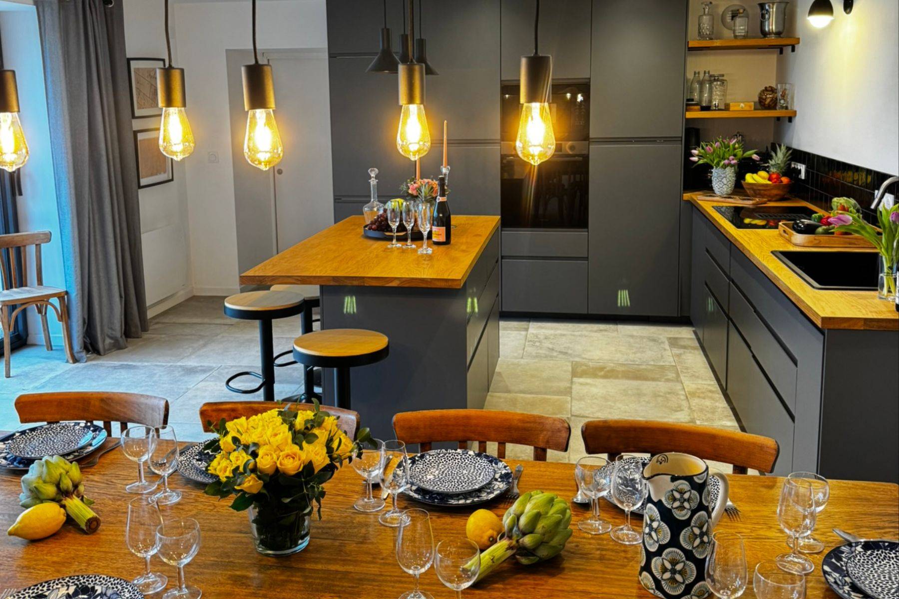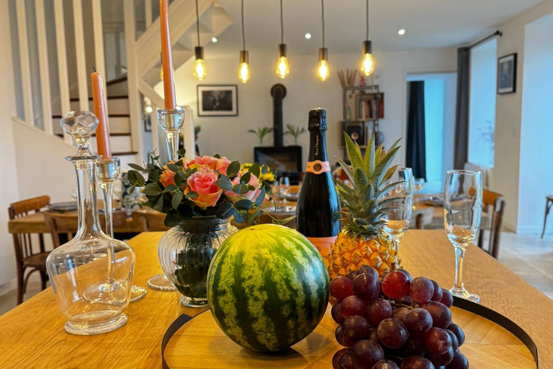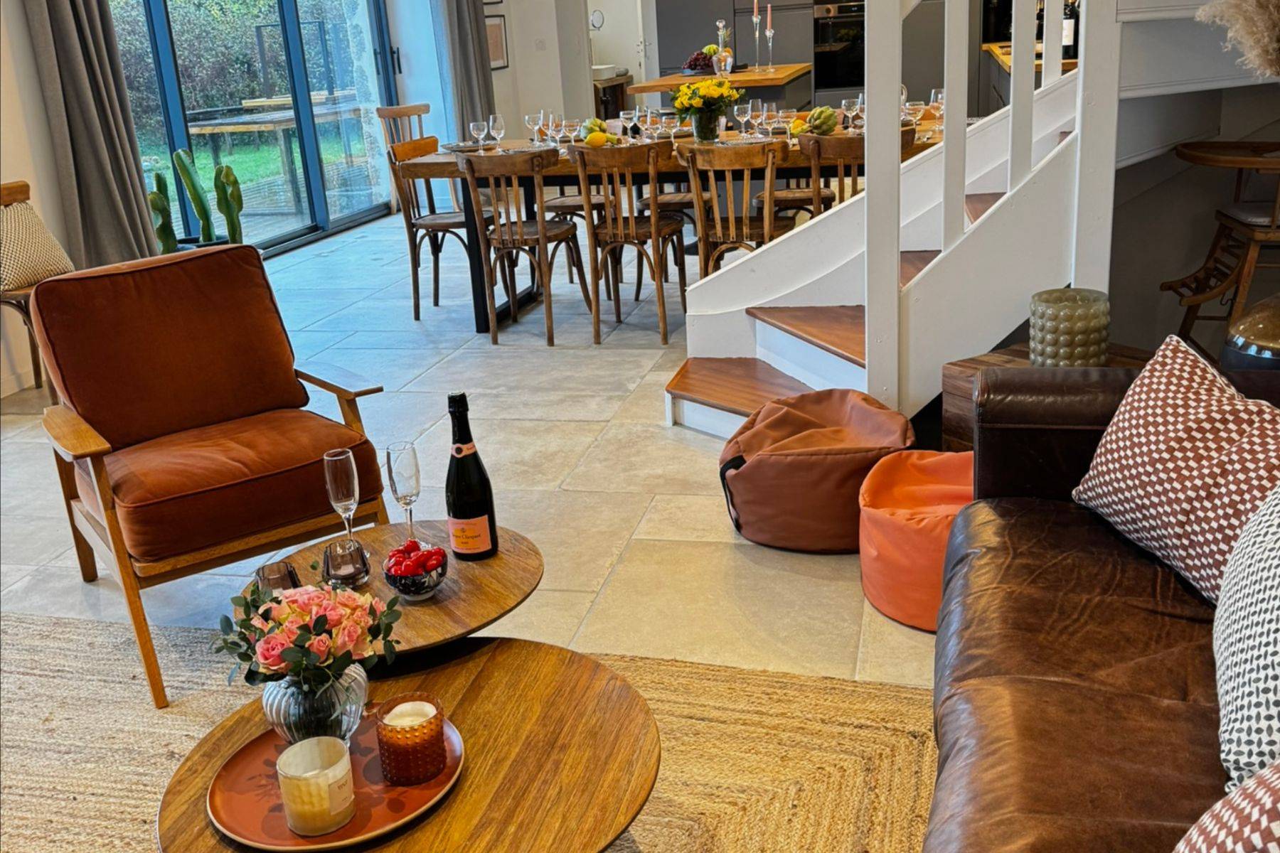 Nach der Renovierung 2025 ist ein modernes, aber von außen traditionell, bretonisches Ferienhaus entstanden (Zentral gelegen ist der offene Wohn-Koch-Ess-Bereich mit Kaminofen).