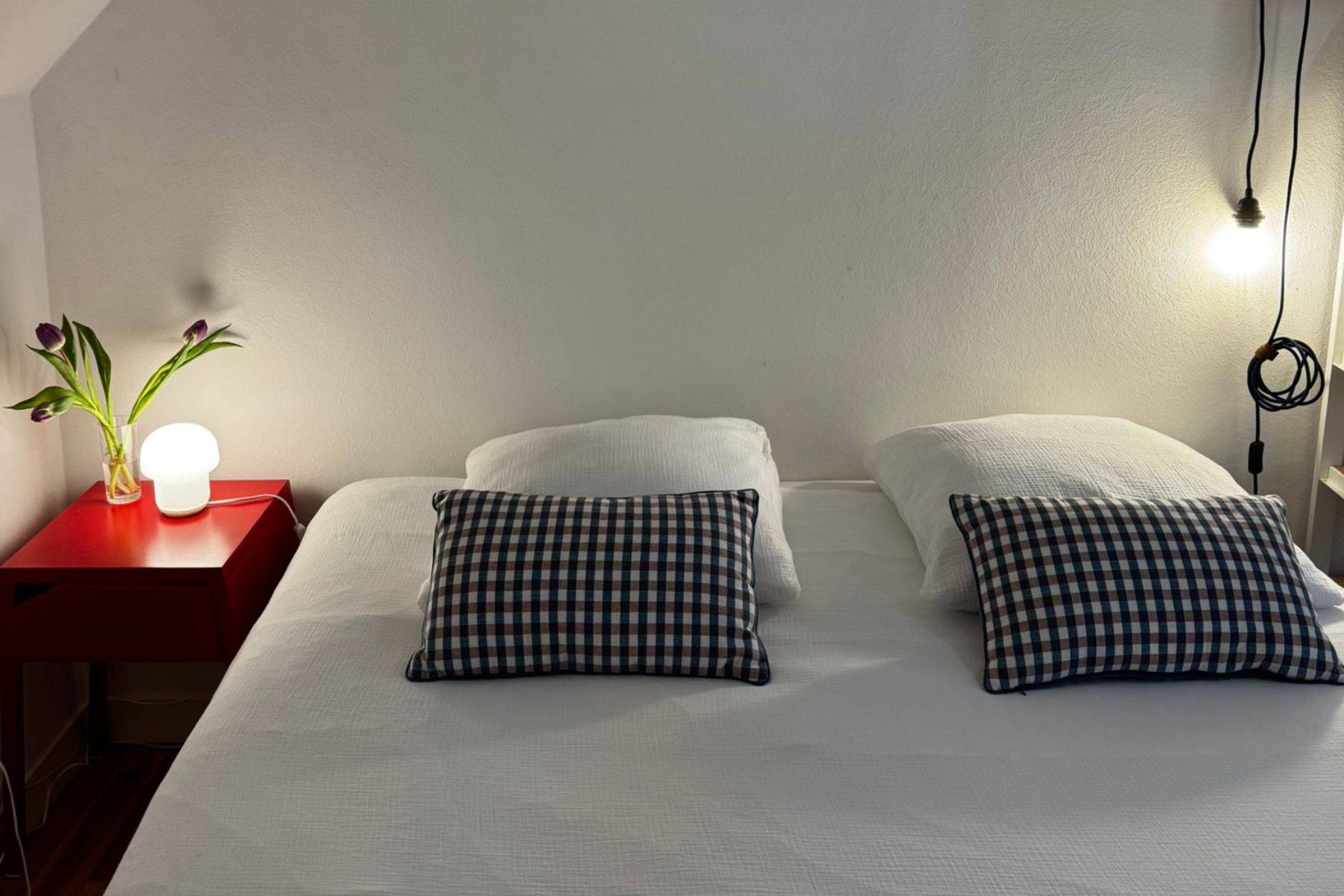 Bettwäsche Doppelbett Fenster Fernsehgerät Kommode Rauchmelder Sofa
