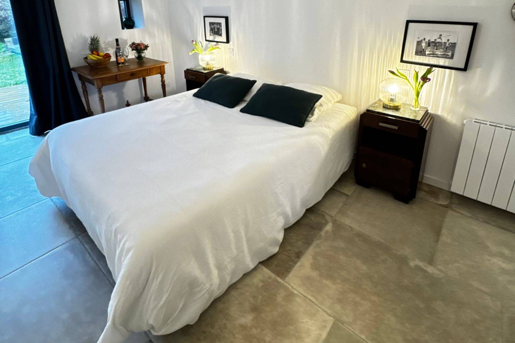 Der Masterbedroom im EG hat einen direkten Zugang zum Garten und der Terrasse. Im Garten befinden sich gleich zwei große Sonnenterrassen.