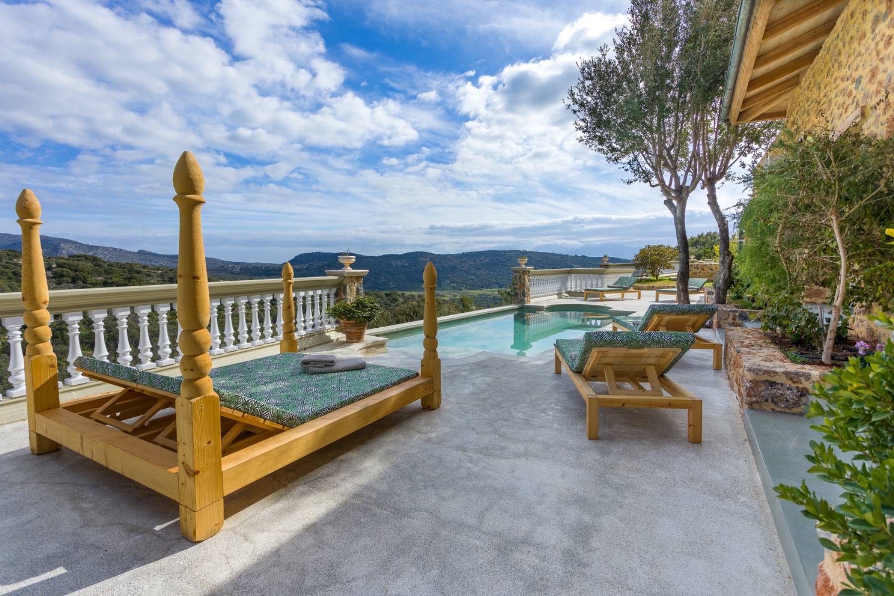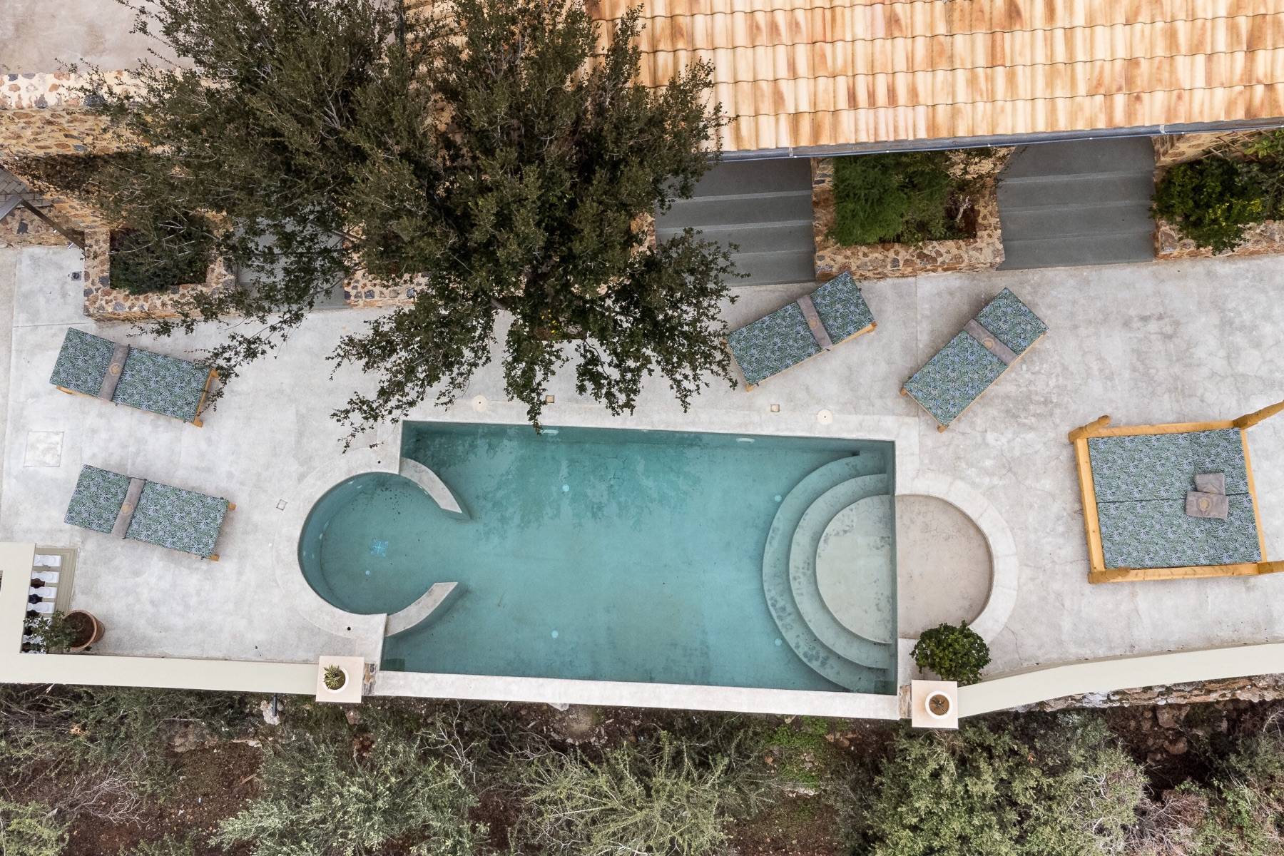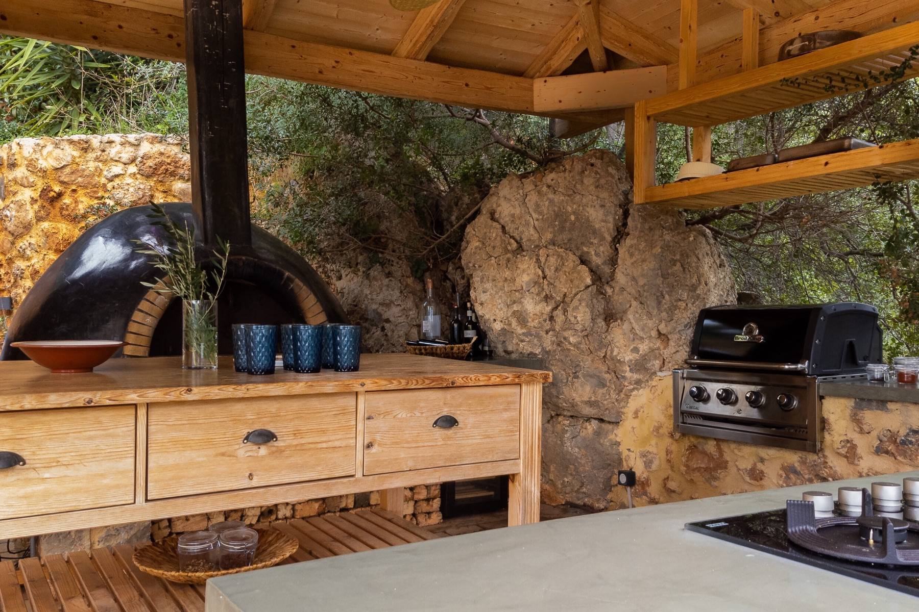 Die Villa verfügt über einen etwa 8 auf 4 Meter grossen Pool mit integriertem Jacuzzi, gesäumt von einer Mosaik-Terrasse. Zum Außenbereich gehören zudem eine gut ausgestattete Küche und eine Bar sowie Sonnenliegen und eine Poolliege. Die Küche ist mit einem Gasgrill, einem traditionellen Holzofen, Gasherden, einem Kühlschrank und einem Weinkühler ausgestattet. Zudem stehen im Freien ein 55-Zoll-Fernseher und einem Audiosystem zur weiteren Unterhaltung zur Verfügung.