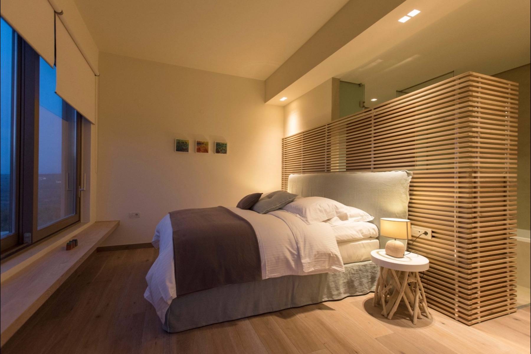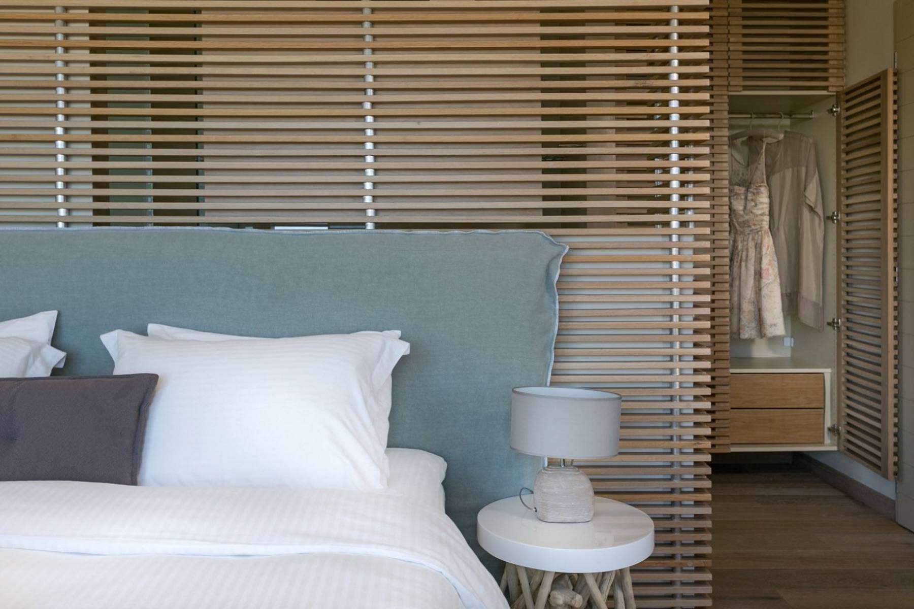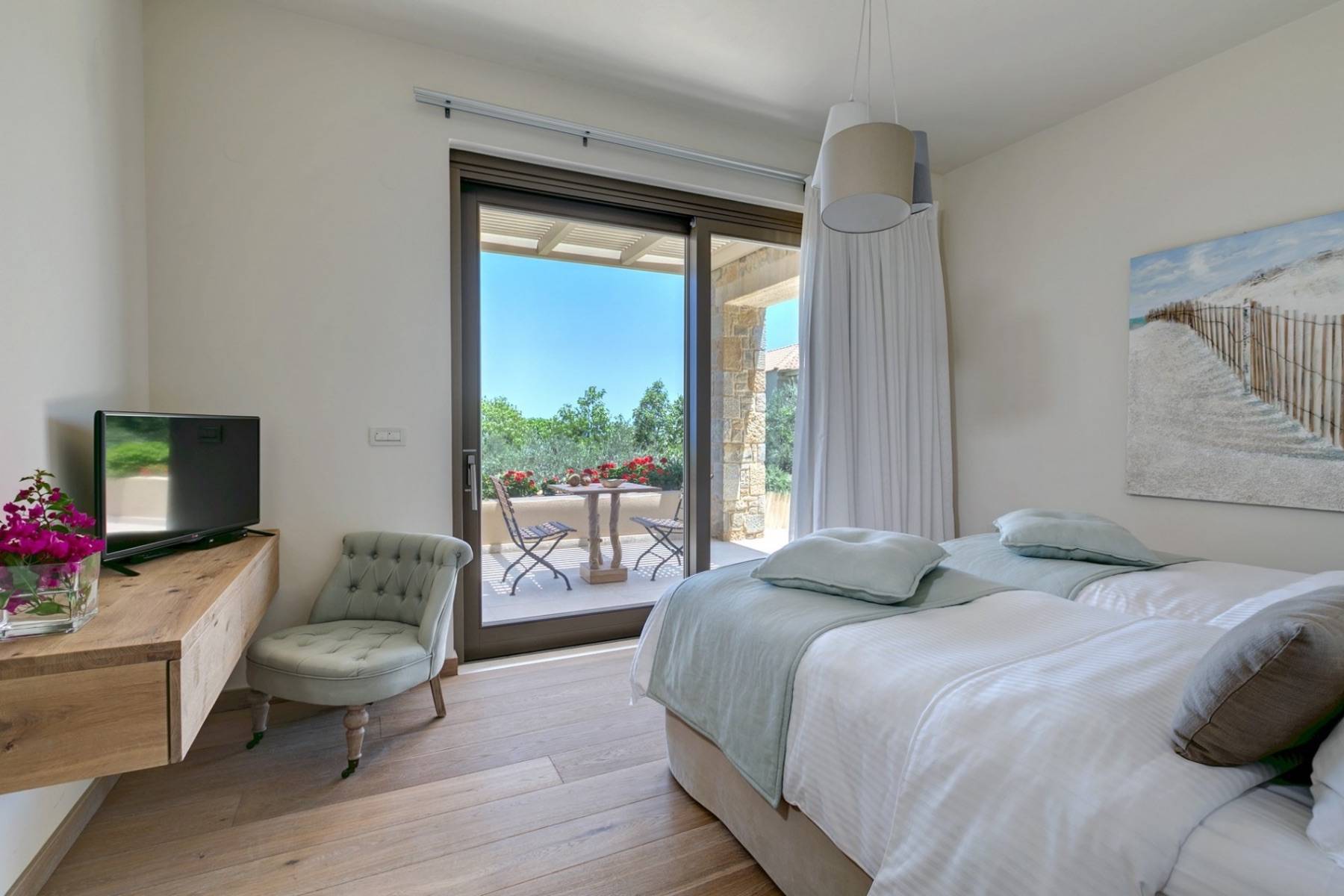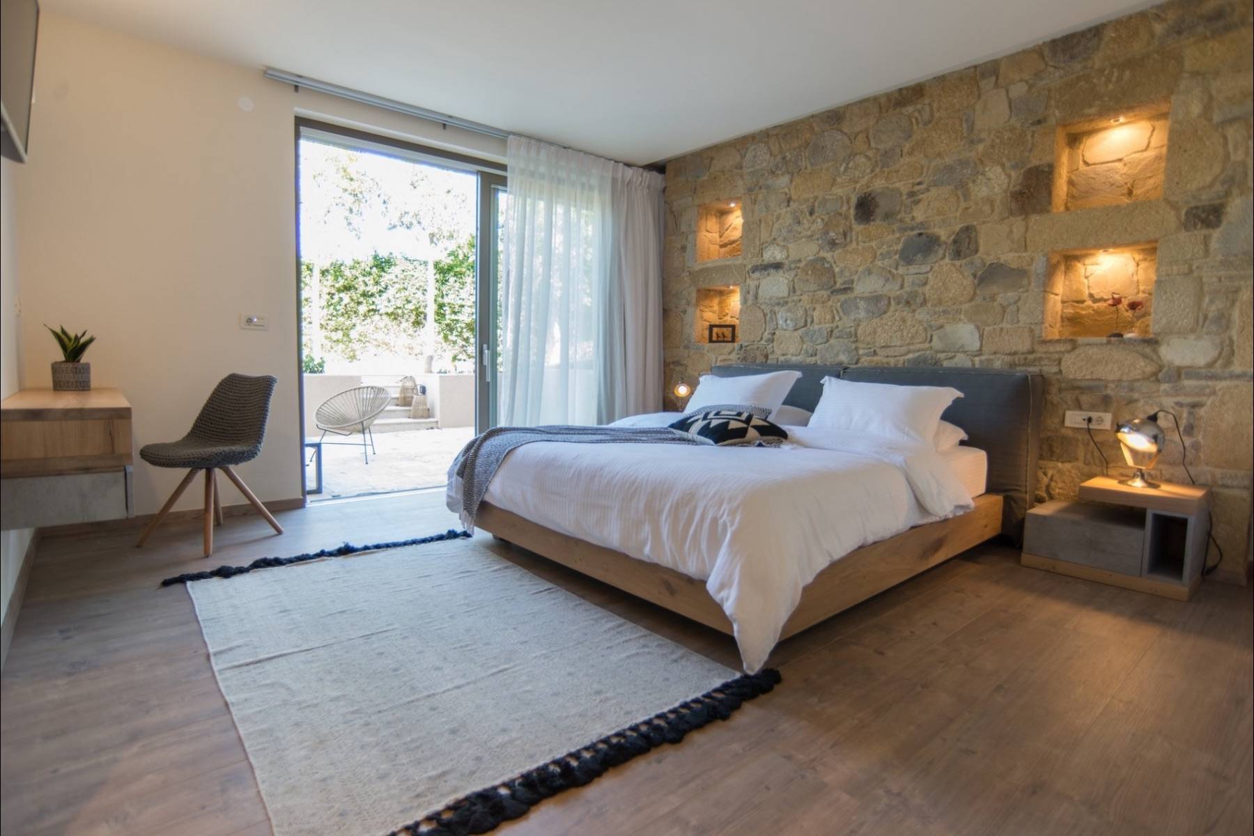 Zwei der insgesamt vier Schlafzimmer befinden sich im Erdgeschoss und sind mit hochwertigen Betten und Matratzen von COCO-Mat ausgestattet. Zu beiden Schlafzimmern gehört ein eigenes Badezimmer en suite, die mit einem strukturierten Beton versehen sind.