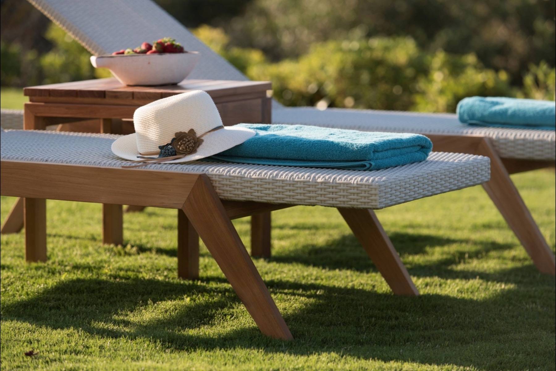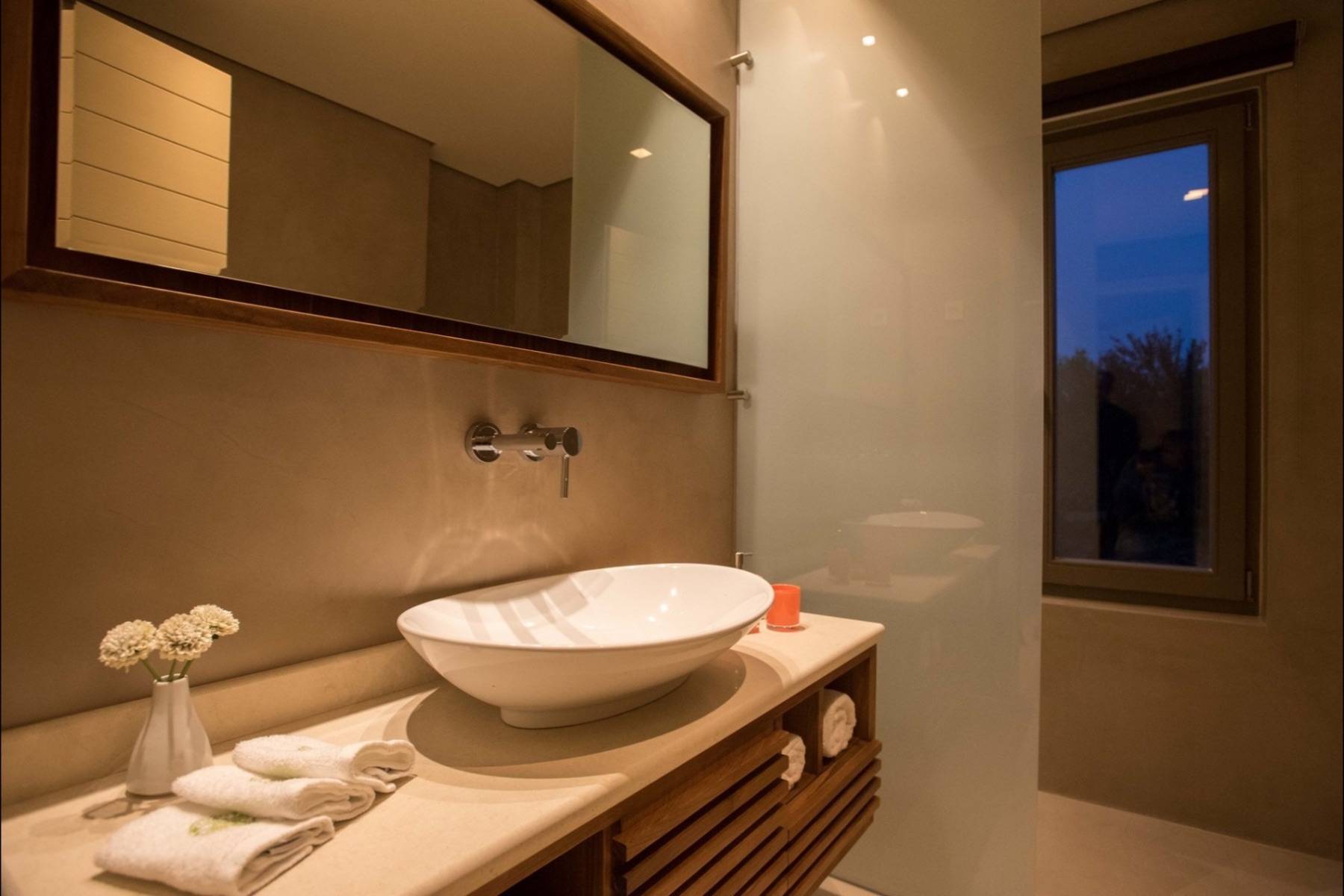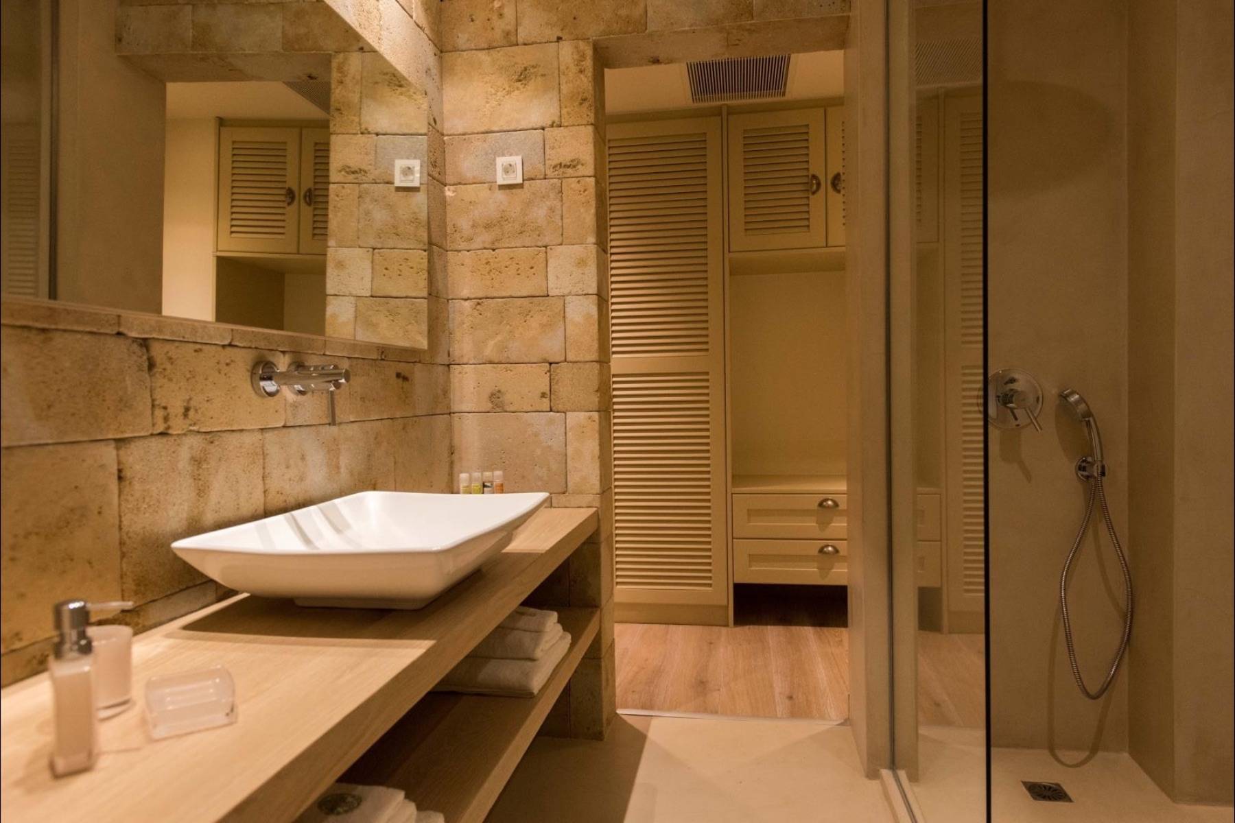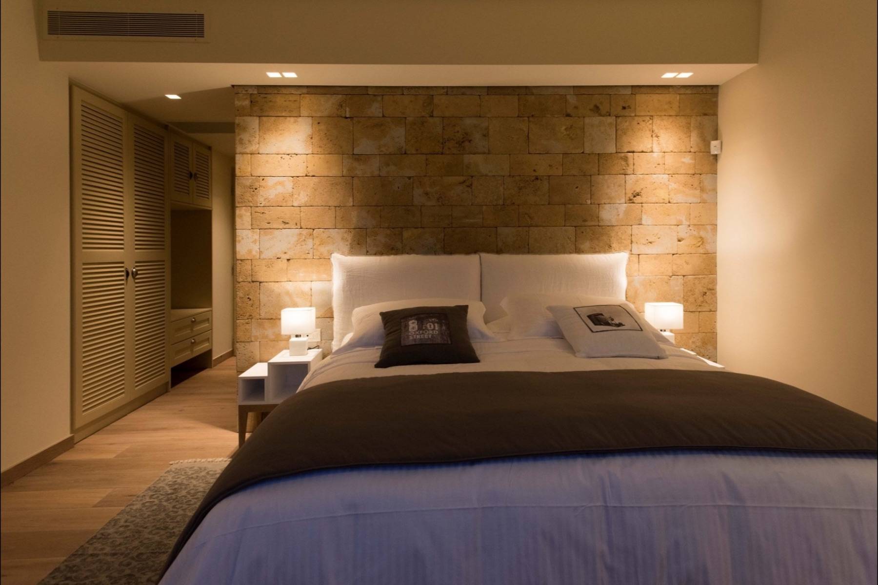 Zwei der insgesamt vier Schlafzimmer befinden sich im Erdgeschoss und sind mit hochwertigen Betten und Matratzen von COCO-Mat ausgestattet. Zu beiden Schlafzimmern gehört ein eigenes Badezimmer en suite, die mit einem strukturierten Beton versehen sind.