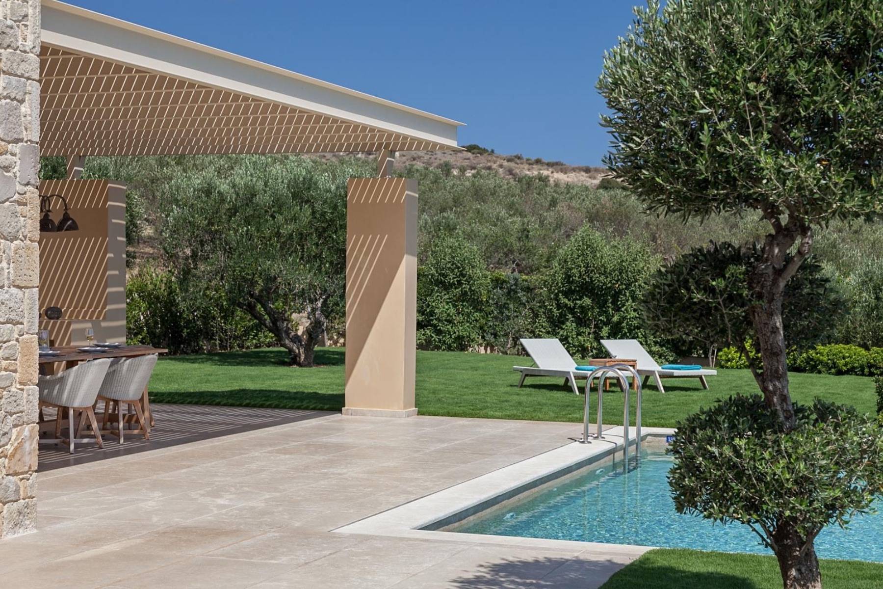 Die Ferienvilla wurde nach den Prinzipien grüner und bioklimatischer Architektur hinsichtlich Design, Funktionalität und natürlichen Baumaterialien auf einem 3 Hektar großen Grundstück erbaut.