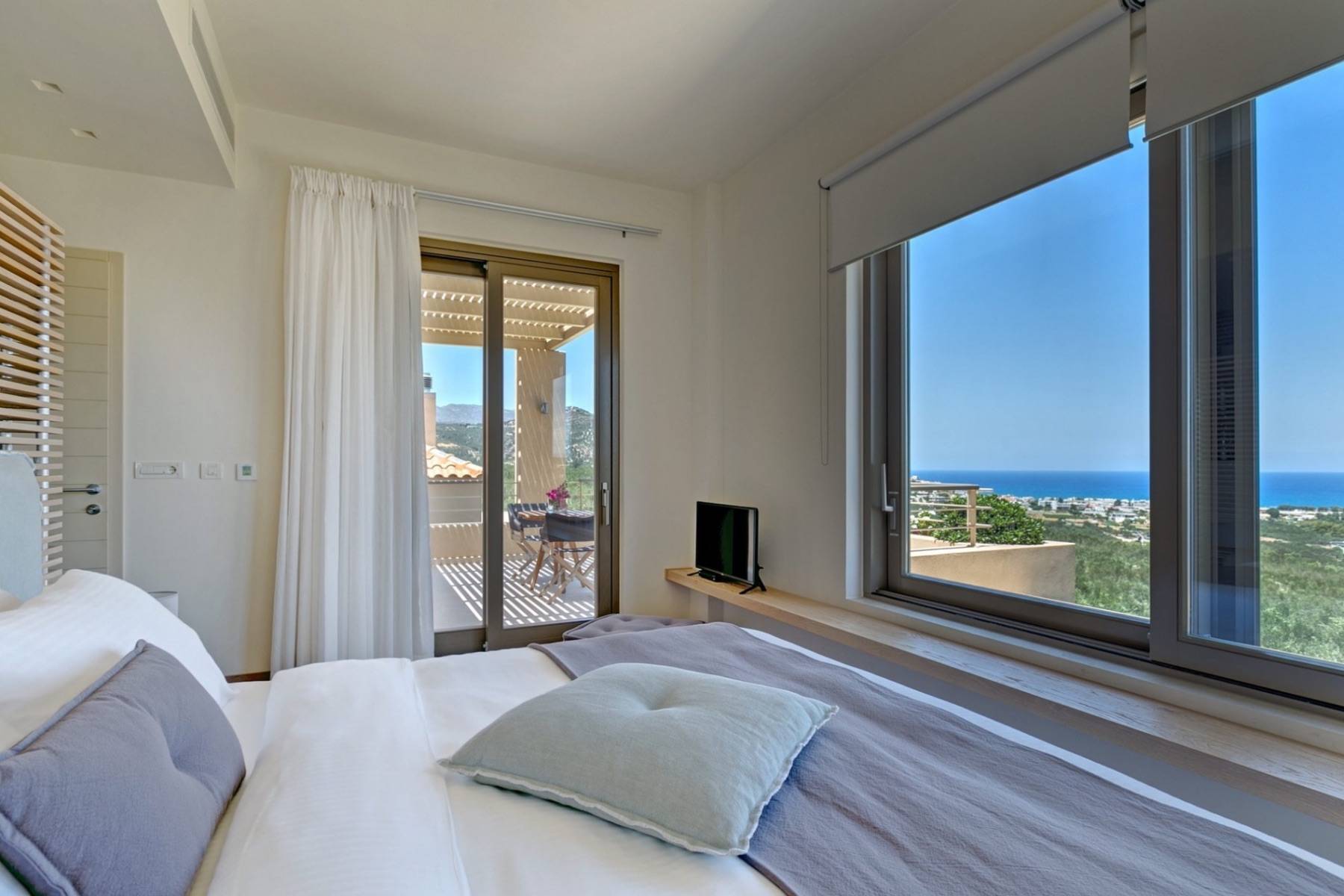 Ein drittes Schlafzimmer mit Badezimmer befindet sich im ersten Obergeschoss und verfügt über einen eigenen Balkonzugang, der einen traumhaften Meerblick ermöglicht.