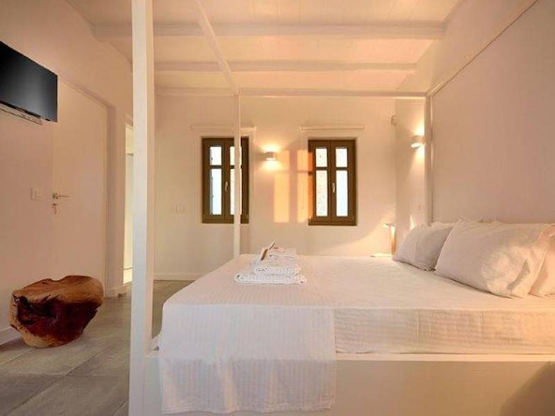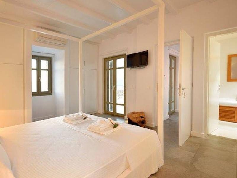 Das klimatisierte Hauptschlafzimmer befindet sich ebenfalls im Erdgeschoss und ist luftig und stilvoll eingerichtet. Es verfügt über ein modernes Kingsize-Himmelbett, einen Holzhocker, einen Satellitenfernseher, geräumige Kleiderschränke und ein eigenes Bad mit Waschbecken. Dusche und Toilette.