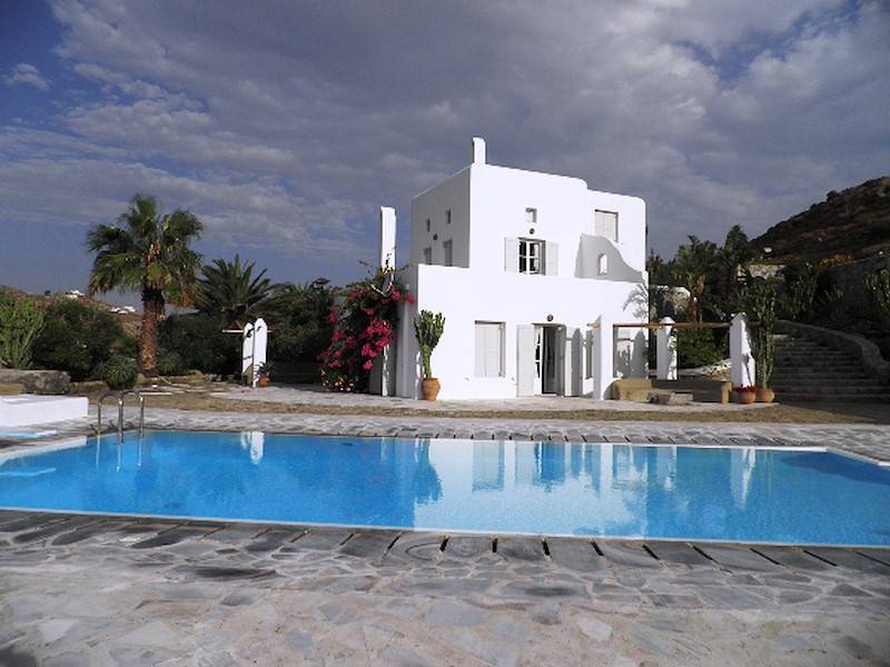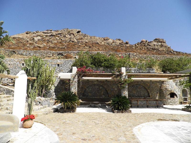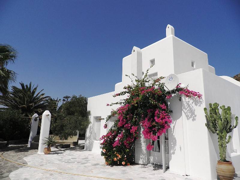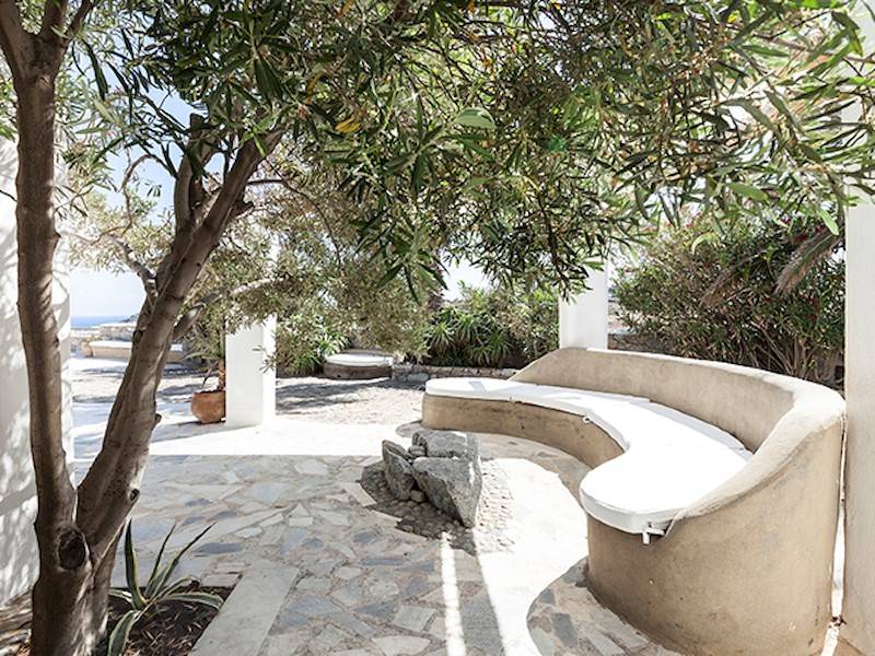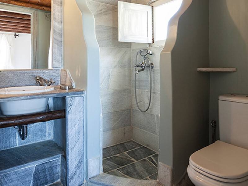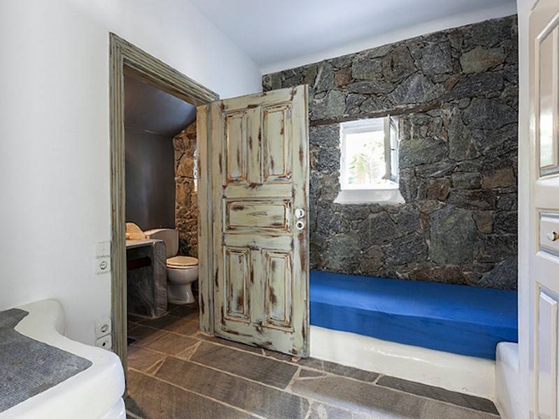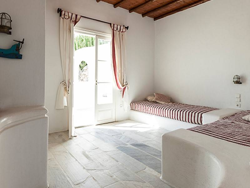 Ein Schlafzimmer hat ein eigenes Bad, die anderen beiden Schlafzimmer teilen sich ein Badezimmer. Alle drei Schlafzimmer öffnen sich auf eine private Terrasse mit Blick auf den Garten und / oder die Sonnenterrasse und die unglaublich schöne Küste von Mykonos.