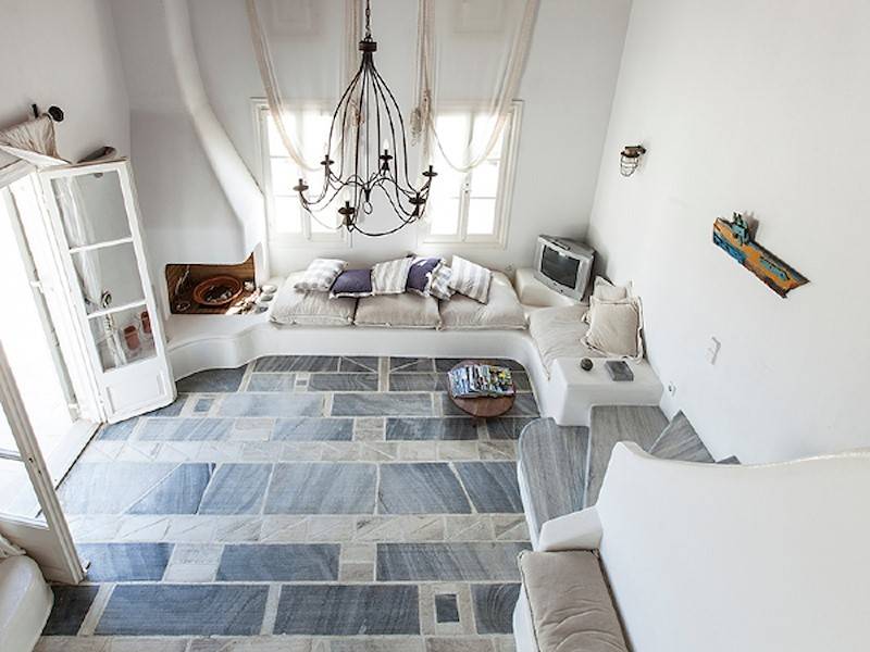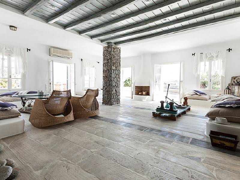 Die Villa hat eine Gesamtfläche von 280 m² und befindet sich auf einem Grundstück von 1.800 m². Das große quadratische und klimatisierte Wohnzimmer bietet eine Kombination aus authentischen und modernen, rustikalen Stilen in Bezug auf Stil und Design: typische Steinsofas mit bequemen dicken Kissen in Erdtönen, moderne Korbsessel, verschiedene Lounge-Ecken und ein gemütlicher Kamin. Das Wohnzimmer ist ein idealer Ruhebereich.