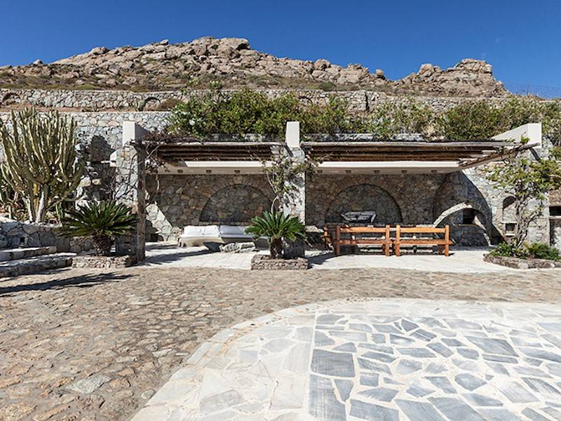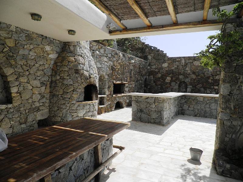 Die riesige Steinterrasse verfügt über eine geräumige und schattige Terrasse mit einem halbkreisförmigen Loungesofa und einer großen Pergola mit stabilen Natursteinmauern, in der sich neben einer robusten Außenküche mit Grill und Pizzaofen ein schattiger Ess- / Loungebereich befindet.
