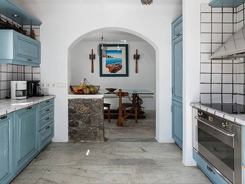 Die moderne und voll ausgestattete lavendelfarbene Küche ist über einen Kykladenbogen mit dem halboffenen Esszimmer mit stabilem Esstisch aus Holz für 8-10 Personen verbunden.