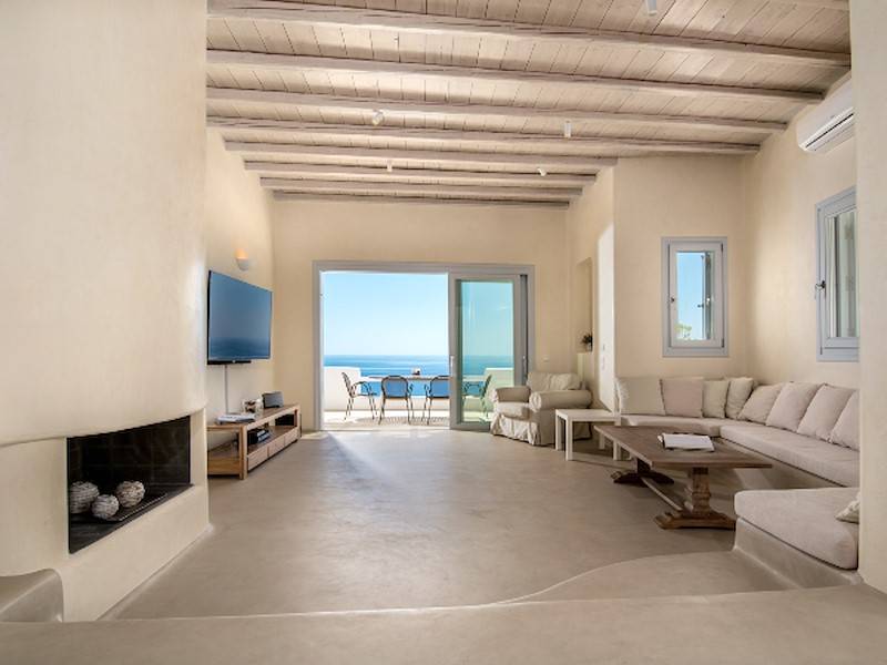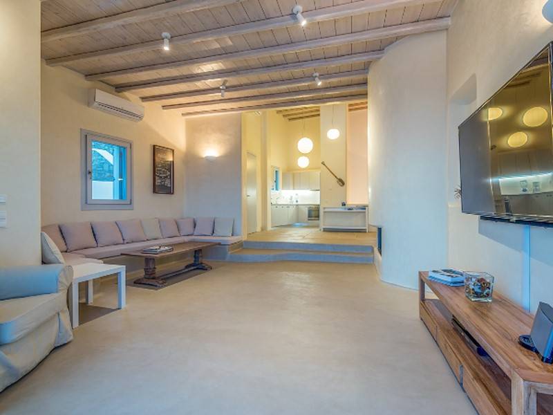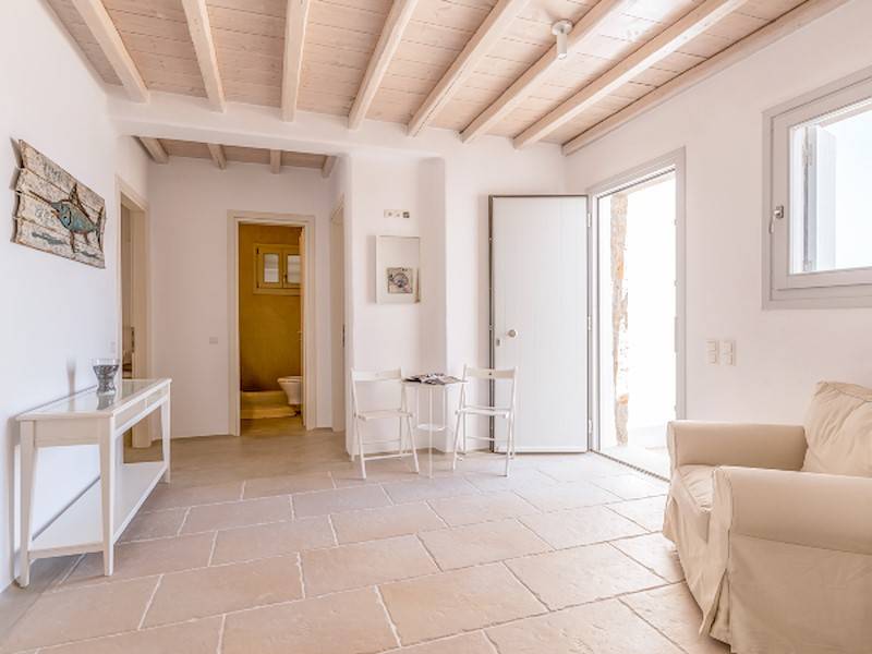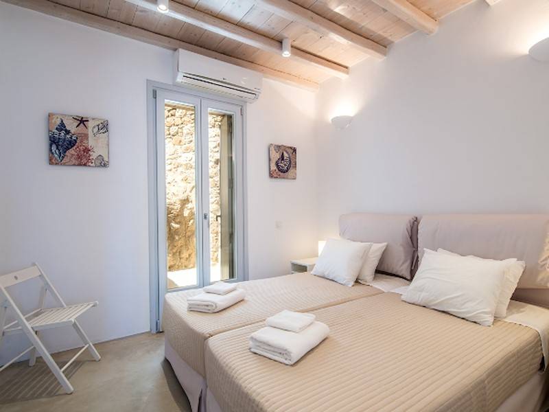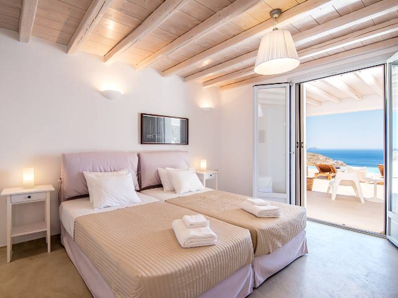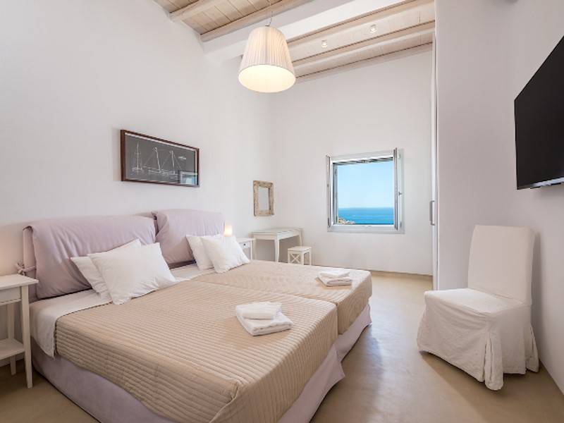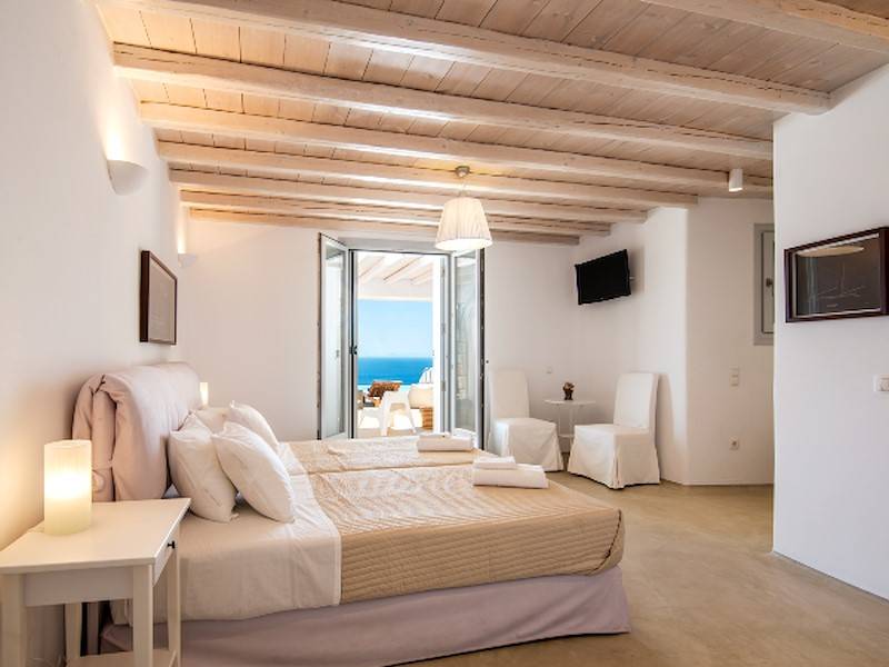 Die fünf luxuriösen Schlafzimmer verteilen sich auf das Erdgeschoss und die oberen Etagen und sind stilvoll mit Kingsize-Betten, Sesseln, Flachbildfernseher und Klimaanlage eingerichtet. Alle Schlafzimmer haben ein eigenes Bad (en-suite) mit Waschbecken, ebenerdiger Dusche und Toilette. Einige Schlafzimmer haben auch einen direkten Zugang zur Sonnenterrasse oder einen eigenen Balkon mit Blick auf die Küste von Mykonos.