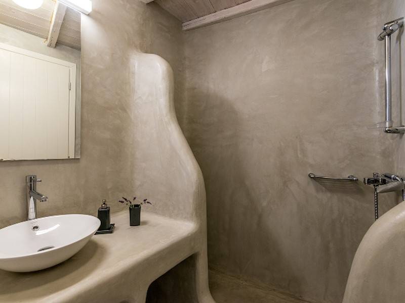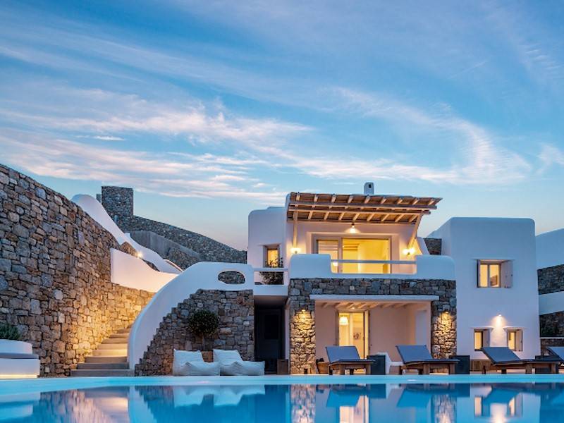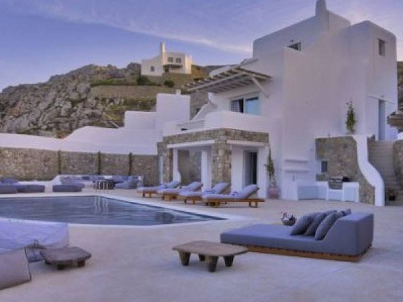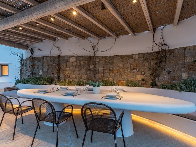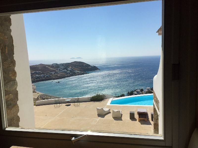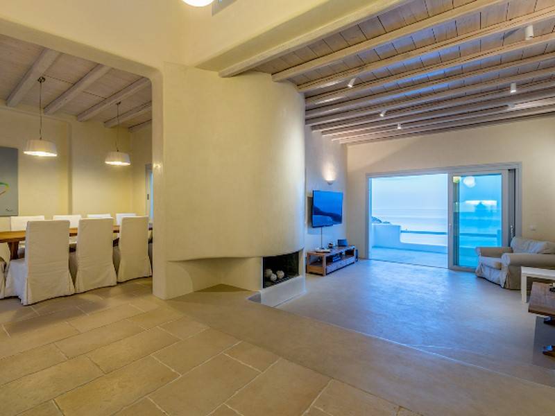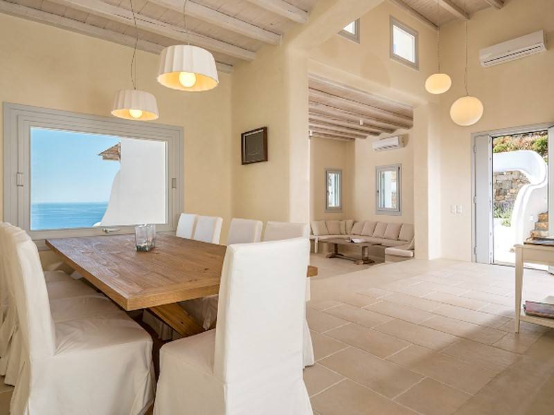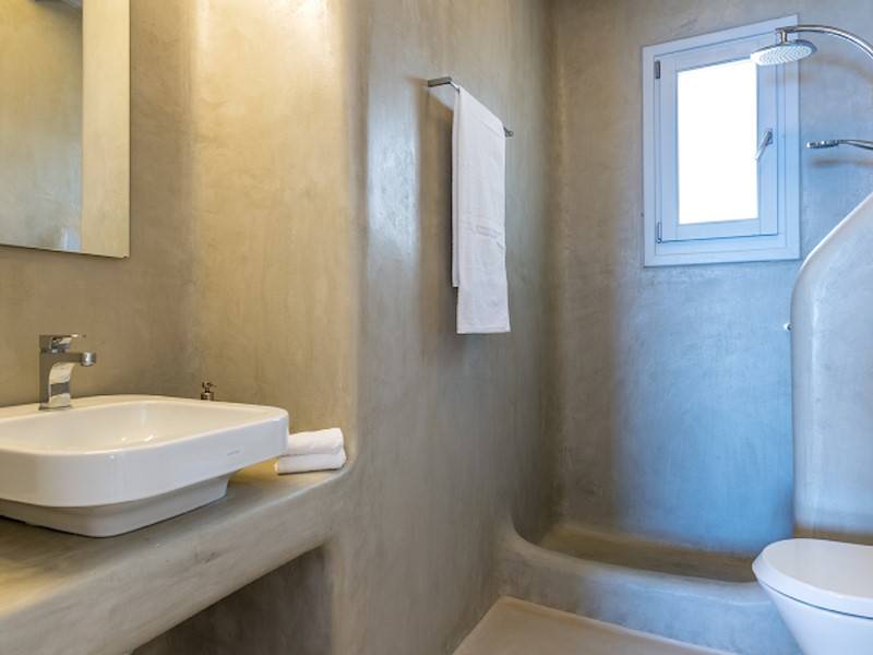 Die fünf luxuriösen Schlafzimmer verteilen sich auf das Erdgeschoss und die oberen Etagen und sind stilvoll mit Kingsize-Betten, Sesseln, Flachbildfernseher und Klimaanlage eingerichtet. Alle Schlafzimmer haben ein eigenes Bad (en-suite) mit Waschbecken, ebenerdiger Dusche und Toilette. Einige Schlafzimmer haben auch einen direkten Zugang zur Sonnenterrasse oder einen eigenen Balkon mit Blick auf die Küste von Mykonos.
