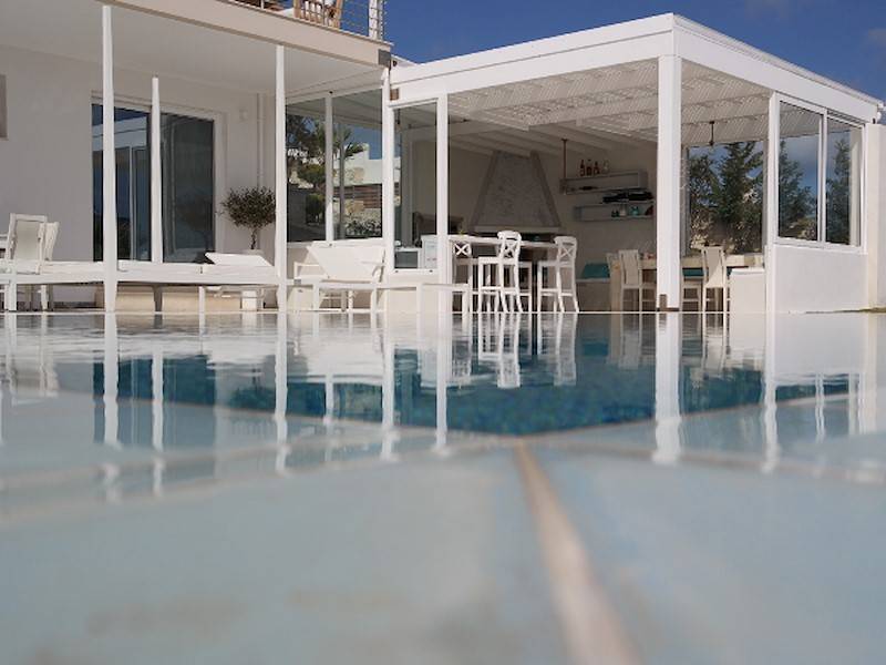 Die teilüberdachte Teakholz Terrasse bietet unterschiedliche gemütliche Bereiche und Lounge-Ecken an. Hier finden Sie außerdem einen Kamin und Grill. Sonnenliegen laden Sie zum gemütlichen relaxen am 35 µ² großen Salzwasser Swimming-pool-mit Gegenstromanlage ein oder lassen sich massieren im angrenzenden 16µ² großen Jaccuzzi / oder Kinderbecken .Vor und nach einem erfrischenden Bad können Sie die Aussendusche nutzen.