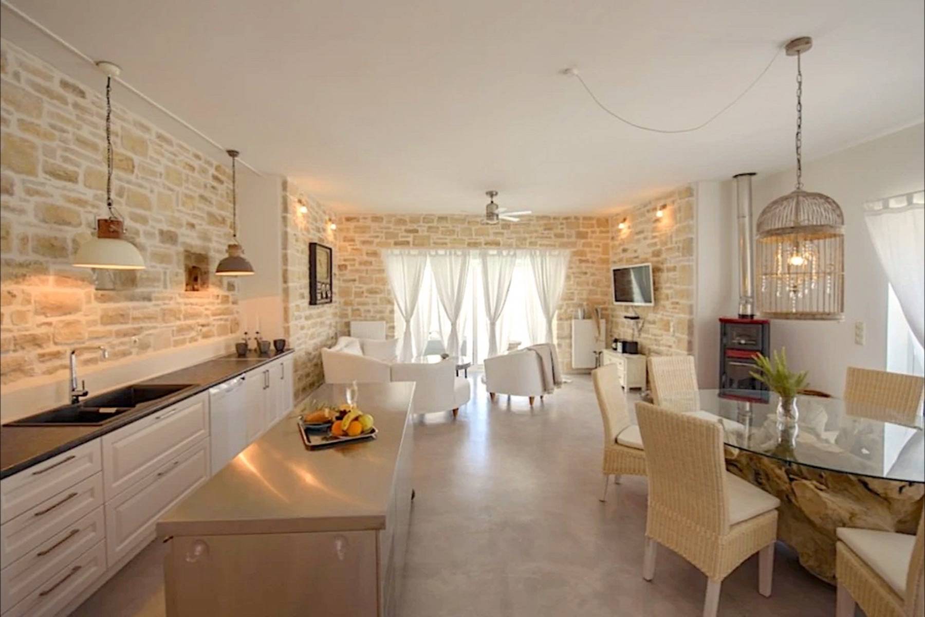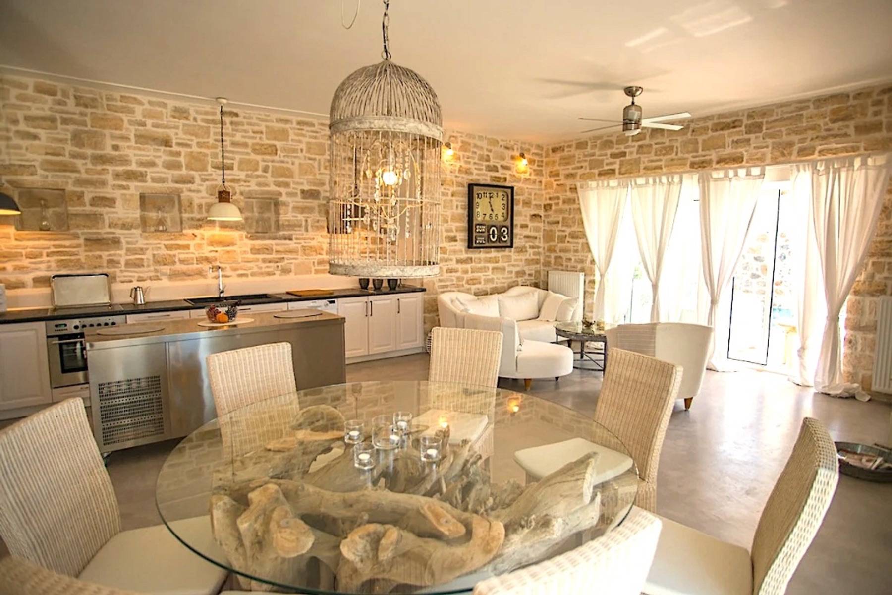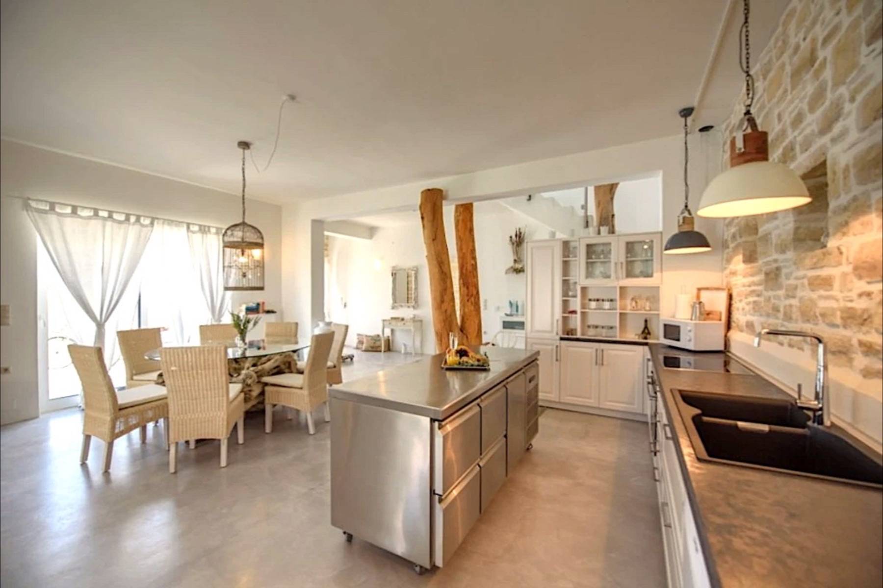Große Wohnküche mit Gastro-Kühlschrank aus Edelstahl, Kaffeemaschine, Espressomaschine von Illy, Mikrowelle,Toaster, elektrische Saftpresse, Pitsos Backofen und Cerankochfeld, Sie finden alle erdenklichen Annehmlichkeiten in dem Ferienhaus Villa Ella.