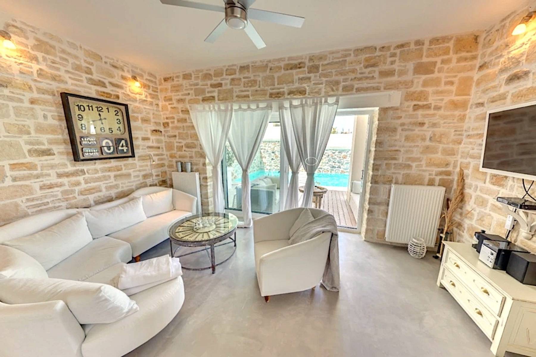 Vom geräumigen Wohnbereich, Sofaecke mit großem Flat-Screen SAT TV, Musikanlage und Deckenventilator, Klimaanlage, Heizung und Holzofen können Sie auf den großen Pool und Jacuzzi schauen.