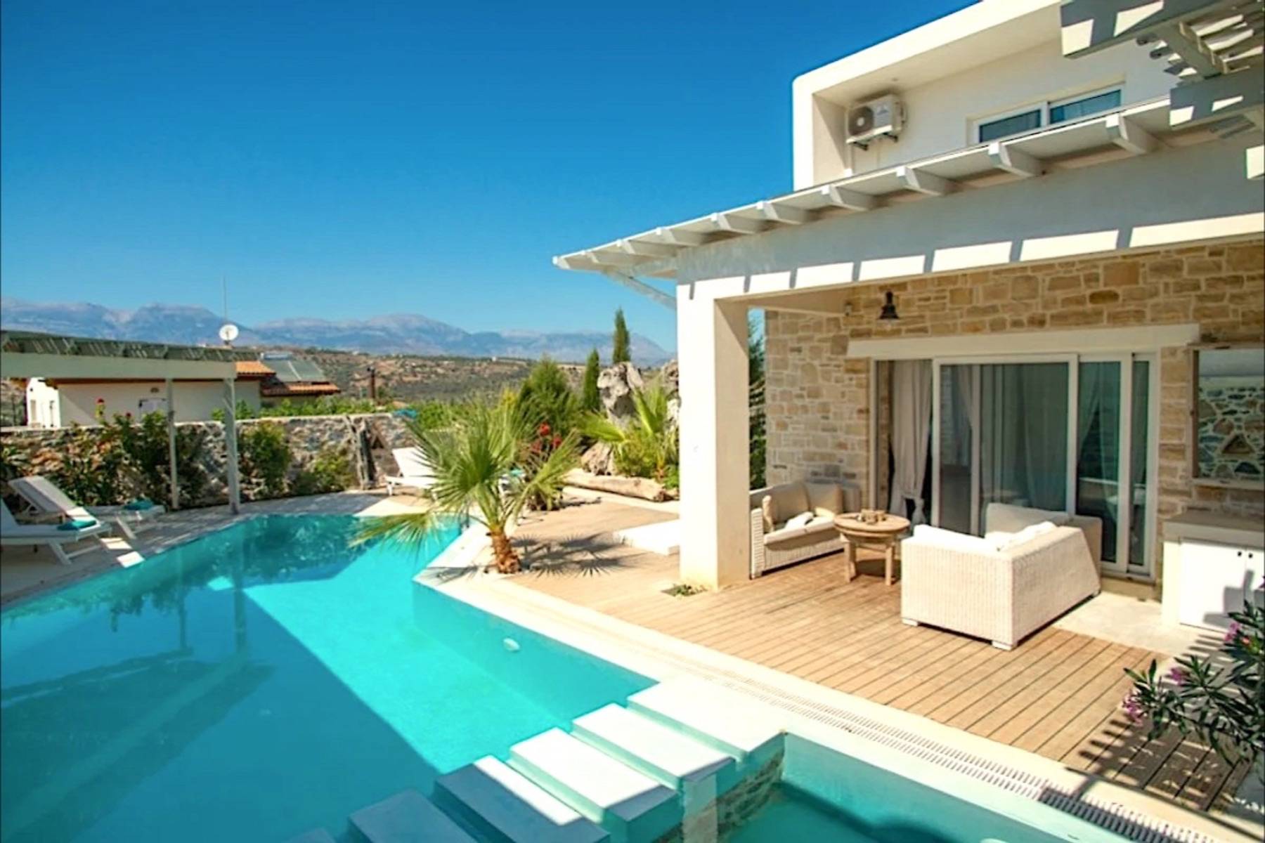 Behaglich helle und luxuriöse Villa auf 2 Etagen am Ortsrand von Pitsidia, nicht abgelegen in idyllisch- ländlicher Umgebung, Sichtgeschützt von Nachbarn, mit Kräutergarten, Parkplatz für 2 PKW, großartiger Blick auf den Psiloritis, der größte Berg von Kreta und dem Ida Gebirge.