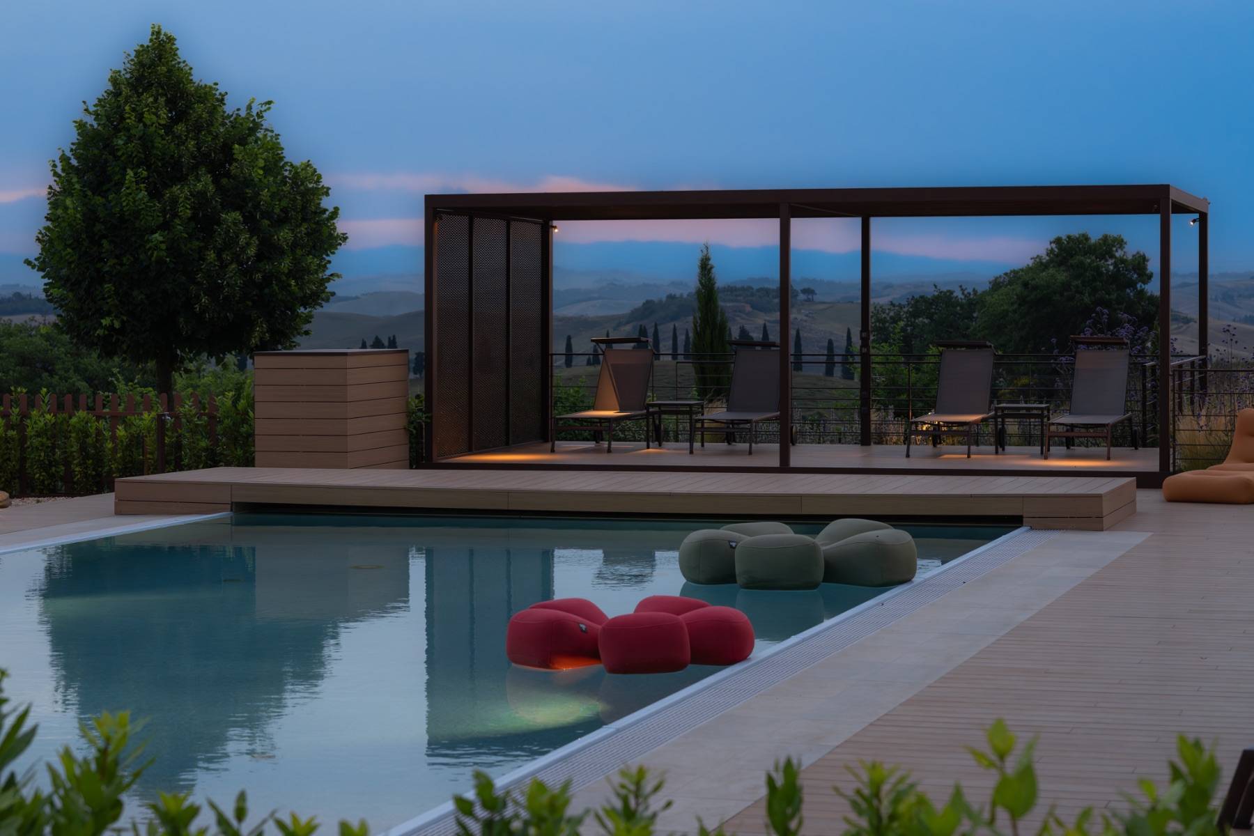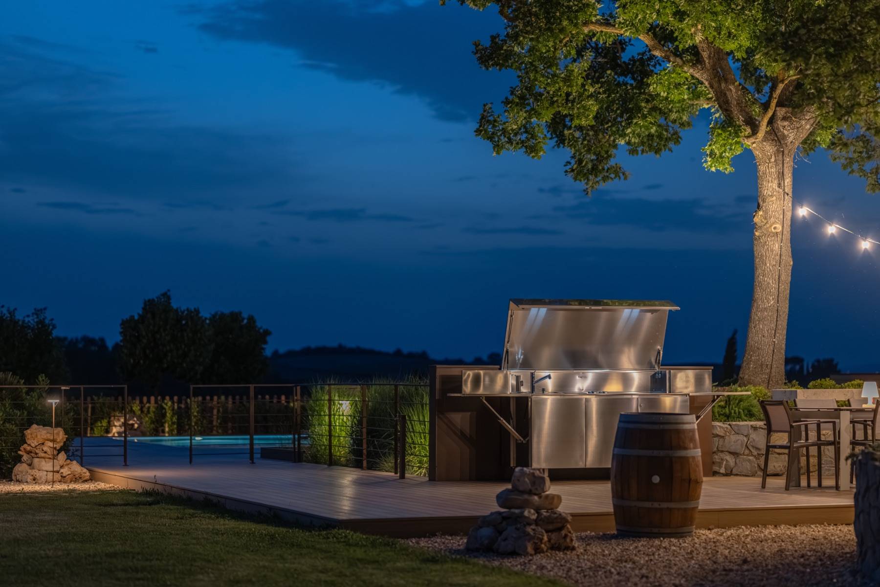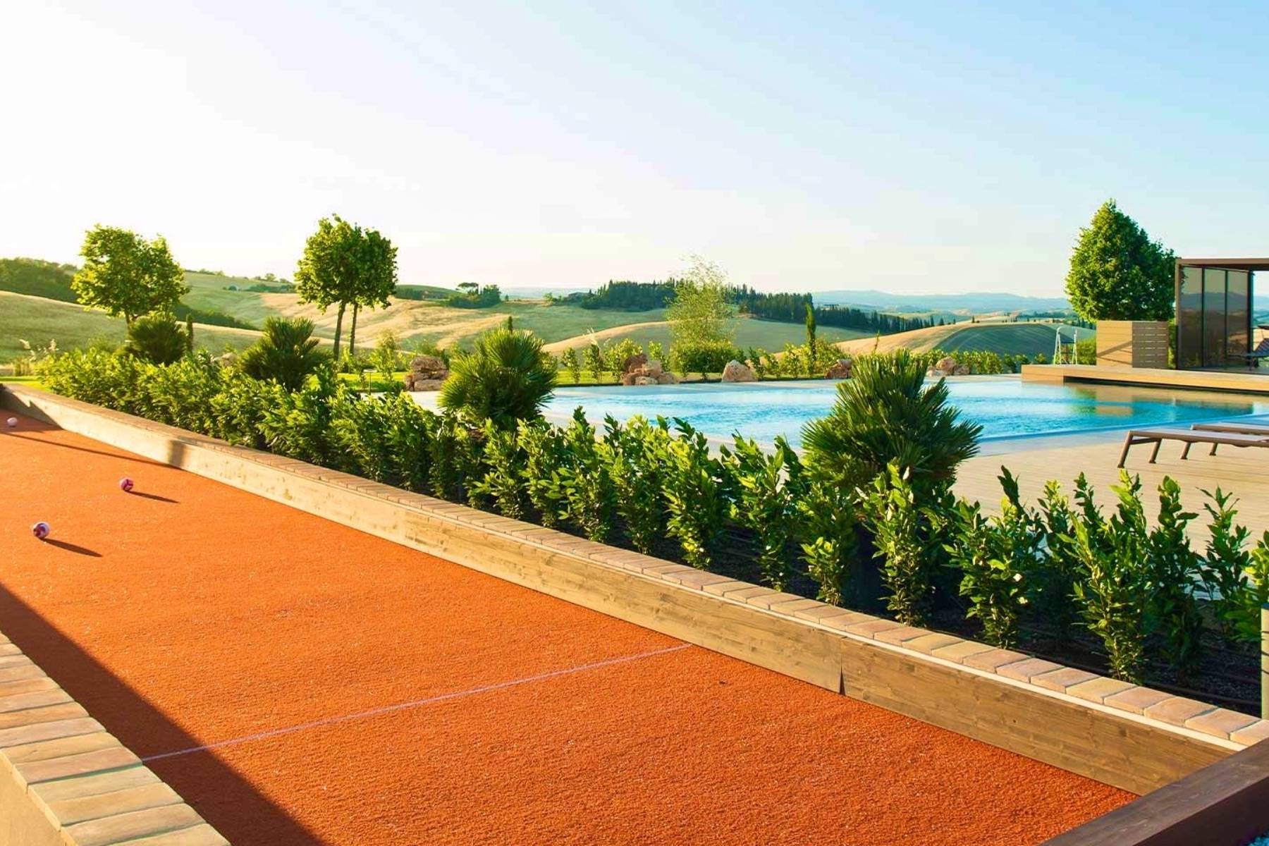 Im Garten befindet sich zudem auch ein Boccia-Platz. Zum Anwesen gehört weiter eine Panorama Loggia mit Whirlpool. Der Infinity-Pool misst 14 mal 6 Meter und wird von einem großen Holzdeck und zwei Pavillons mit jeweils fünf Liegestühlen gesäumt. Der Poolbereich ist so gestaltet, dass die Gäste das Leben im Freien genießen können, mit einem Esstisch für 12 Personen und einer Außenküche mit einem Induktionsherd, einer Teppanyaki-Platte, einem Spülbecken und einem Kühlschrank.