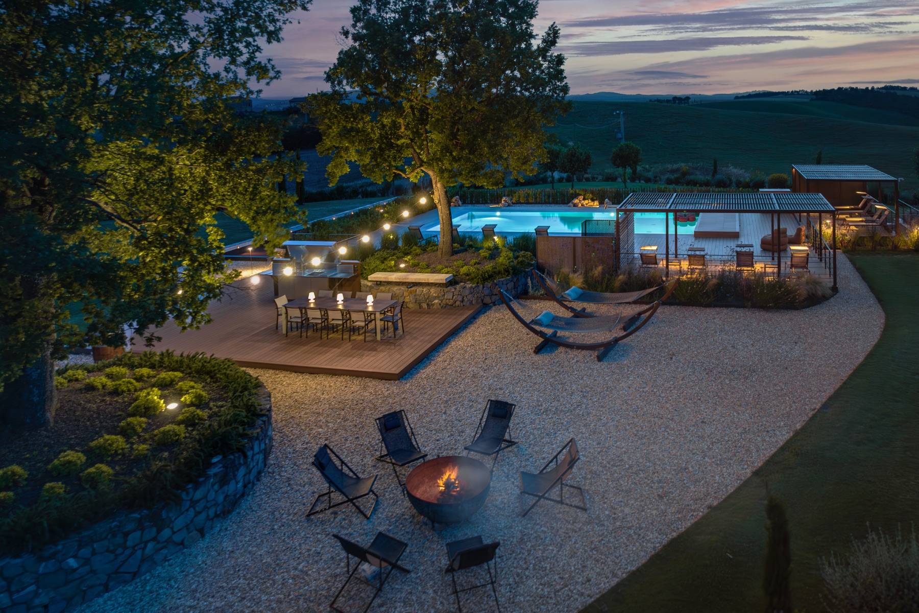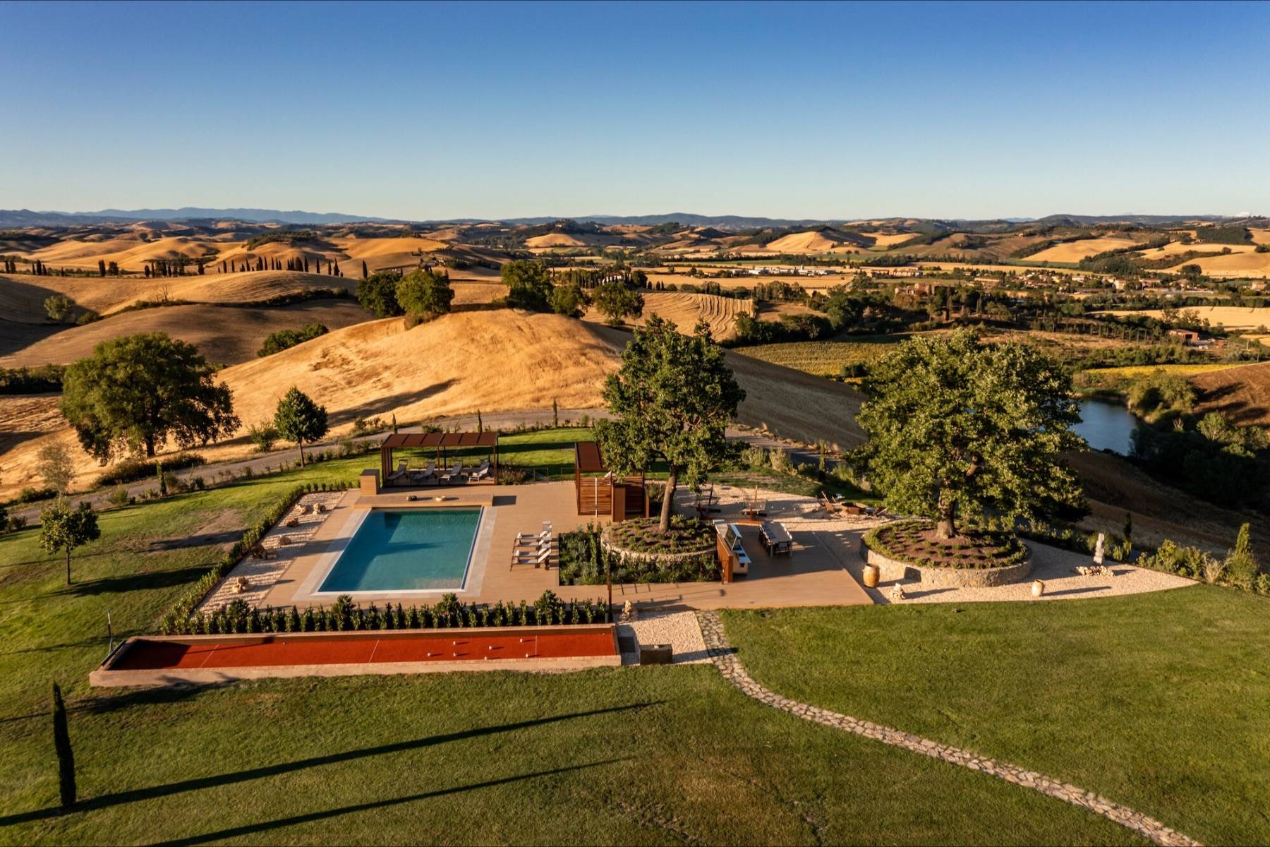 Der Poolbereich verfügt außerdem über eine Sitzecke mit einer Feuerstelle und Liegestühlen, um den Sonnenuntergang zu genießen. Eine Hecke trennt den Poolbereich vom Spielbereich, zu dem ein 18 auf 3 Meter großer Boccia-Platz gehört.