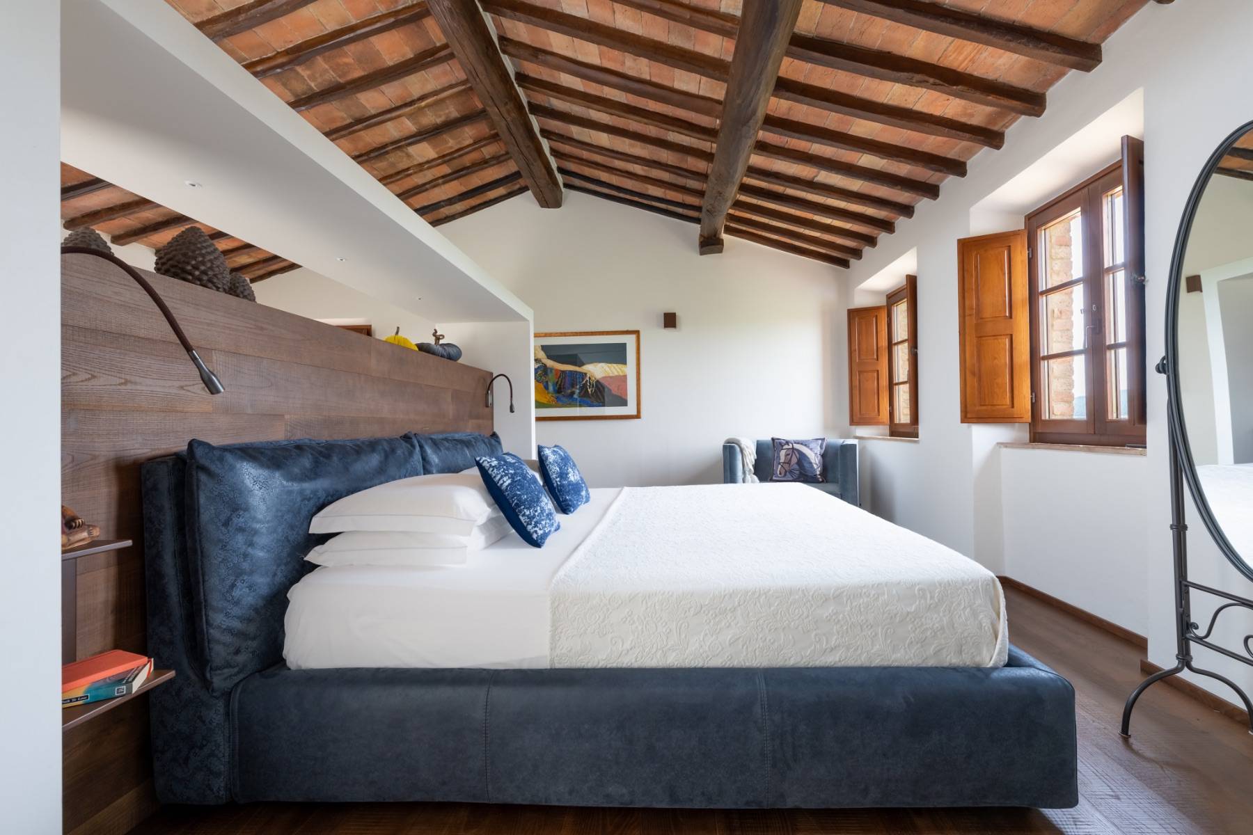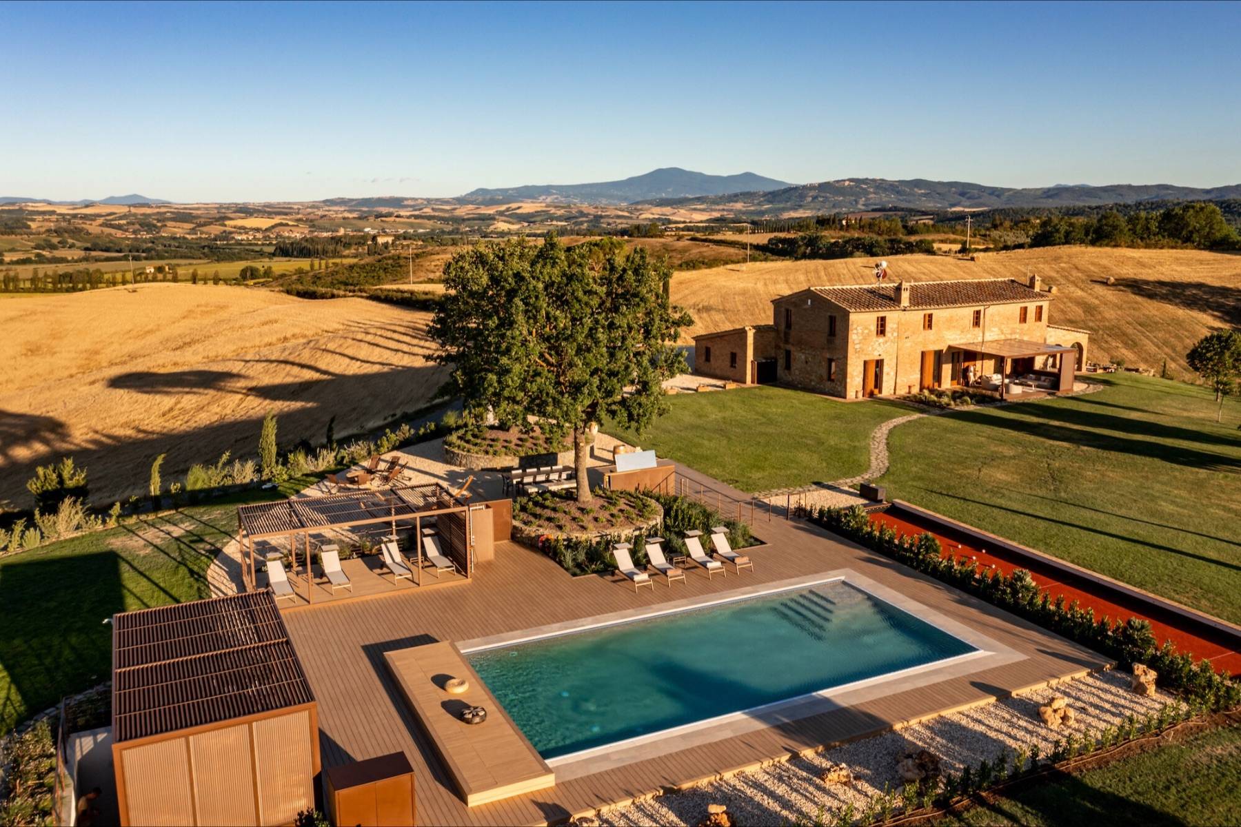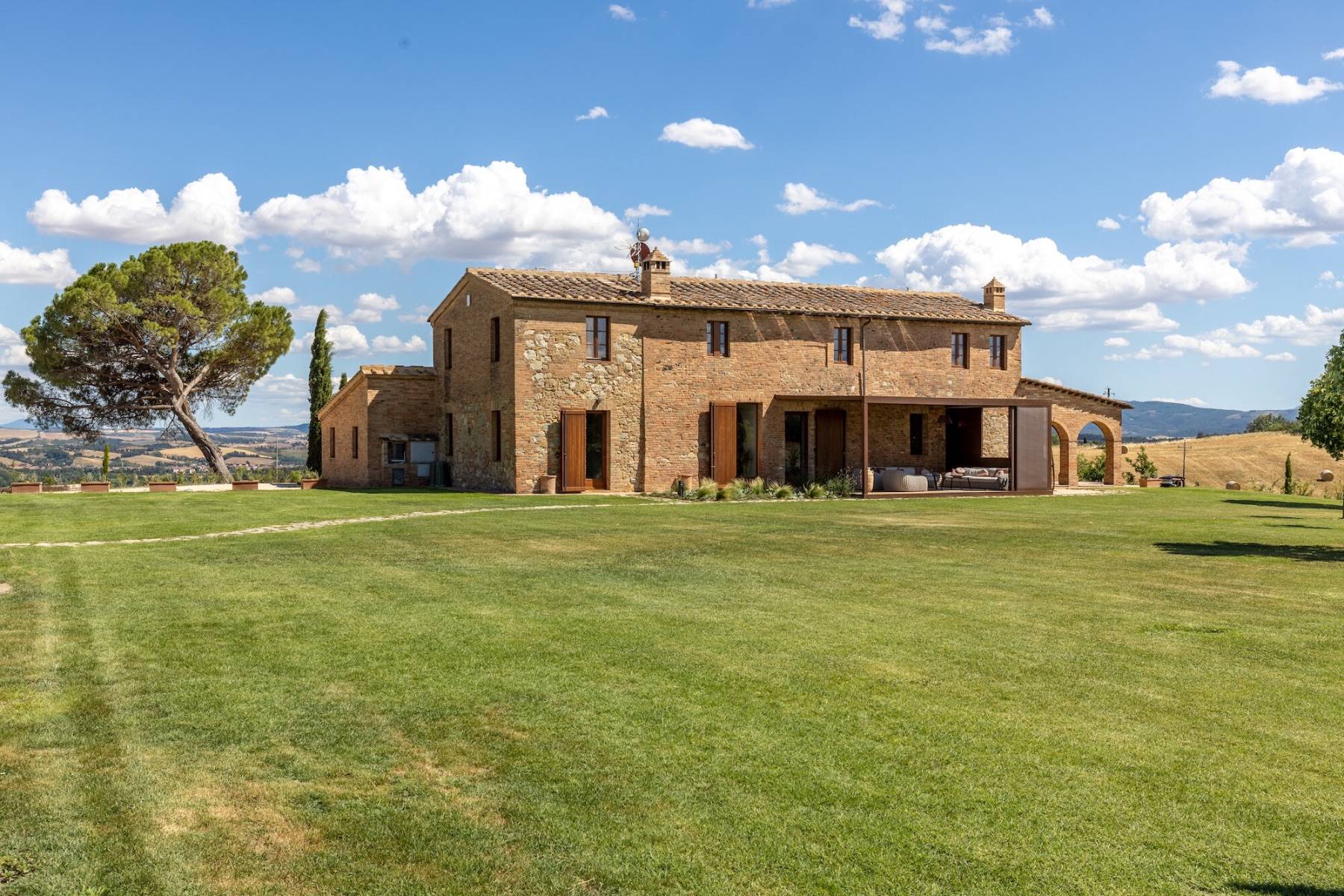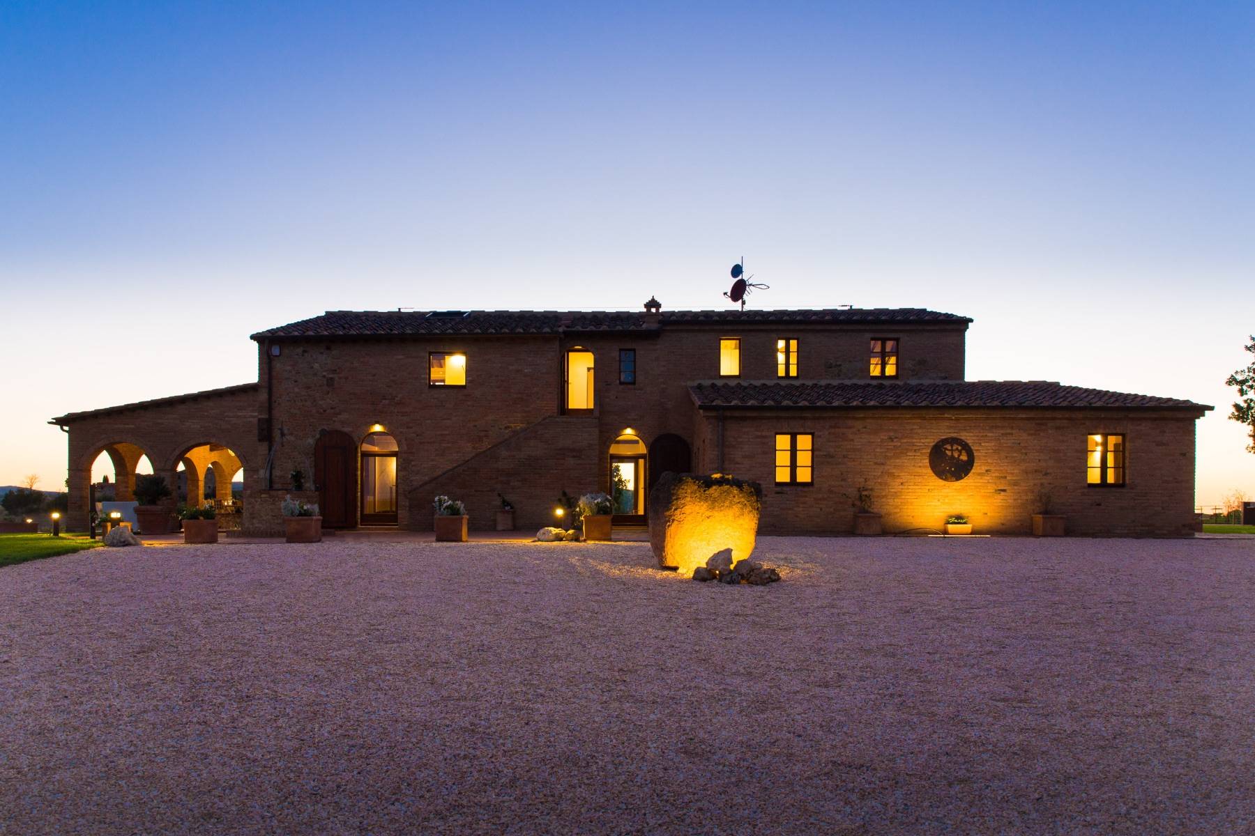 Die Villa liegt auf einem 5 Hektar großen Grundstück, von dem aus man einen atemberaubenden Blick auf die "Crete Senesi" in der Umgebung von Siena geniesst. Die Villa verteilt sich über 2 Ebenen und ist mit toskanischem roten Backstein im Bauernhausstil gebaut. Stein, Travertin und Parkett verbinden sich hier im zeitgenössischen Stil und Design mit den charakteristischen Merkmalen toskanischer Bauernhäuser. Das Haus ist mit 300 Quadratmetern Wohnfläche sehr geräumig und bietet in 5 Doppelzimmern bequem Platz für bis zu 10 Personen. Alle Zimmer sind klimatisiert und haben jeweils ein eigenes Bad.
