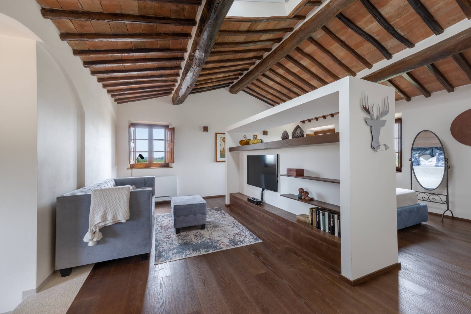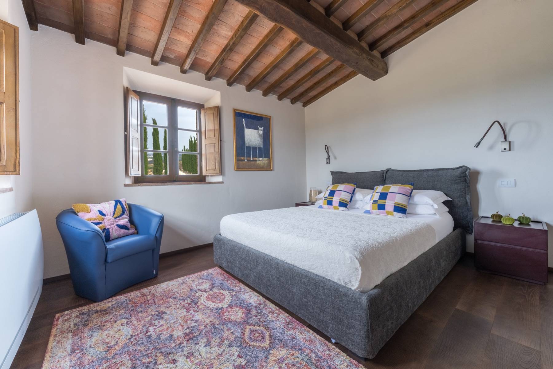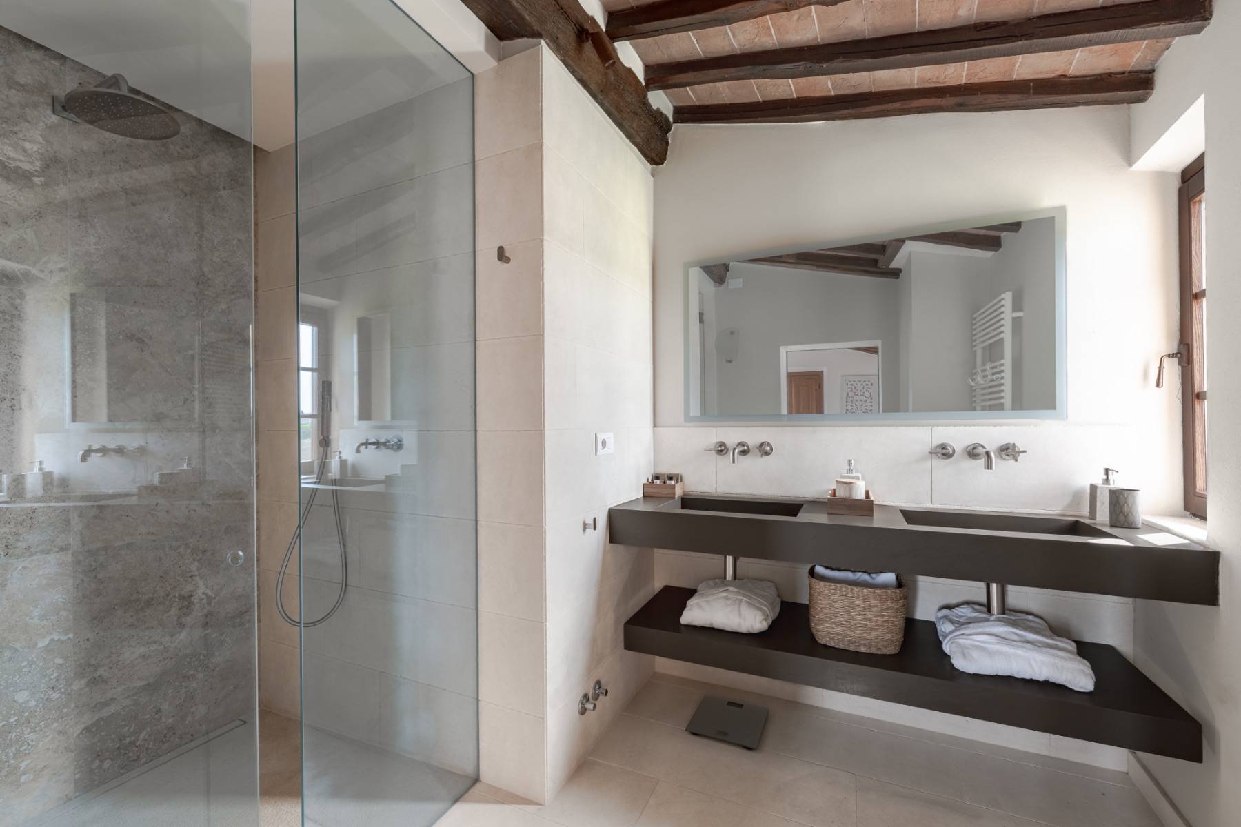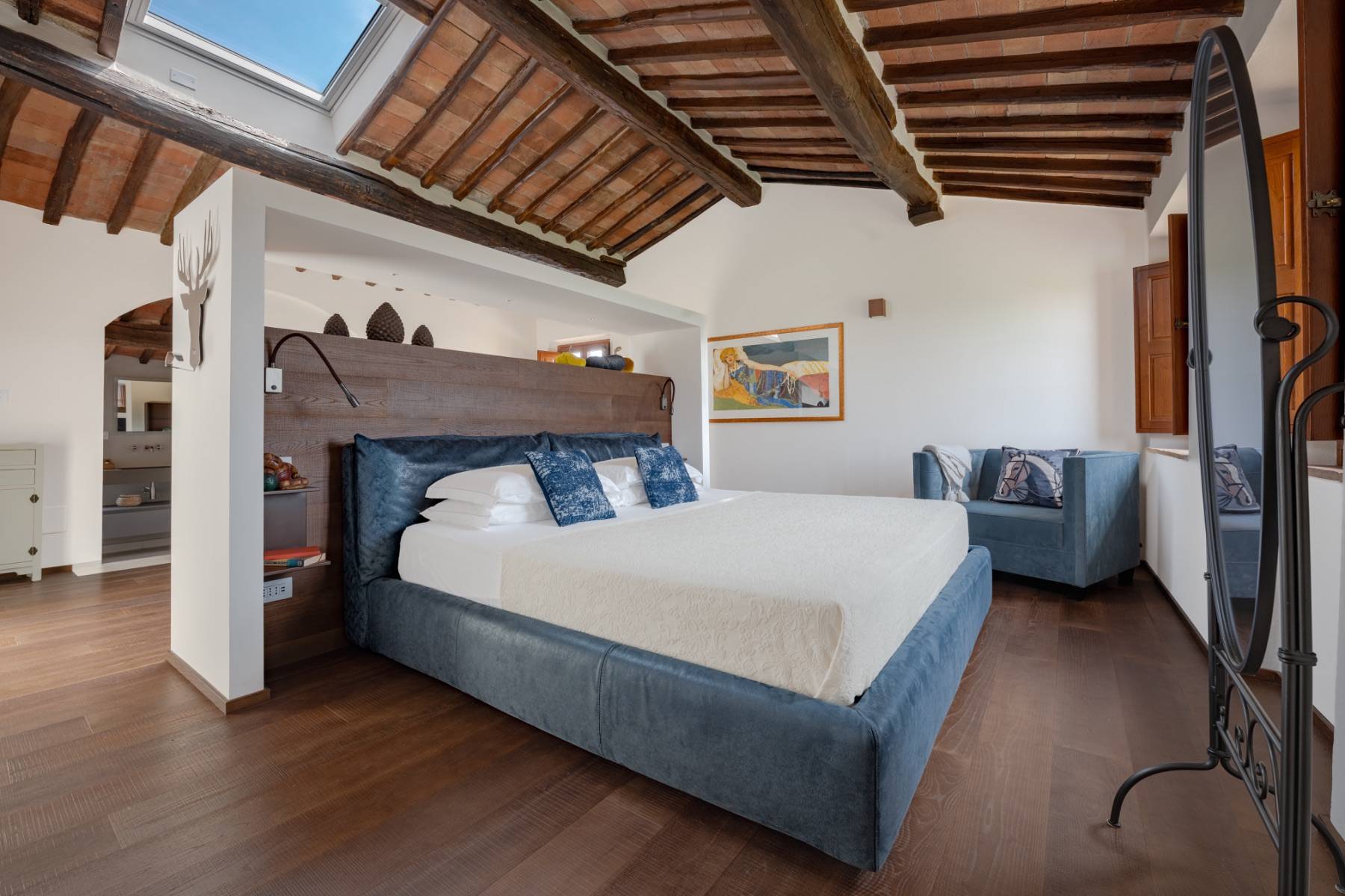Die Villa liegt auf einem 5 Hektar großen Grundstück, von dem aus man einen atemberaubenden Blick auf die "Crete Senesi" in der Umgebung von Siena geniesst. Die Villa verteilt sich über 2 Ebenen und ist mit toskanischem roten Backstein im Bauernhausstil gebaut. Stein, Travertin und Parkett verbinden sich hier im zeitgenössischen Stil und Design mit den charakteristischen Merkmalen toskanischer Bauernhäuser. Das Haus ist mit 300 Quadratmetern Wohnfläche sehr geräumig und bietet in 5 Doppelzimmern bequem Platz für bis zu 10 Personen. Alle Zimmer sind klimatisiert und haben jeweils ein eigenes Bad.