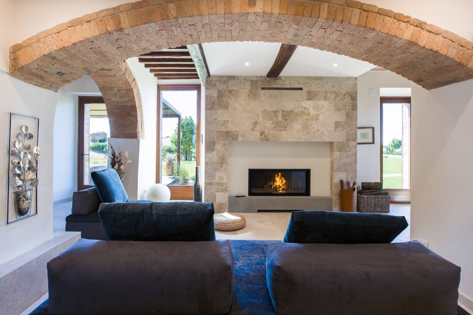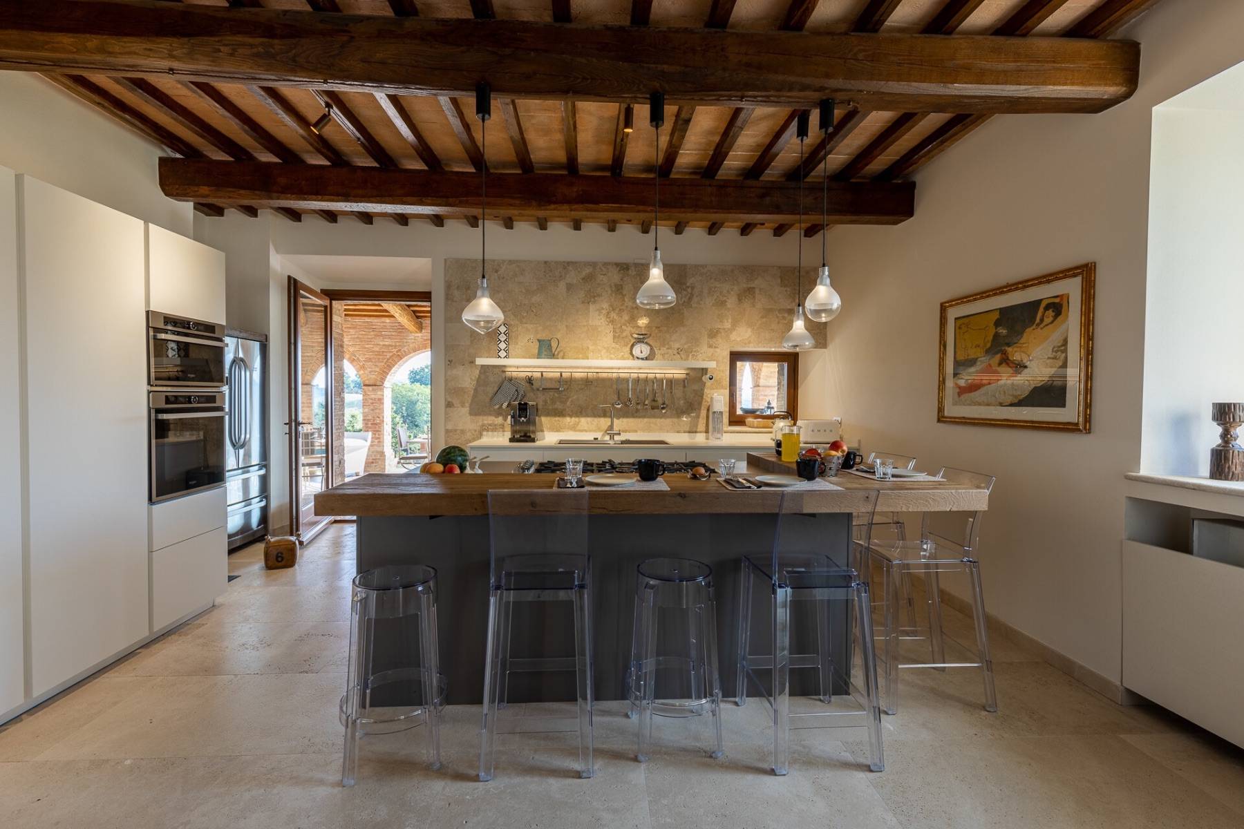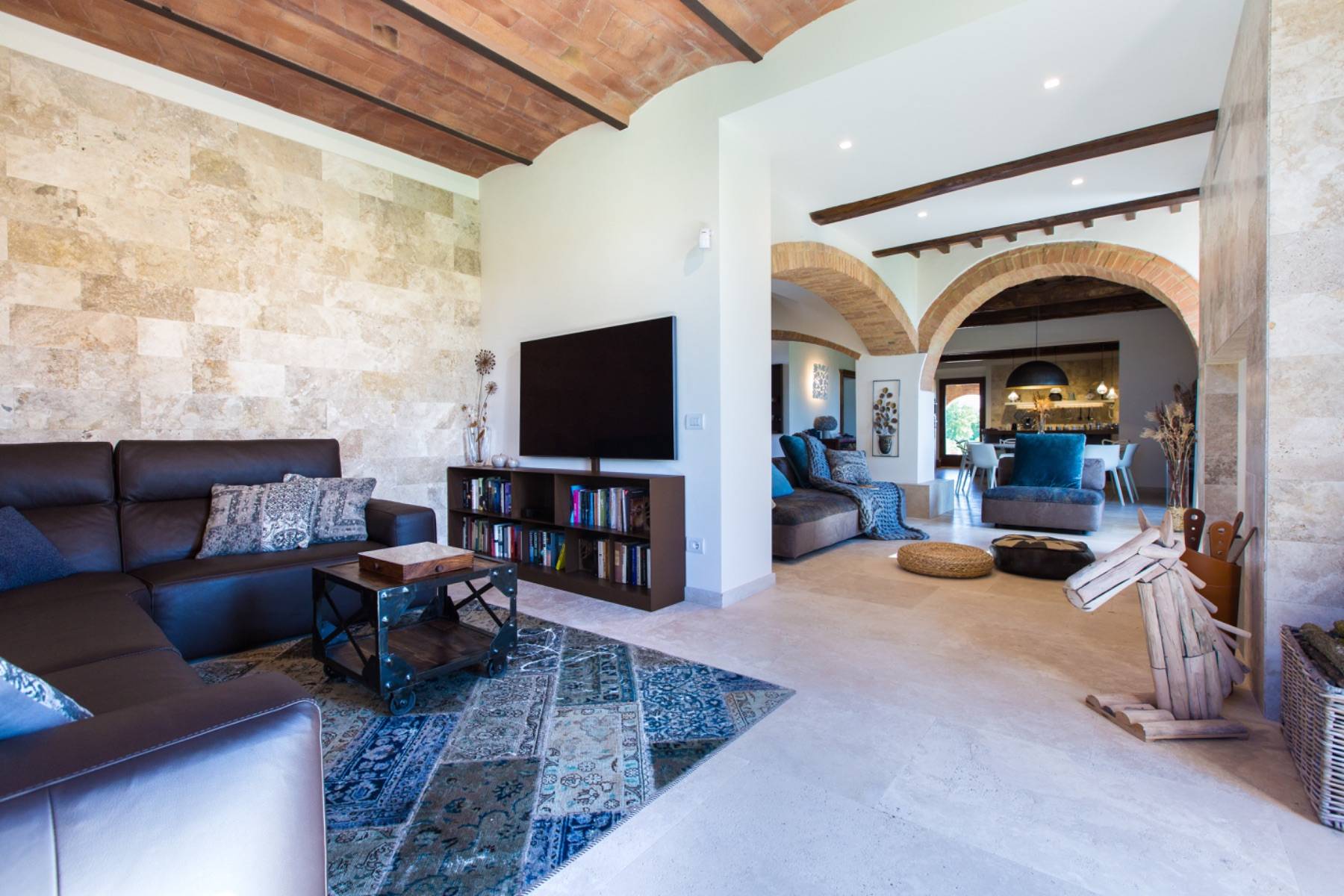 Die Villa verfügt über einen großen Wohnbereich mit einer offenen Küche, einem Esszimmer, einem Kaminzimmer und einem Fernsehzimmer. In der Nähe der Küche befindet sich ein geräumiger Snackbereich, ein Wohnzimmer mit einem runden Esstisch für 10 Personen und zwei Loungebereiche. Das Wohnzimmer ist ideal, um den traditionellen Travertin-Kamin zu genießen.