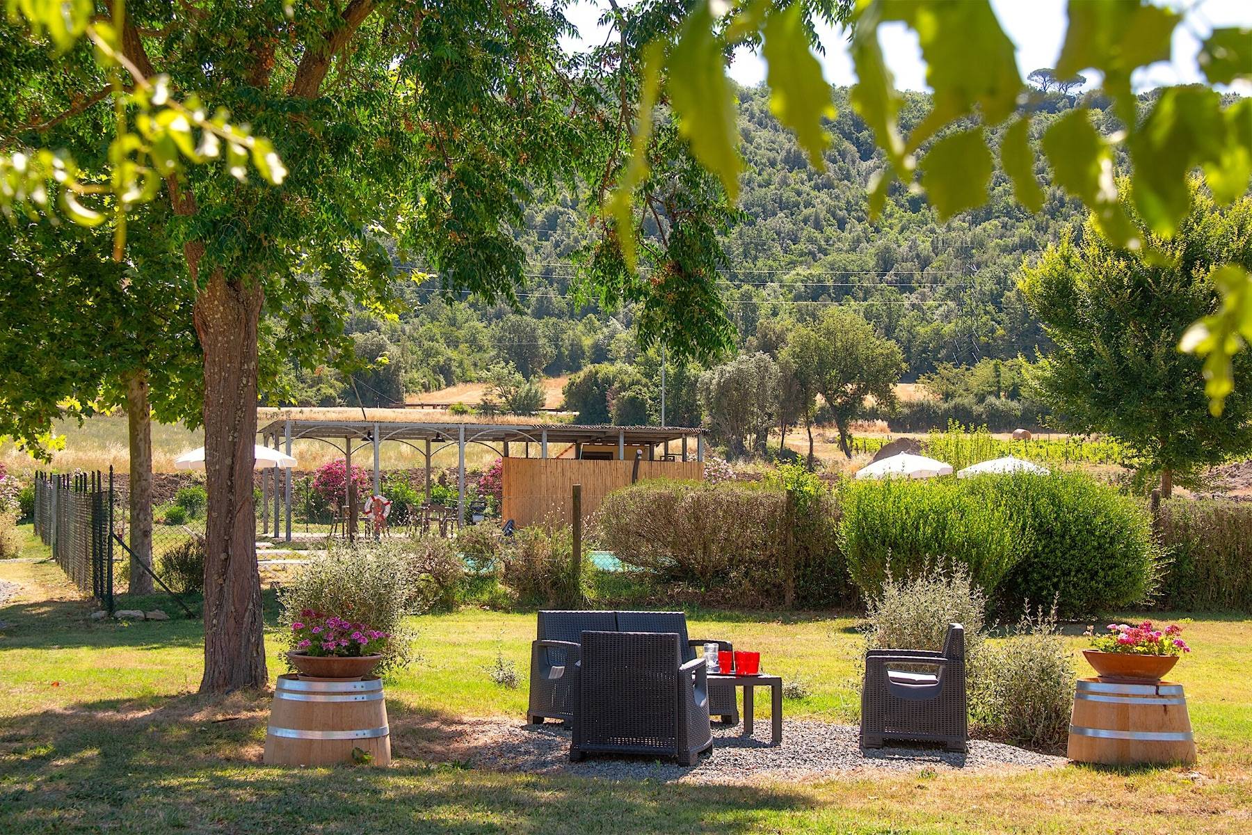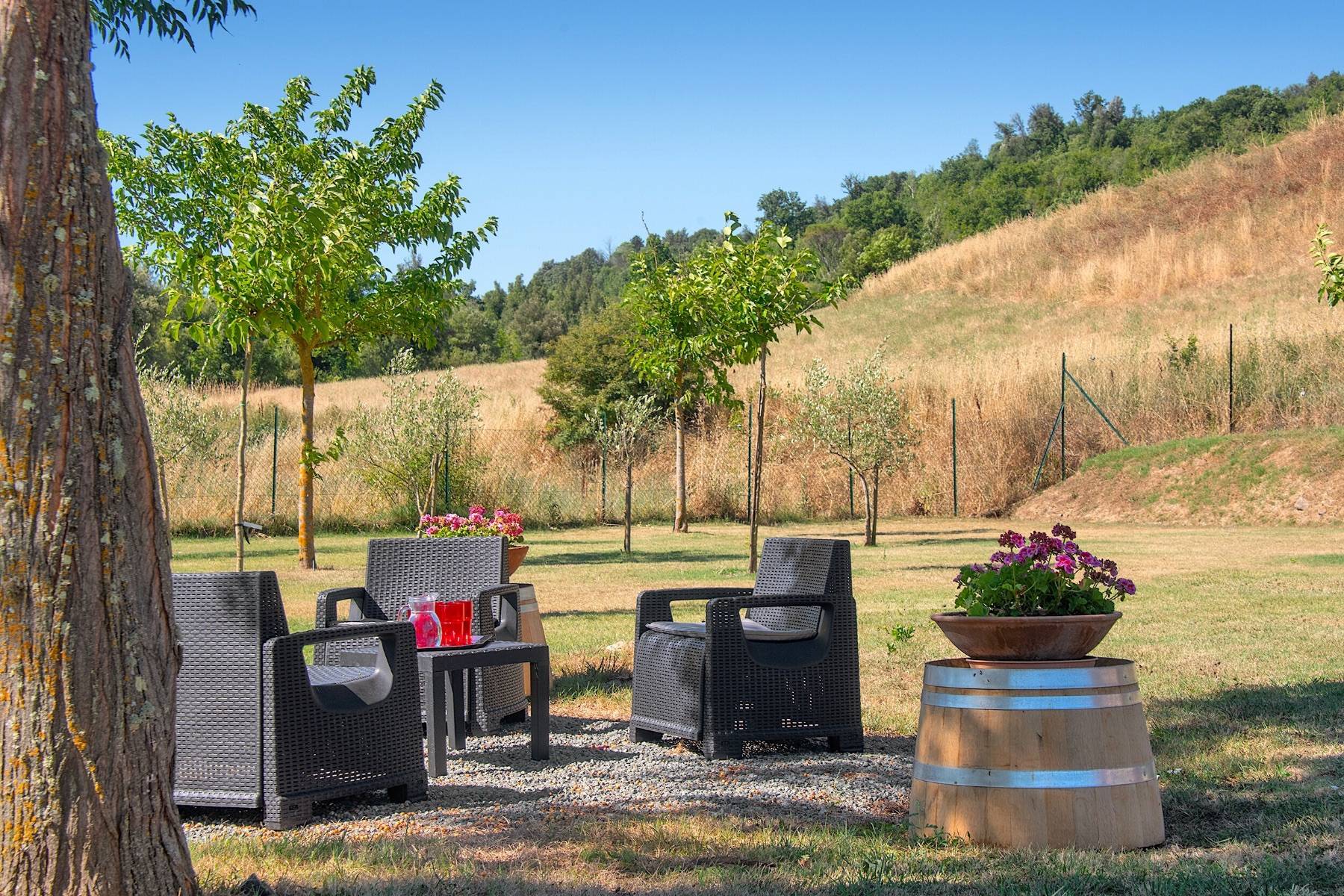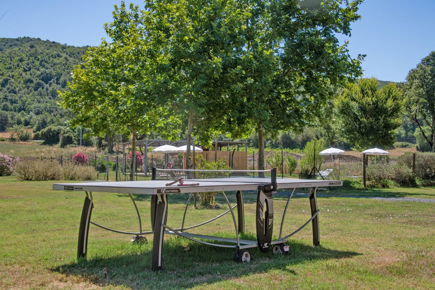 Zahlreiche Bäume und Sträucher sind auf dem weitläufigen Grundstück verteilt, an deren Ende hohe und dichte Bäume als Windschutz fungieren. Insbesondere im Sommer ist der große Pool eine willkommene Abkühlung, der zudem von einem eigenen Zaun zur Sicherheit der Kleinen umgeben ist.