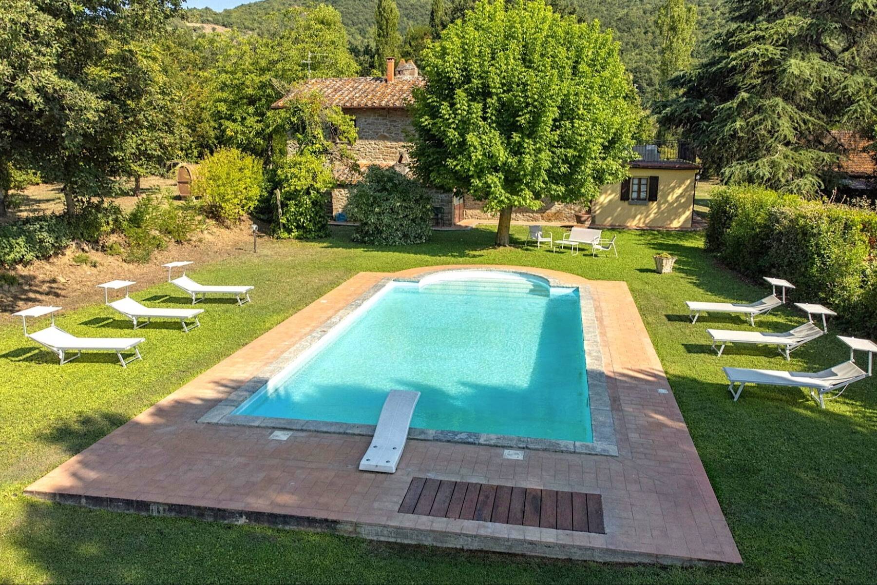 Es ist der perfekte Ort, um mit Familie und Freunden einen wohlverdienten Urlaub zu verbringen. Auch euer Hund ist hier herzlich willkommen. Die Anlage bietet ein großes Spielfeld für Fußballspiele und einen geschützten Poolbereich, der durch ein Eingangstor gesichert ist. Der Pool misst 10 x 5 Meter und hat eine Tiefe von 1,23 bis 1,80 Meter. Er ist mit Liegen ausgestattet und bietet tagsüber einen herrlichen Blick auf die Stadt Cortona. Vor der Küche steht eine Pergola mit einem großen Tisch für gemeinsame Mahlzeiten im Freien. Parkingmöglichkeiten für Autos sind ebenfalls auf dem Grundstück vorhanden.