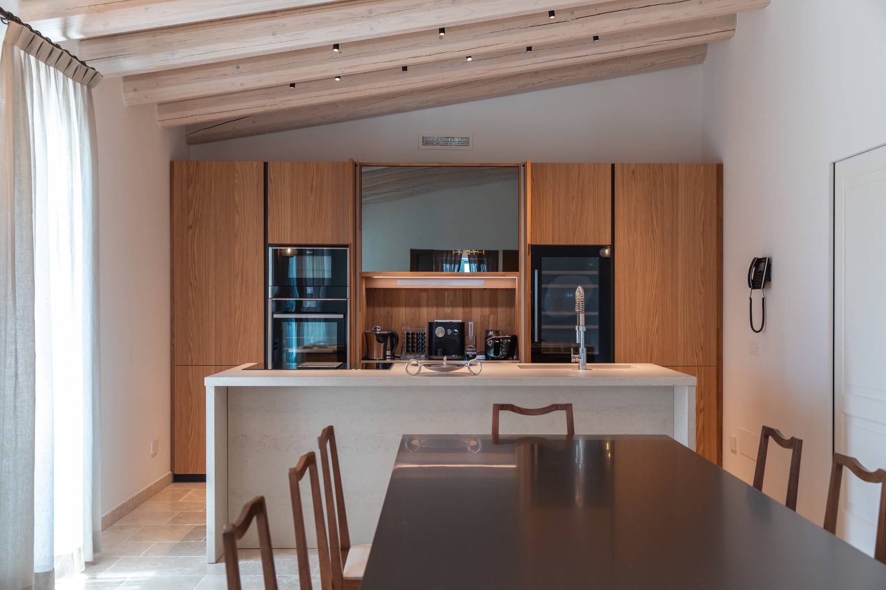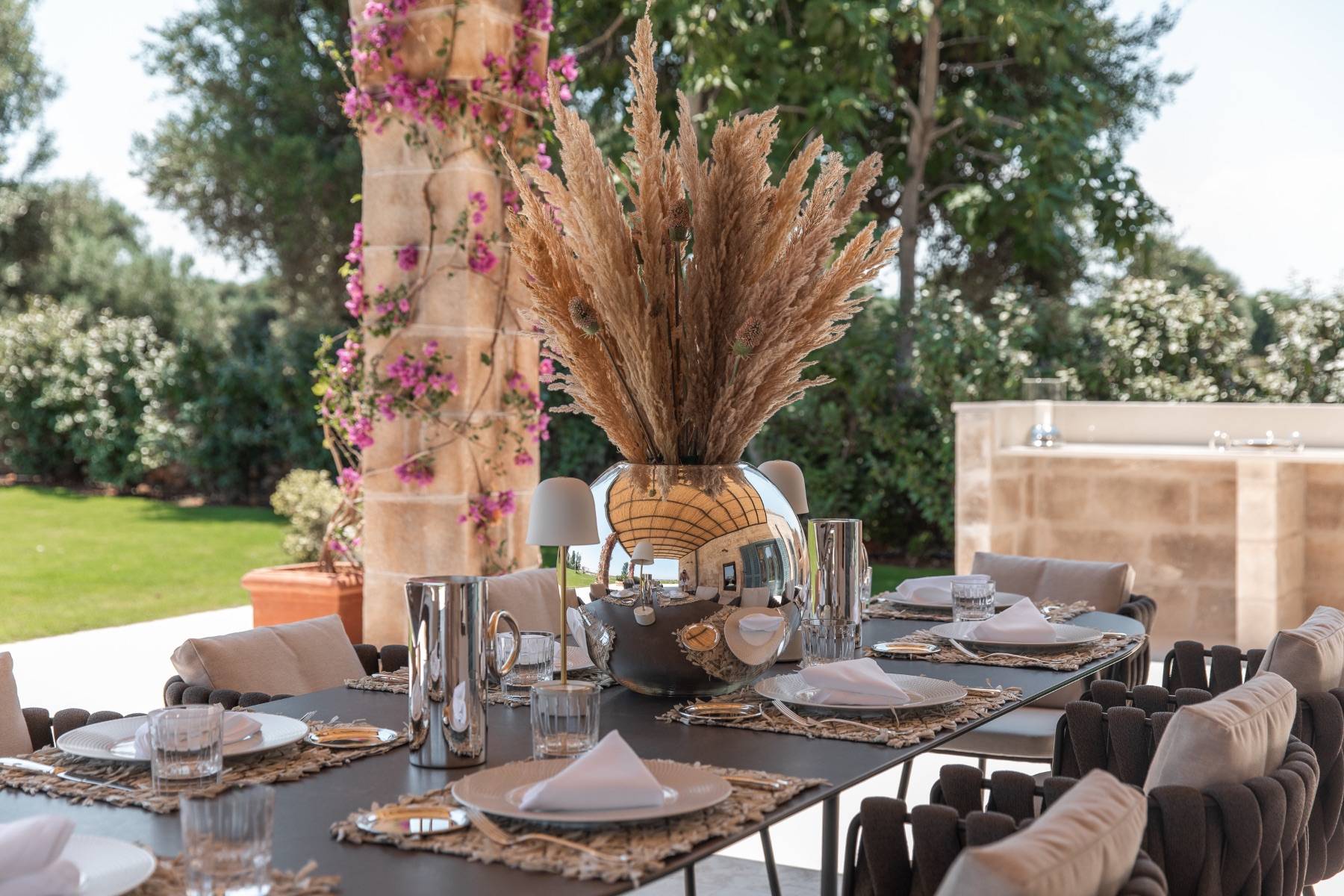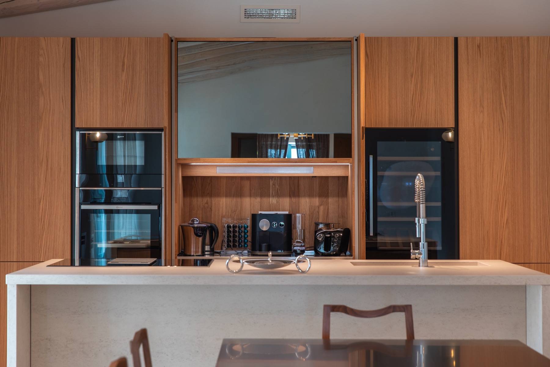 Die Küche ist bestens ausgestattet und lädt zu einem edlen Dinner ein. Hochwertige Elektrogeräte, ein Weinkühlschrank und Besteck von Cristofle untermauern die Wertigkeit dieser extravaganten Villa.