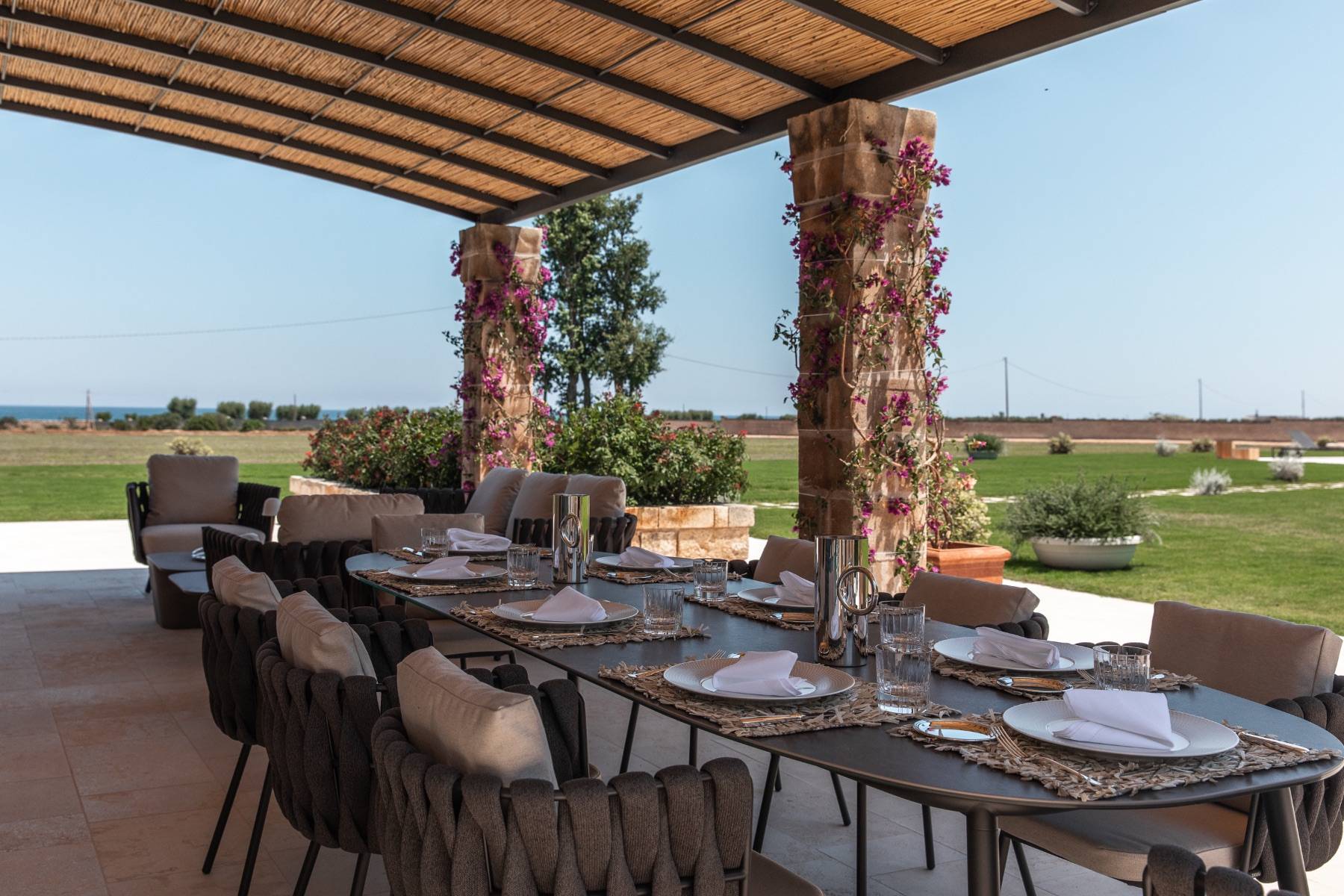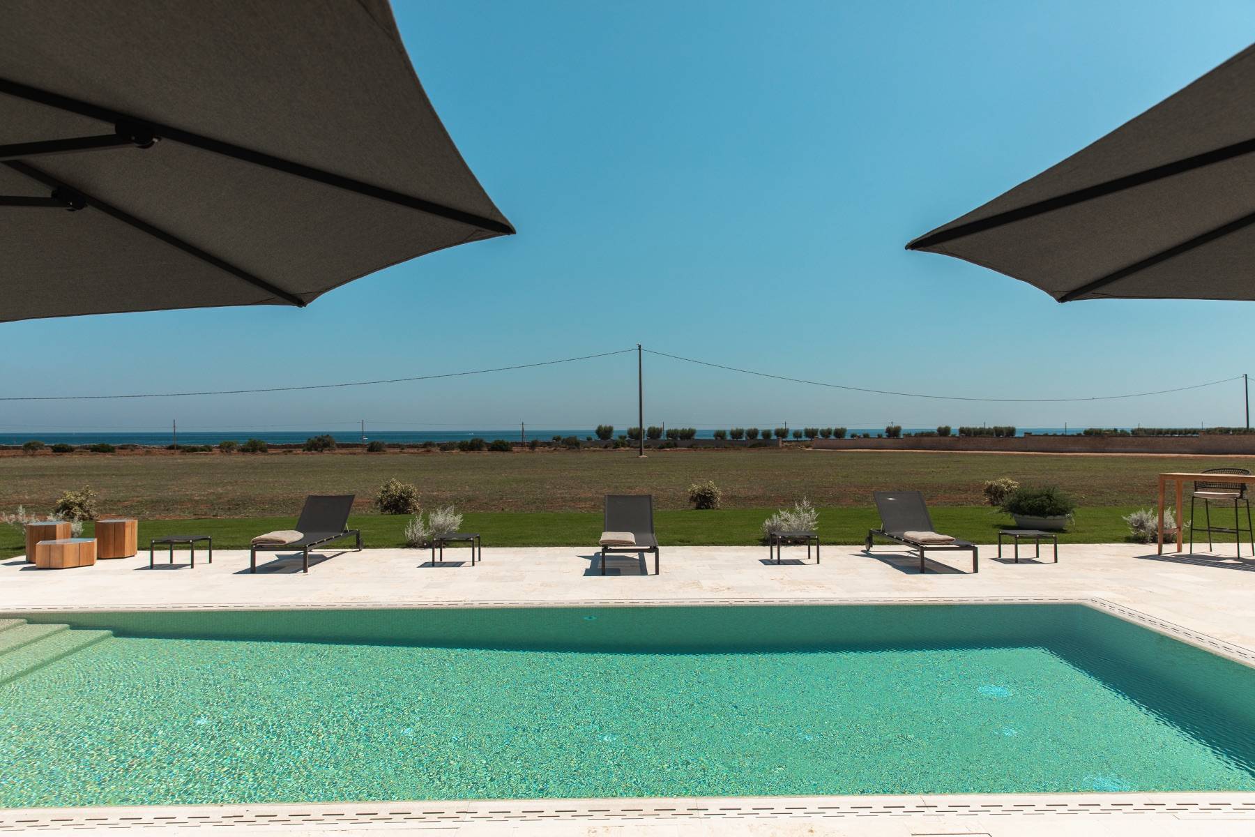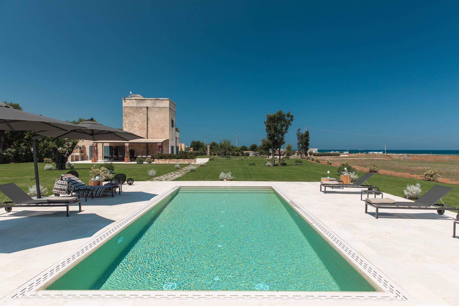 Auch im Freien bietet die Villa höchsten Komfort. Der Pool kann beheizt werden und ist mit ausreichend Sonnenliegen und Sonnenschirmen bestückt. Es gibt eine Bar und einen grossen Speisetisch, eine schöne Terrasse und insgesamt ein etwa 5 Hektar grosses Grundstück, dass sich zur Küste und in die Weite öffnet.