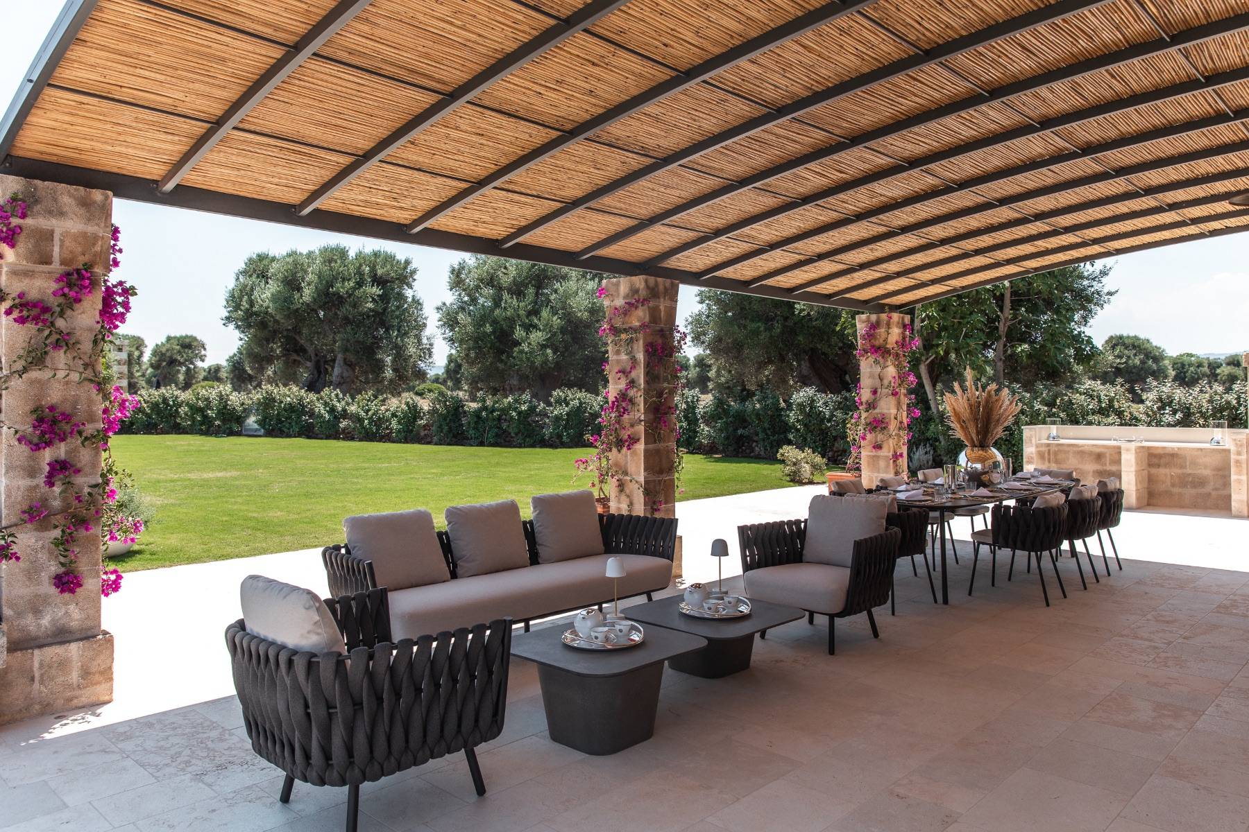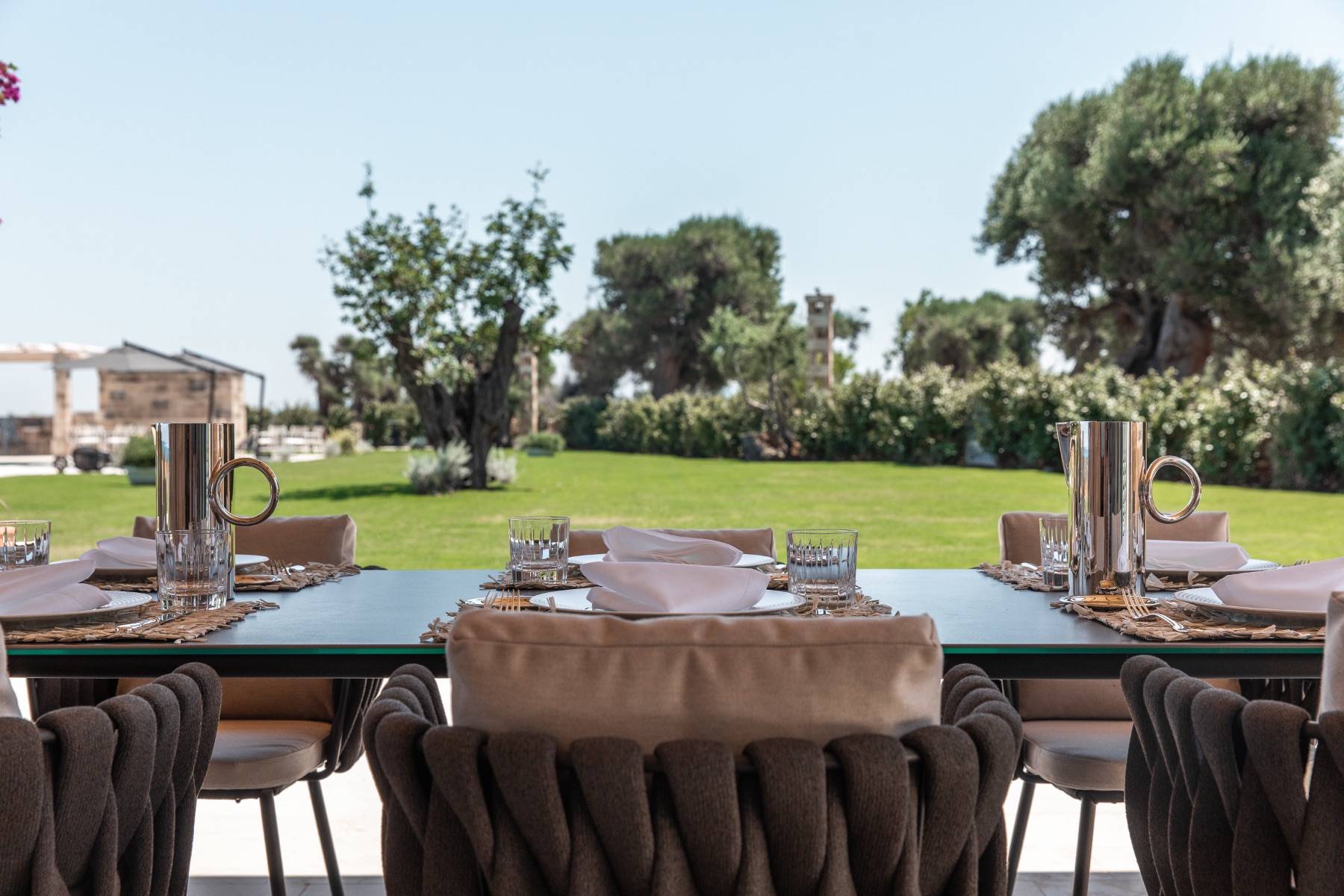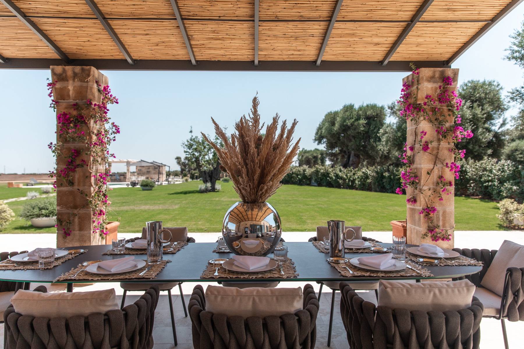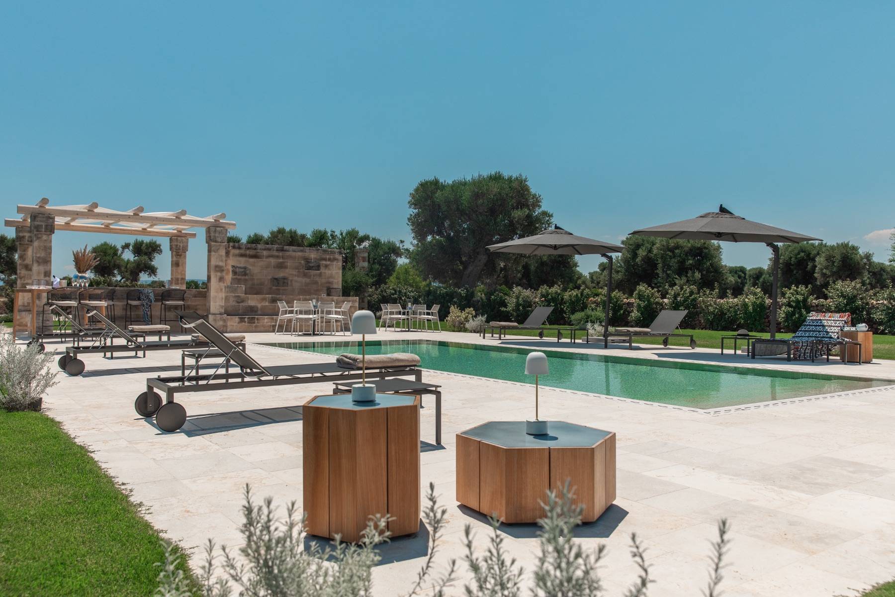Auch im Freien bietet die Villa höchsten Komfort. Der Pool kann beheizt werden und ist mit ausreichend Sonnenliegen und Sonnenschirmen bestückt. Es gibt eine Bar und einen grossen Speisetisch, eine schöne Terrasse und insgesamt ein etwa 5 Hektar grosses Grundstück, dass sich zur Küste und in die Weite öffnet.