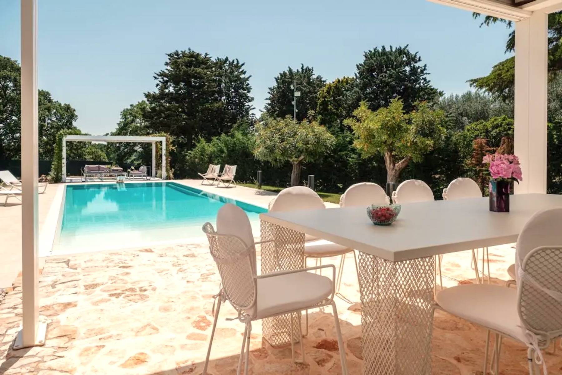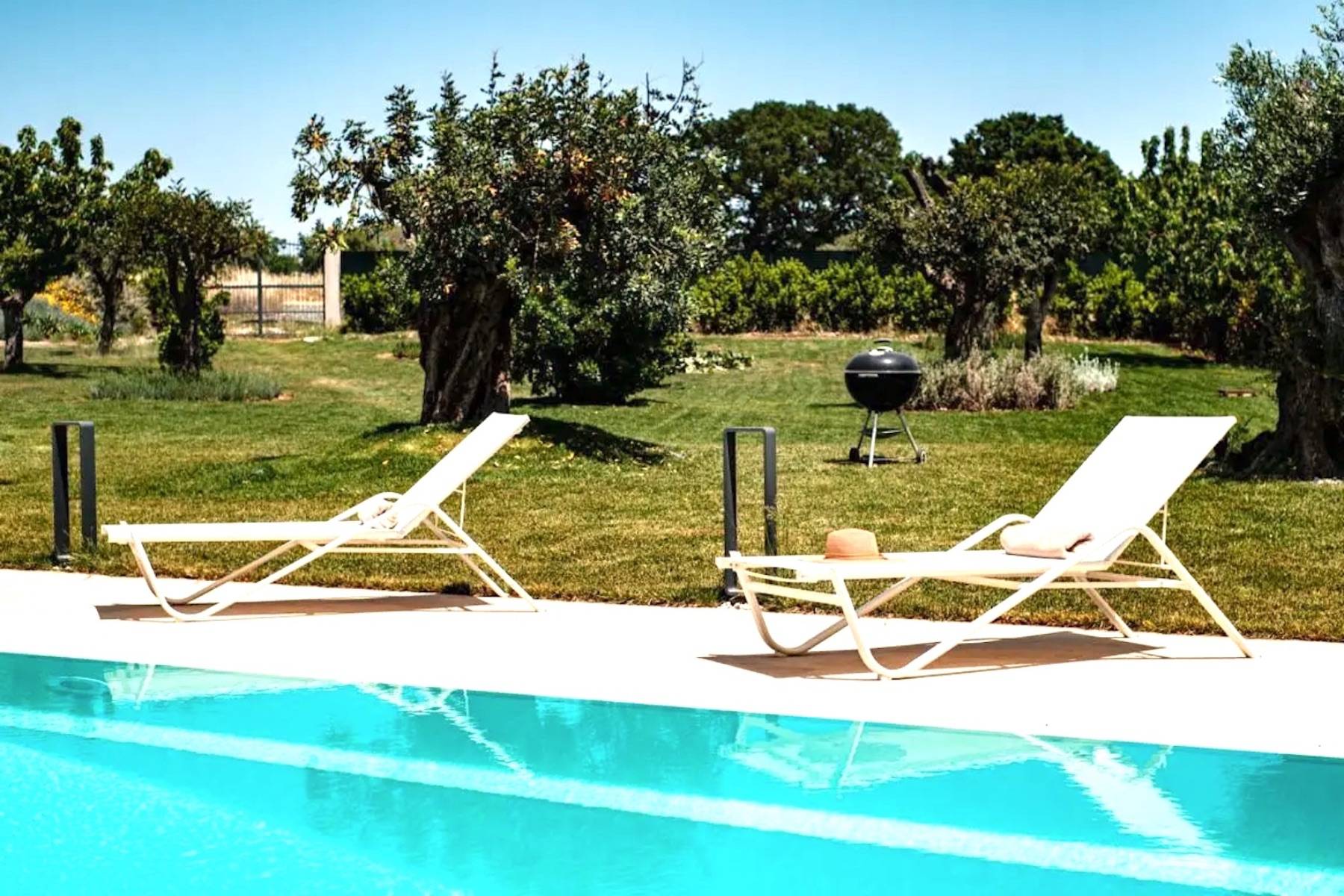 Der Swimmingpool ist das Highlight des Außenbereichs; das Blau des Wassers bildet den perfekten Kontrast zum Grün der Bäume und des Rasens, die ihn umgeben. Der Pavillon mit Sofas bietet eine Oase der Ruhe an heißen Sommertagen. Der gepflegte englische Rasen mit Obstbäumen und Blumen umgibt die gesamte Anlage.