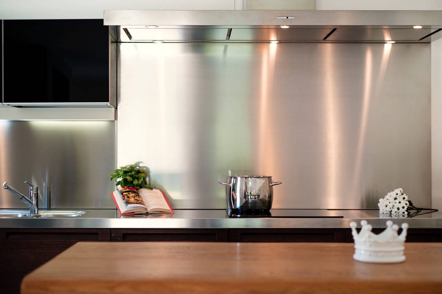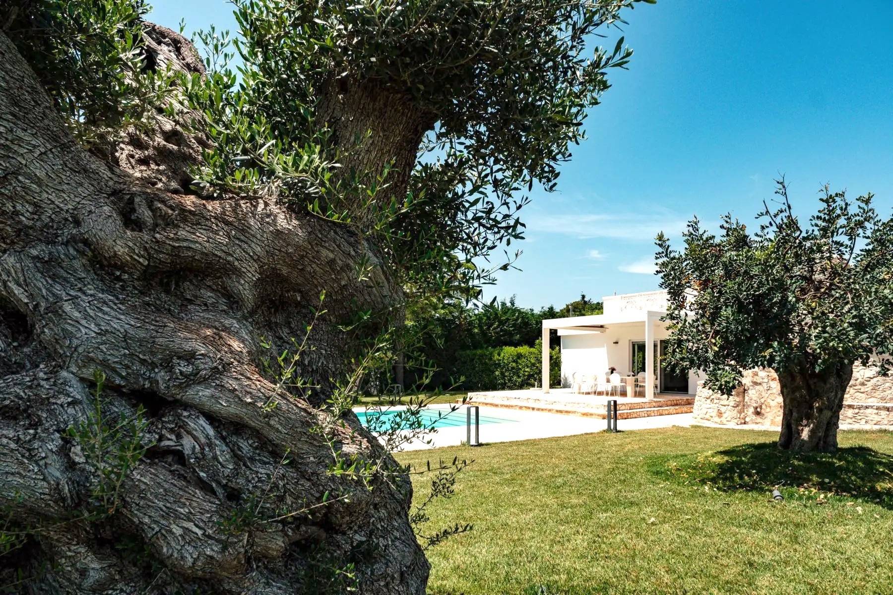 Die perfekte Kombination aus Moderne und Tradition: Das große, moderne Wohnzimmer mit offener Küche ist perfekt mit dem Flur verbunden, der zum Schlafbereich führt, der aus einem Trullo herausgearbeitet wurde. Der Trullo im Freien, der ein Schlafzimmer mit eigenem Bad beherbergt, fügt sich perfekt in die grüne Weite des perfekt gepflegten Rasens ein.