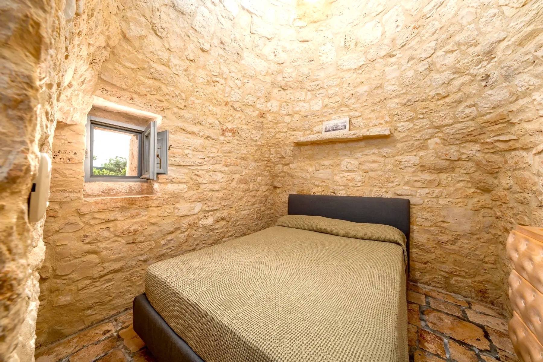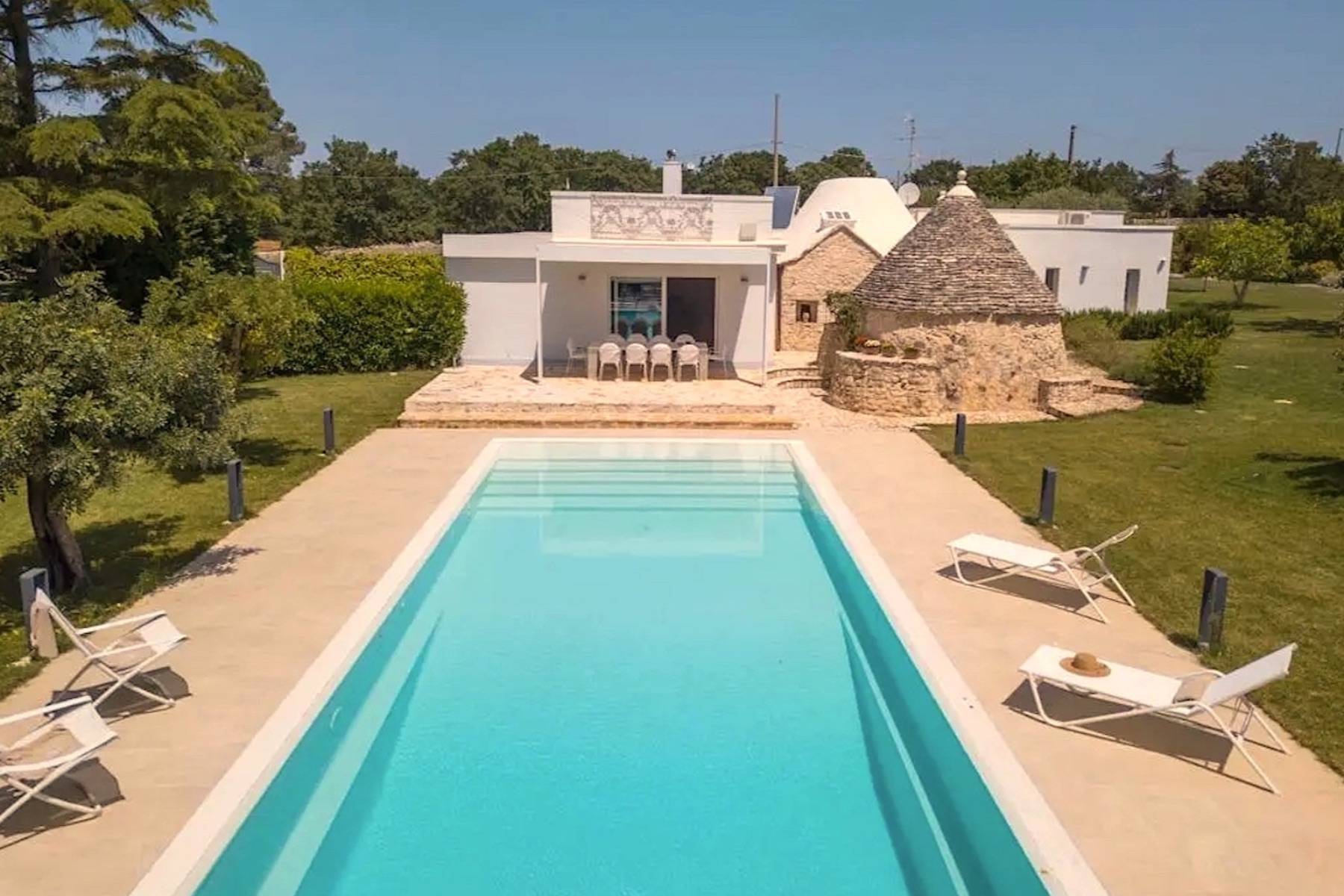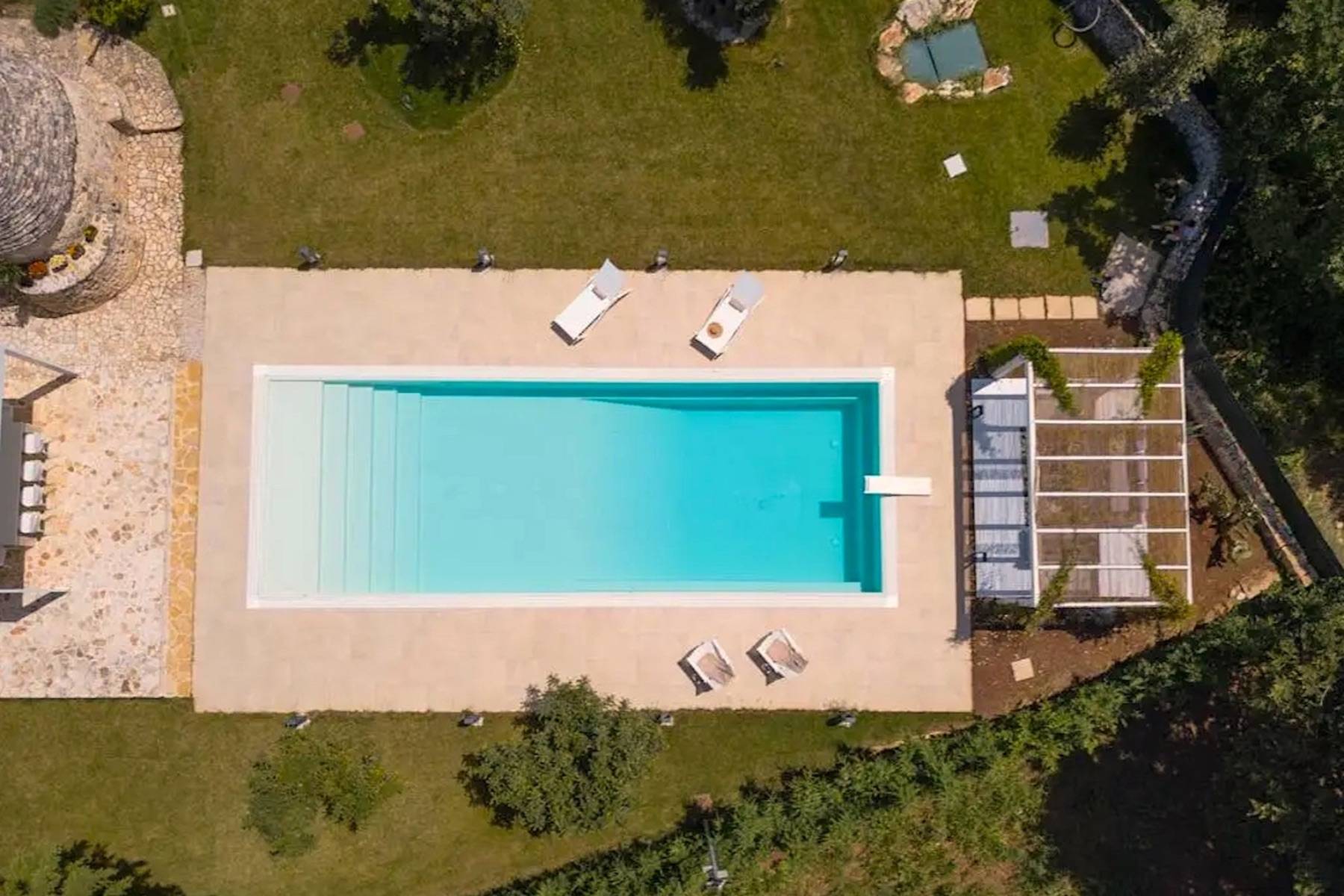 Der Trulli Paolino verfügt über ein zentrales Gebäude und einen Trullo. Der zentrale Teil besteht aus dem großen Wohnzimmer mit offener Küche und zeichnet sich durch große Fenster mit Blick auf den Pool und den umliegenden Rasen aus. Der große Kamin dominiert den Raum und verleiht ihm einen modernen Touch, der auch durch die Designerlampen und die Stahlküche unterstrichen wird. Von hier aus gelangt man in den Flur, der einen in die Vergangenheit zurückversetzt: Ein typischer Trullo mit freiliegenden Steinen bietet Zugang zu einem modernen Schlafzimmer mit Doppelbett und eigenem Bad mit Dusche und großem Fenster mit Blick auf den Rasen, einem traditionellen Schlafzimmer, das aus einem Trullo herausgearbeitet wurde, und einem weiteren Bad, das ebenfalls in den Trullo eingebaut wurde, ein kleiner Raum wird als Abstellraum genutzt. Vom Wohnzimmer aus gelangt man über die möblierte Terrasse, die mit einem großen Tisch für Mahlzeiten im Freien ausgestattet ist, in den Poolbereich.