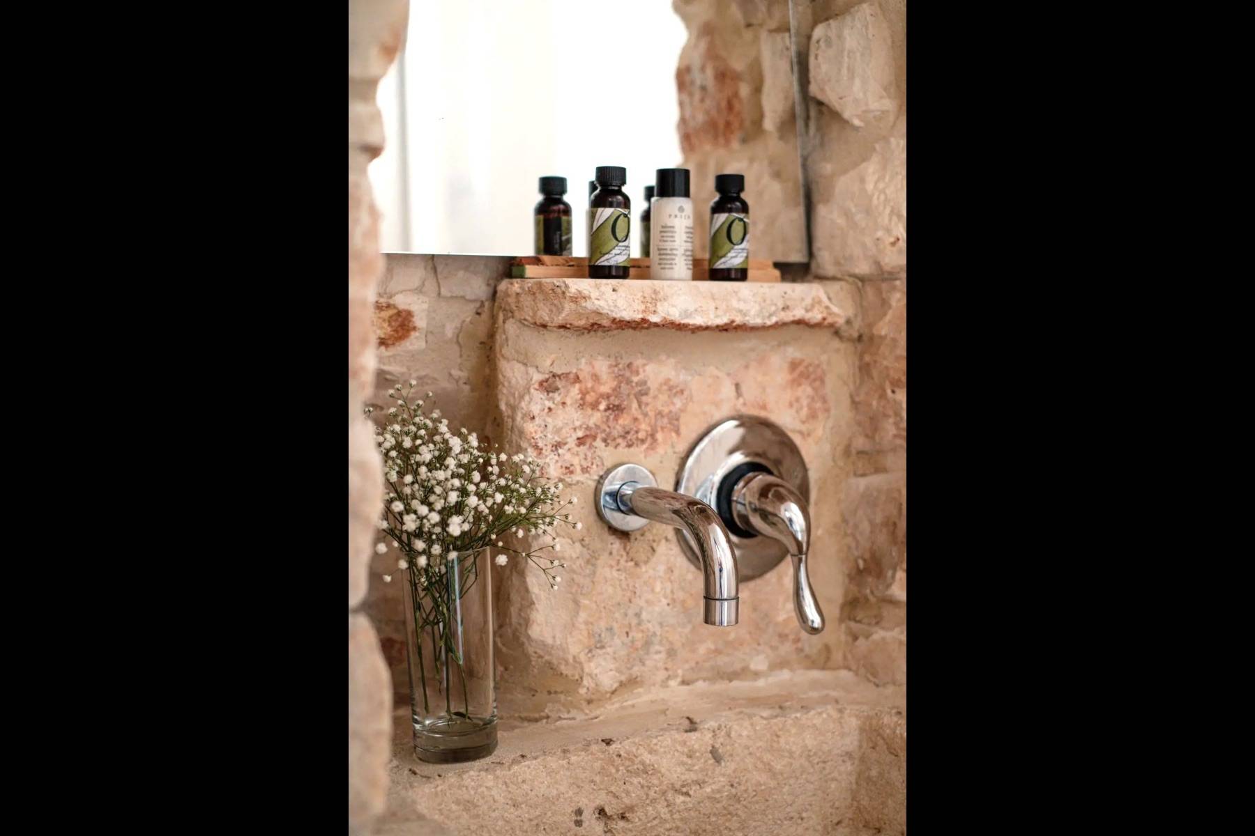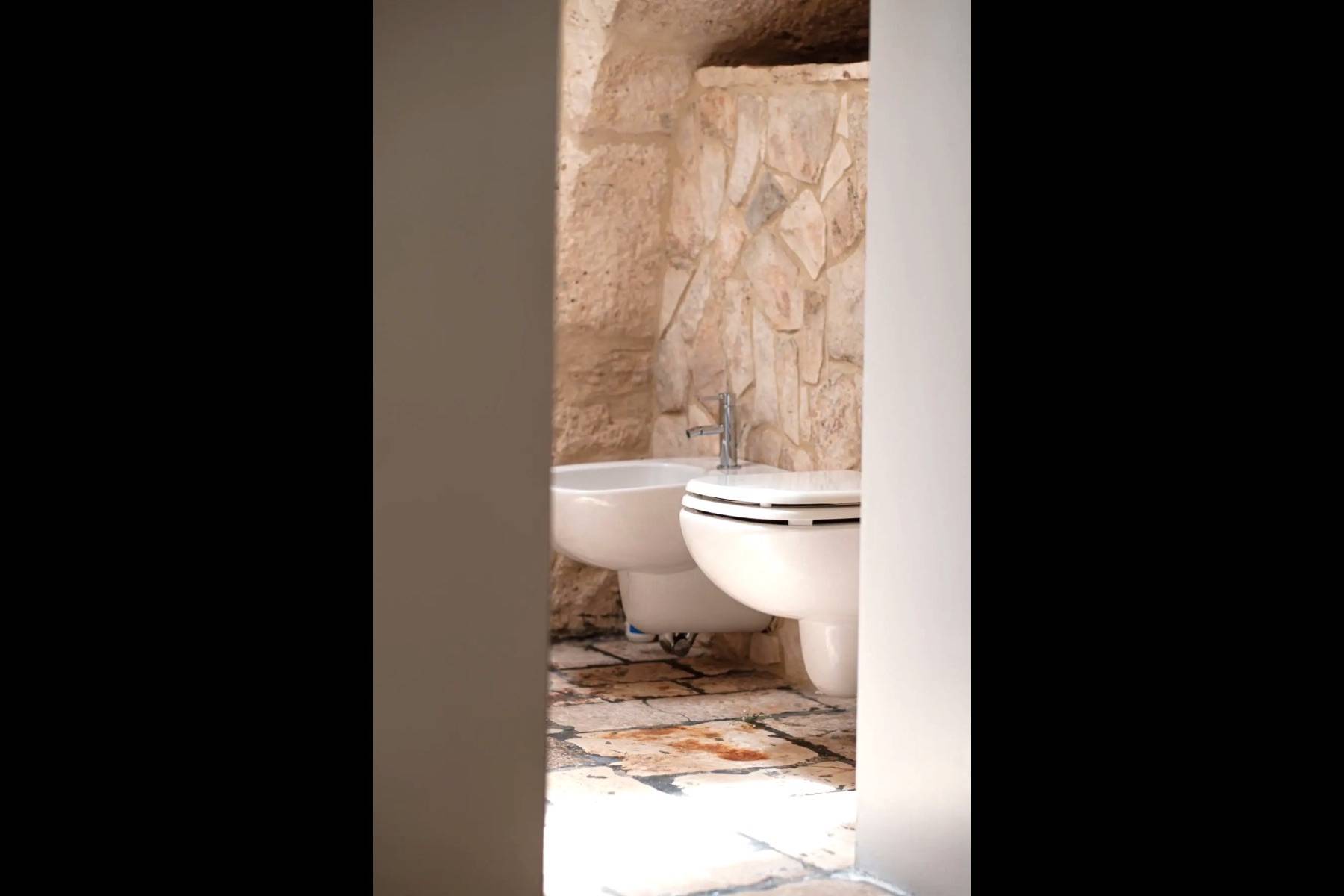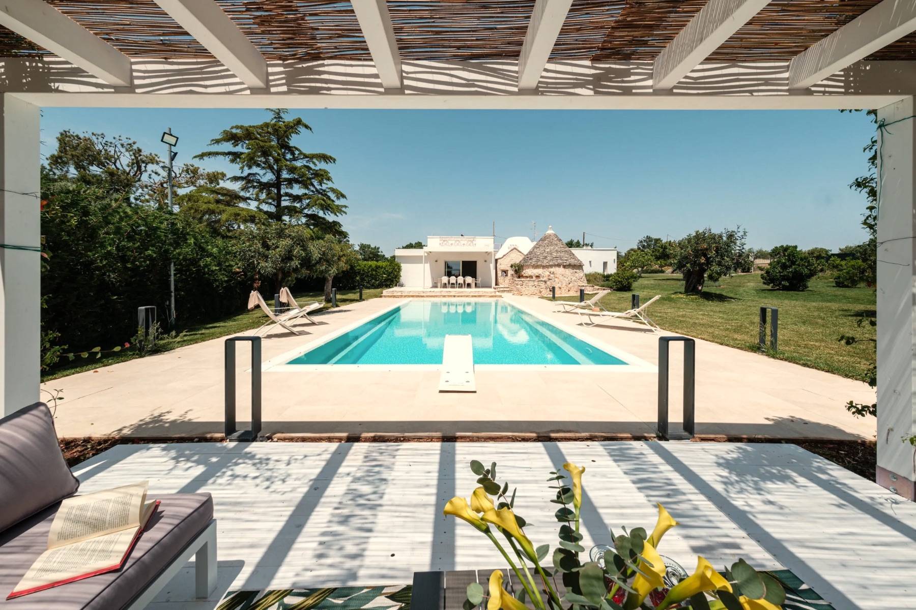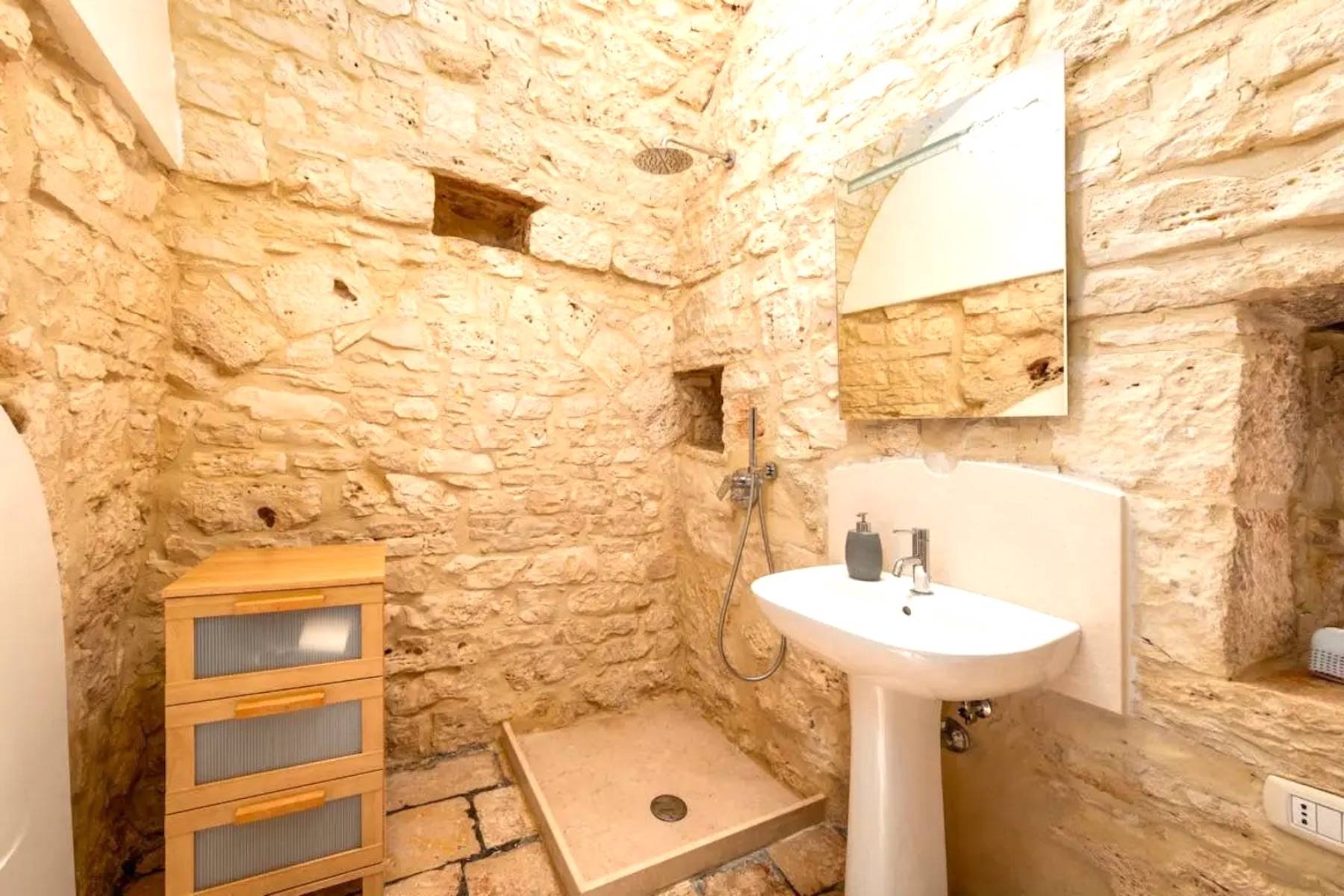 Der Trulli Paolino verfügt über ein zentrales Gebäude und einen Trullo. Der zentrale Teil besteht aus dem großen Wohnzimmer mit offener Küche und zeichnet sich durch große Fenster mit Blick auf den Pool und den umliegenden Rasen aus. Der große Kamin dominiert den Raum und verleiht ihm einen modernen Touch, der auch durch die Designerlampen und die Stahlküche unterstrichen wird. Von hier aus gelangt man in den Flur, der einen in die Vergangenheit zurückversetzt: Ein typischer Trullo mit freiliegenden Steinen bietet Zugang zu einem modernen Schlafzimmer mit Doppelbett und eigenem Bad mit Dusche und großem Fenster mit Blick auf den Rasen, einem traditionellen Schlafzimmer, das aus einem Trullo herausgearbeitet wurde, und einem weiteren Bad, das ebenfalls in den Trullo eingebaut wurde, ein kleiner Raum wird als Abstellraum genutzt. Vom Wohnzimmer aus gelangt man über die möblierte Terrasse, die mit einem großen Tisch für Mahlzeiten im Freien ausgestattet ist, in den Poolbereich.