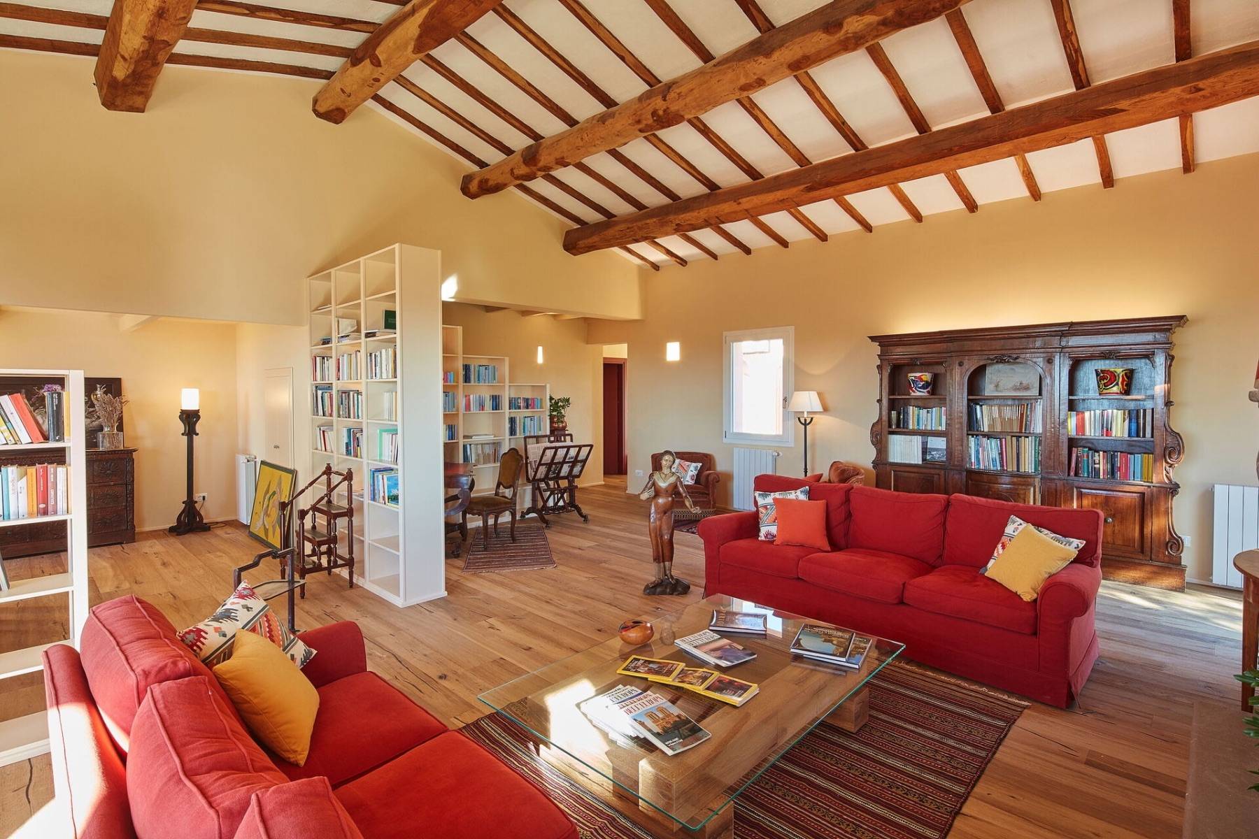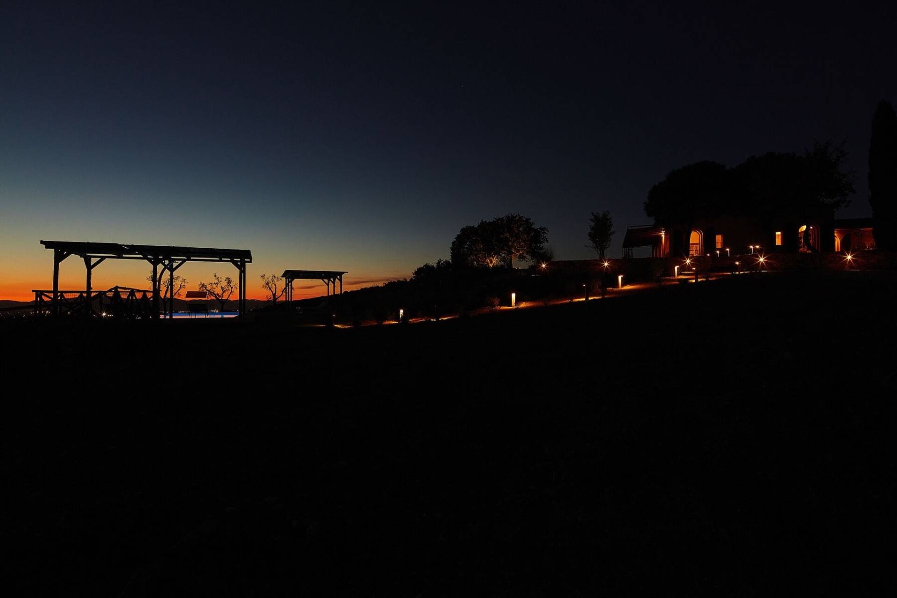 Im Aussenbereich erwartet Sie der 14 m lange private Swimmingpool und große überdachten Terrassen. Besonders schön sind die roten Sonnenuntergänge und die Abendbeleuchtung der Ferienvilla, die den perfekten Rückzugsort in einer der unberührtesten Gegenden der Toskana bietet.