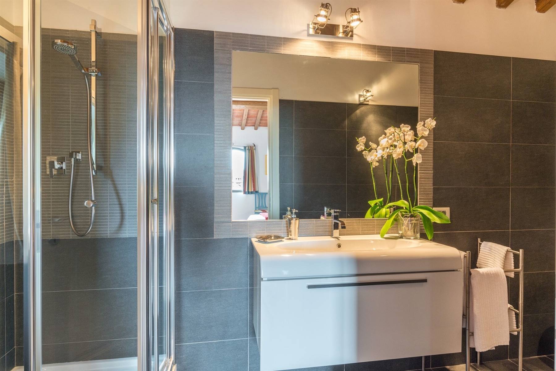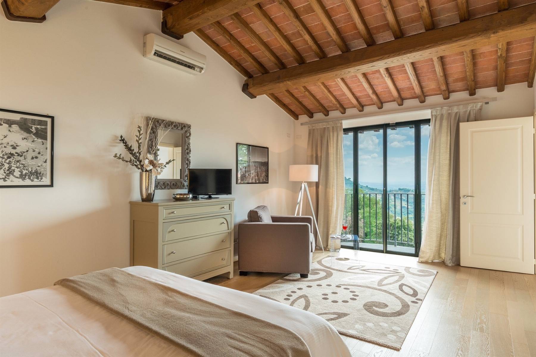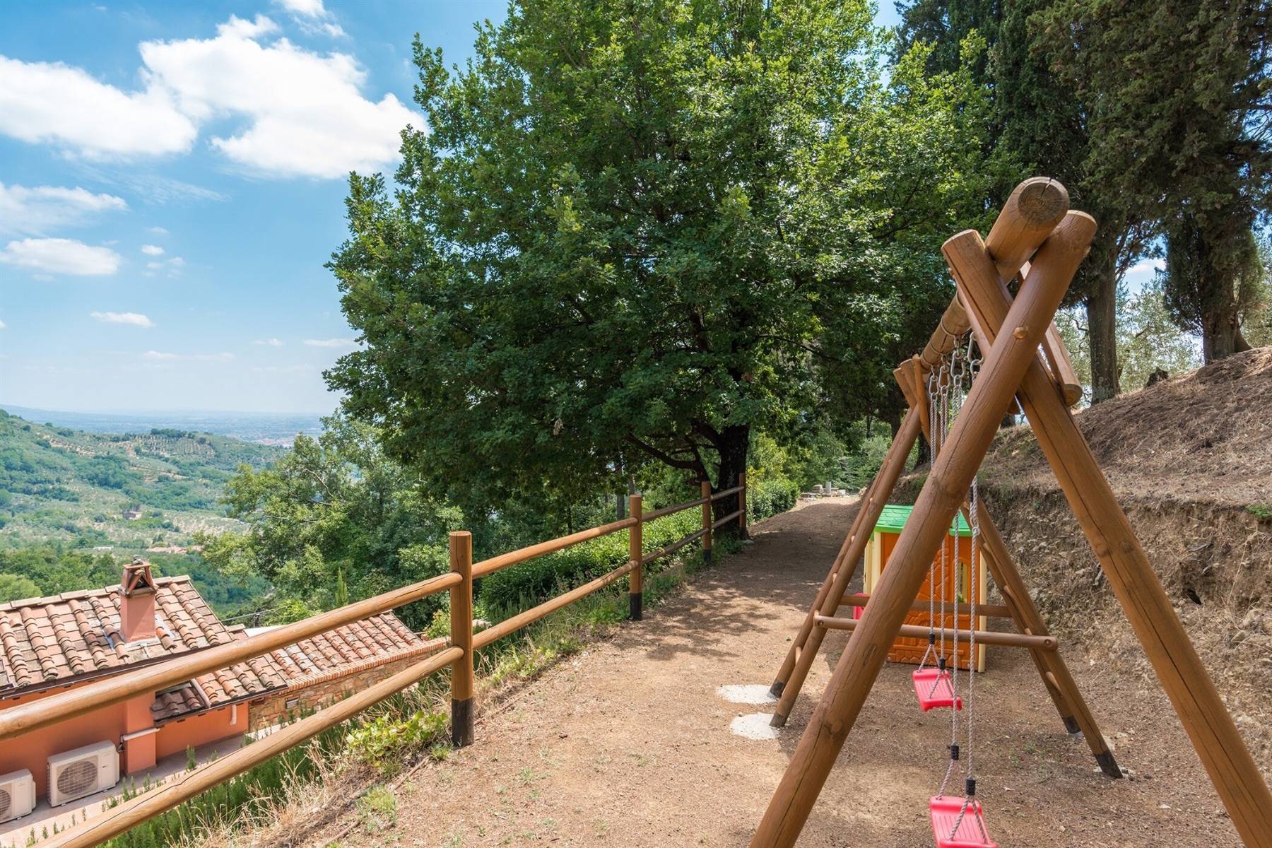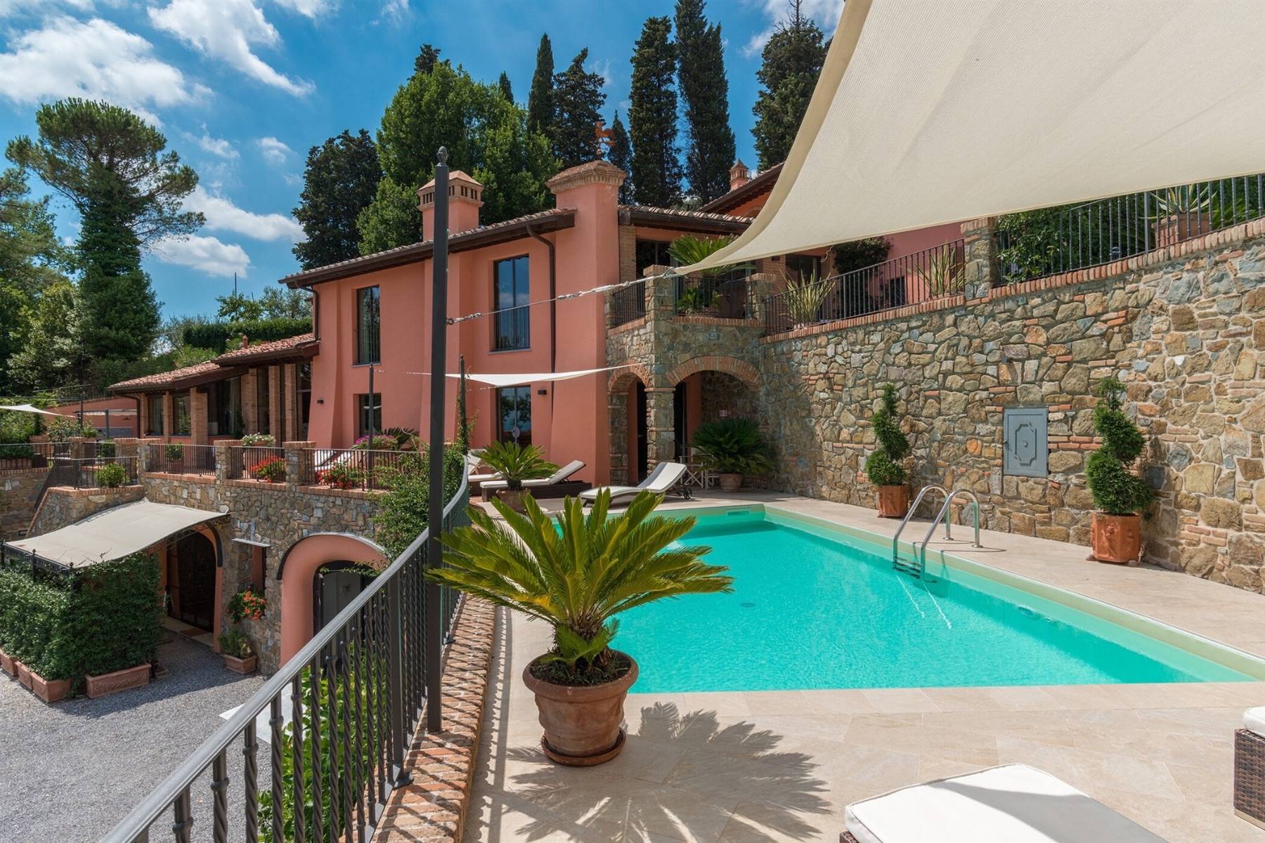 Der beheizbare Pool der Villa ist nach Süden ausgerichtet und blickt auf die schöne Hügellandschaft, die sich vom Garten bis zur Ebene bei Montecatini Terme erstreckt. Es befindet sich auf der gleichen Ebene wie das Erdgeschoss, entlang einer langen mit Terrakotta gepflasterten Fläche, die vor dem Haus beginnt und über französische Fenster vom Wohnzimmer aus zugänglich ist. Der Pool hat zwei geschwungene Seiten, ist mit PVC ausgekleidet und misst 4 x 8 m bei einer konstanten Tiefe von 1,40 m. Es gibt eine Metallleiter für den Zugang ins Wasser; Der Pool ist Chlor basiert. Der Poolbereich wird von sandfarbenen Steinplatten gesäumt und ist mit stilvollen Sonnenliegen, Tischen, einem Sonnensegel und einer Warm- und Kaltwasserdusche ausgestattet.